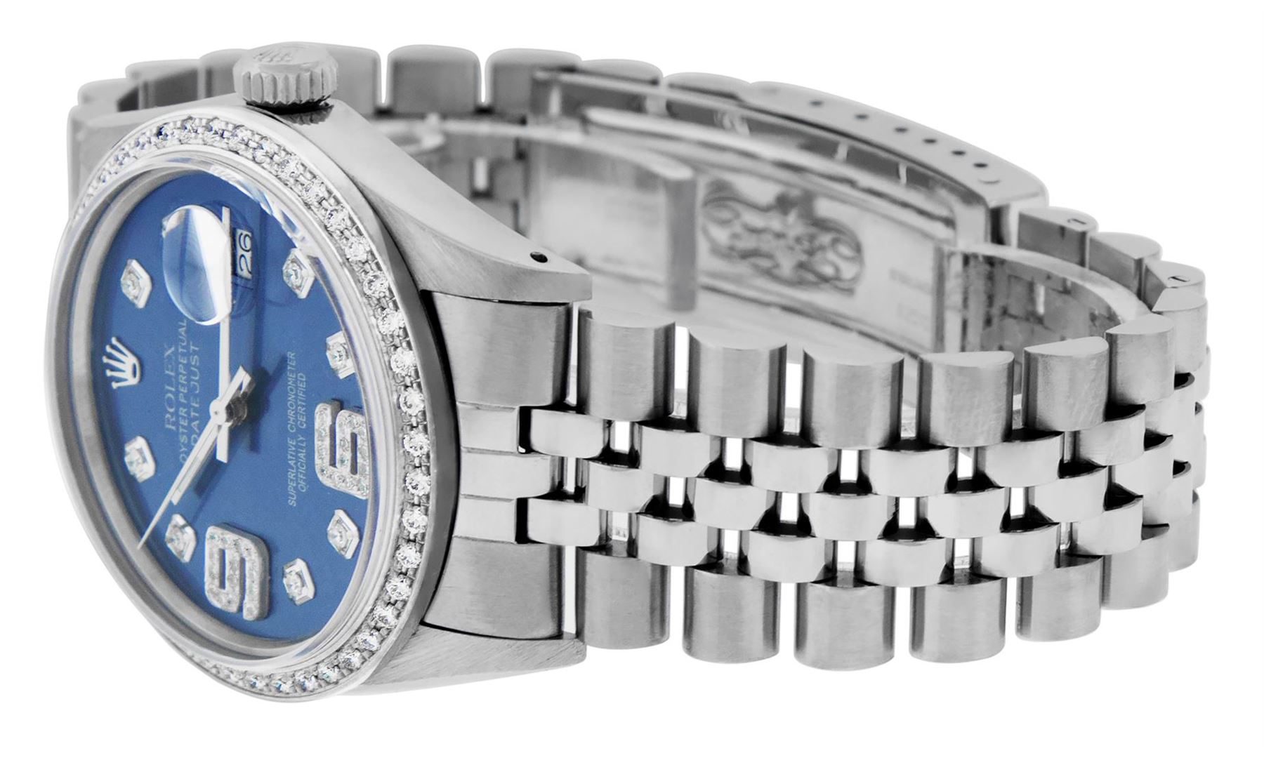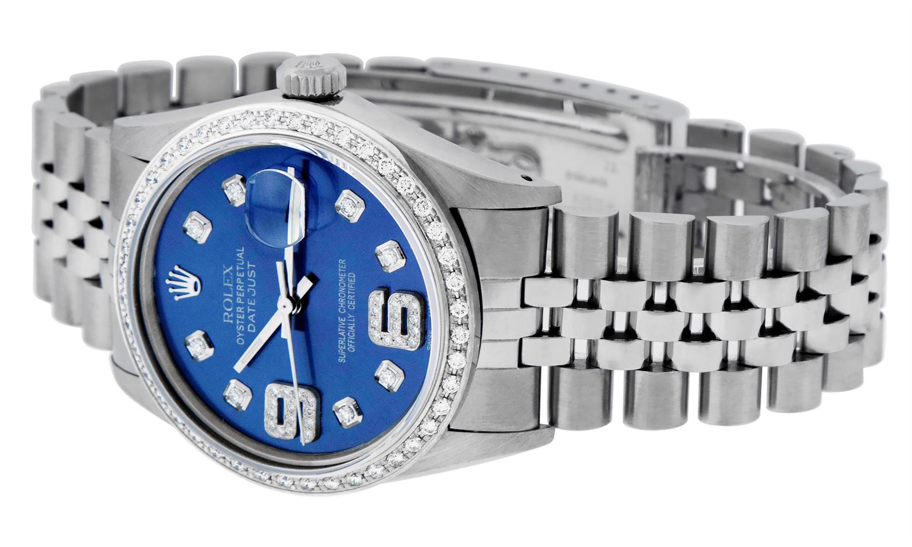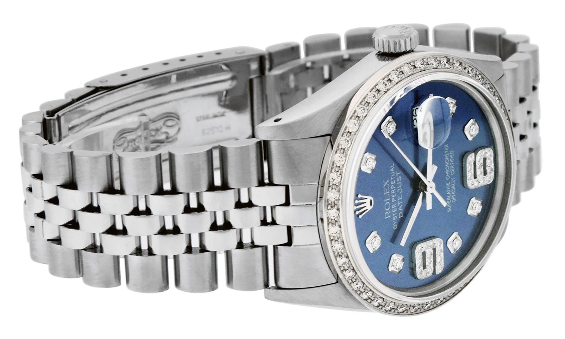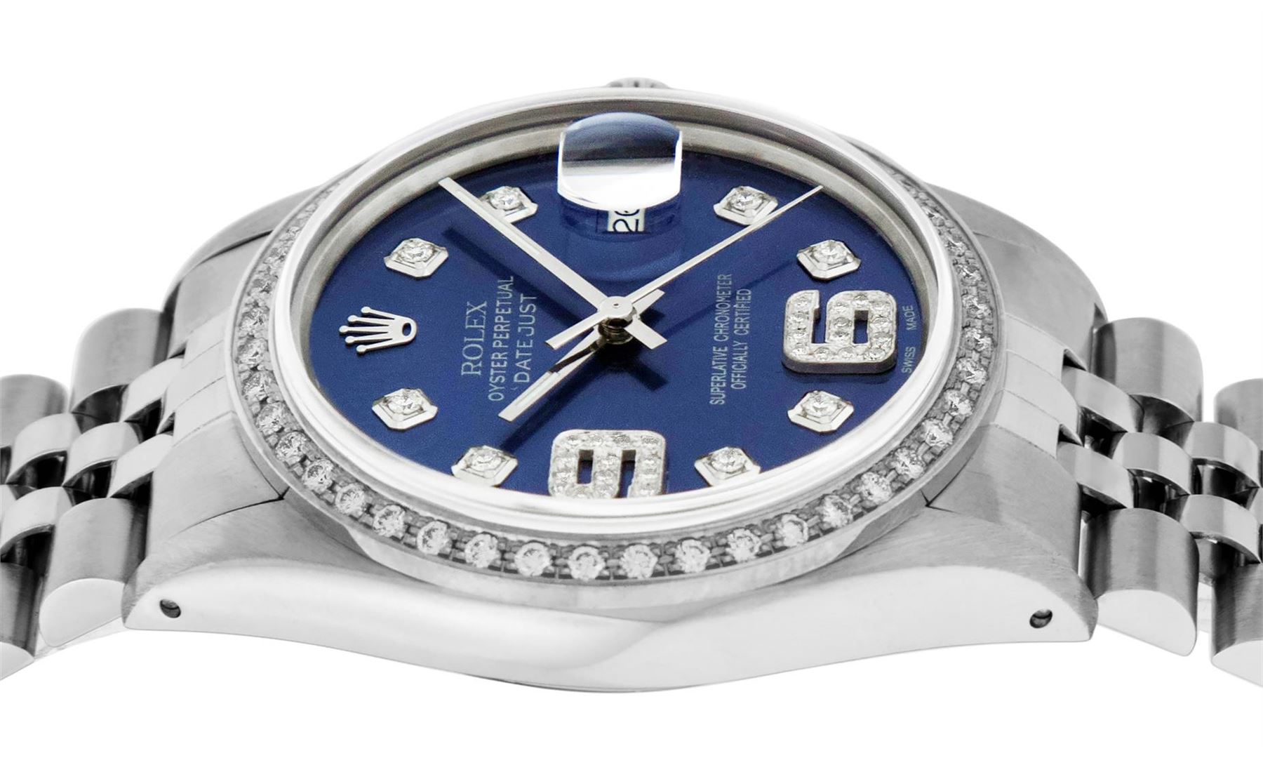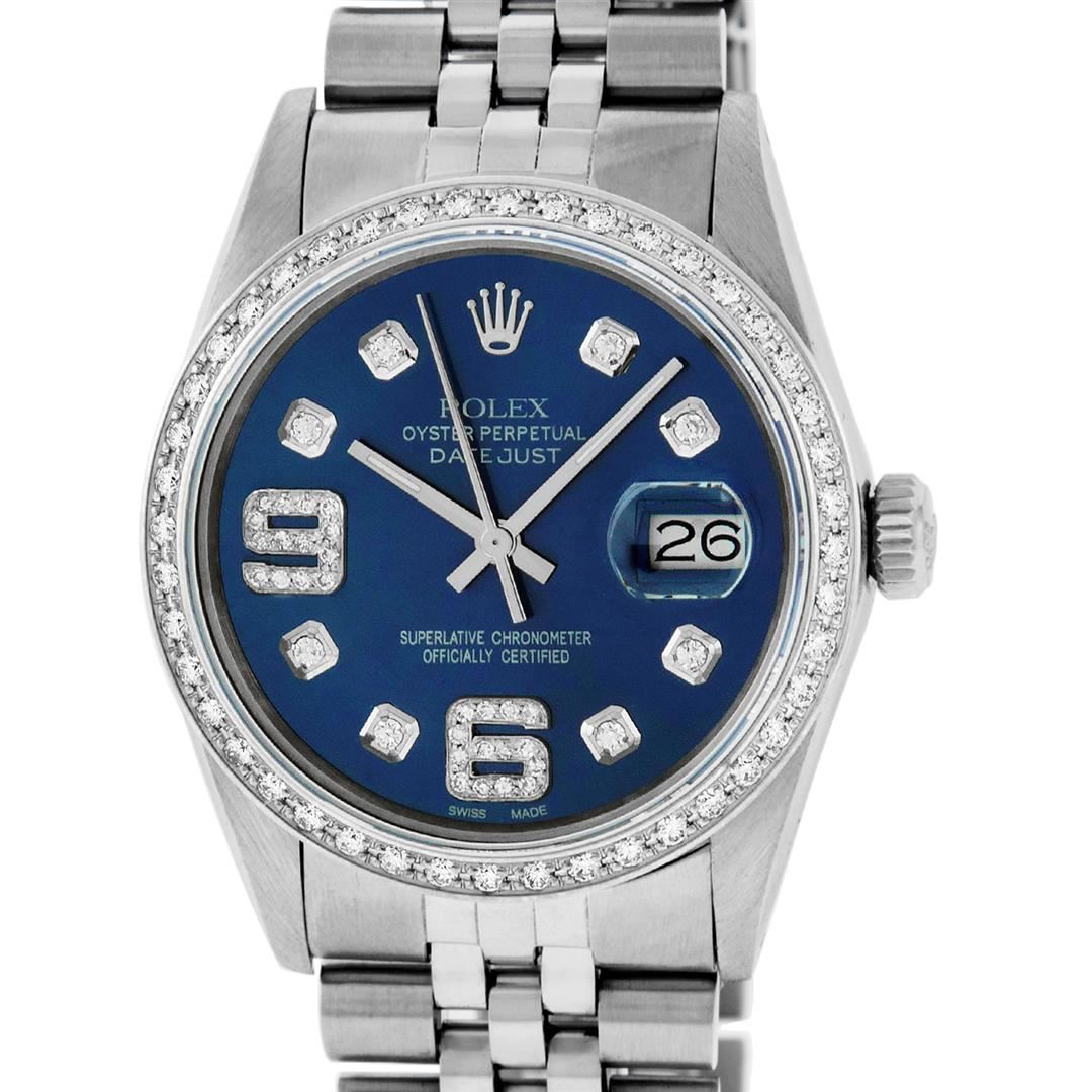 One Mens Stainless Steel Rolex Datejust Polished, Serviced & Electronically Tested, Stainless Steel Case: 36mm, Stainless Steel Crown, Custom Bezel: New 18K White Gold Beadset Diamond Bezel, Diamond Count: 44 Diamonds, Total Weight 1.00 Carat, Clarity: SI-VS, Color: G to H. Custom Crystal: New Scratch Resistant Synthetic Sapphire Cyclops Lens. Custom Hands: New Luminescent Hands. Movement: Automatic Winding Movement Caliber 3035. Custom Dial: Blue Diamond Dial with 9 & 6 Diamond Hour Markers, Diamond Count: 8 Diamonds + 28 Diamonds On 6 & 9 Hour Markers, G To H In Color, Clarity: SI-VS. Date Window: 3 O'Clock Position Date Display, Quickset, Model: Datejust. Condition: G-6 Extra Fine. Bracelet: Stainless Steel Jubilee Band. Bright Polish & Satin Finish. 7.0 Inch Length, Adjustable. Standard Clasp, With Rolex Logo. This Watch Has Been Serviced Time Tested And Is In Excellent Condition It Is Free Of All Scratches And Dents