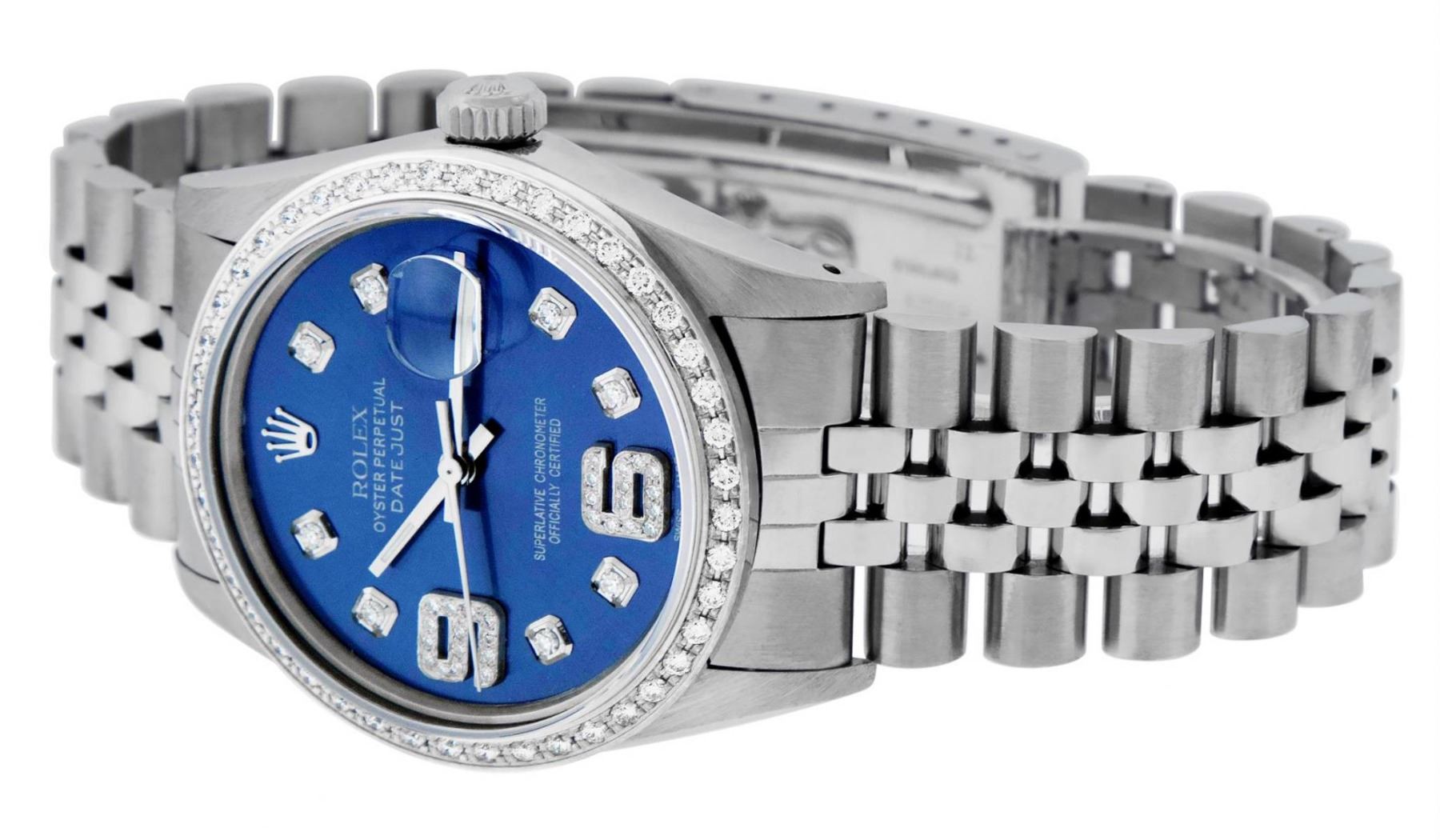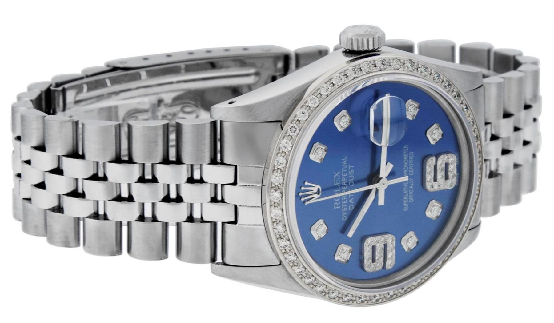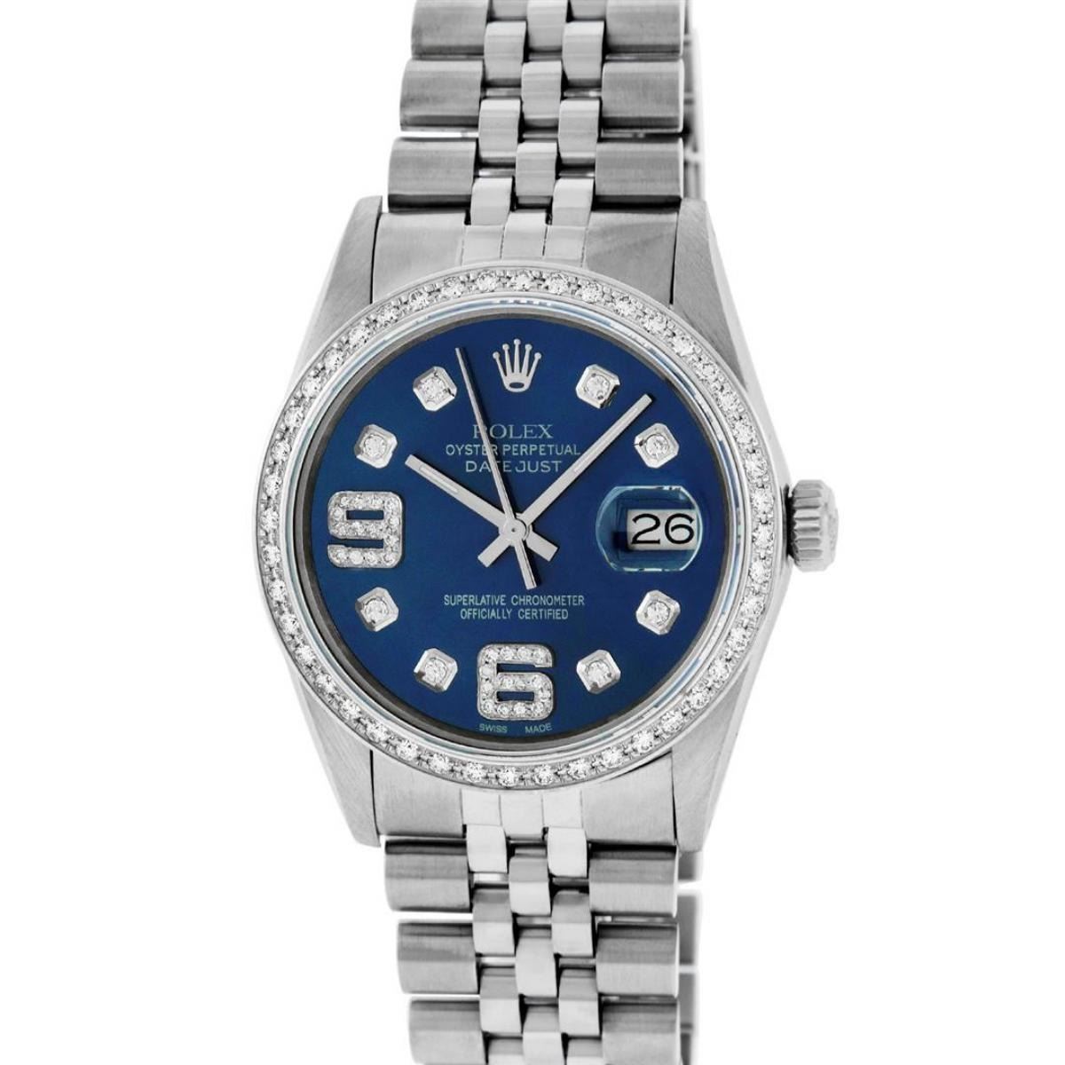 One Mens Stainless Steel Rolex Datejust Polished, Serviced & Electronically Tested, Stainless Steel Case: 36mm, Stainless Steel Crown, Custom Bezel: New 18K White Gold Beadset Diamond Bezel, Diamond Count: 44 Diamonds, Total Weight 1.00 Carat, Clarity: SI-VS, Color: G to H. Custom Crystal: New Scratch Resistant Synthetic Sapphire Cyclops Lens. Custom Hands: New Luminescent Hands. Movement: Automatic Winding Movement Caliber 3035. Custom Dial: Blue Diamond Dial with 9 & 6 Diamond Hour Markers, Diamond Count: 8 Diamonds + 28 Diamonds On 6 & 9 Hour Markers, G To H In Color, Clarity: SI-VS. Date Window: 3 O'Clock Position Date Display, Quickset, Model: Datejust. Condition: G-6 Extra Fine. Bracelet: Stainless Steel Jubilee Band. Bright Polish & Satin Finish. 7.0 Inch Length, Adjustable. Standard Clasp, With Rolex Logo. This Watch Has Been Serviced Time Tested And Is In Excellent Condition It Is Free Of All Scratches And Dents