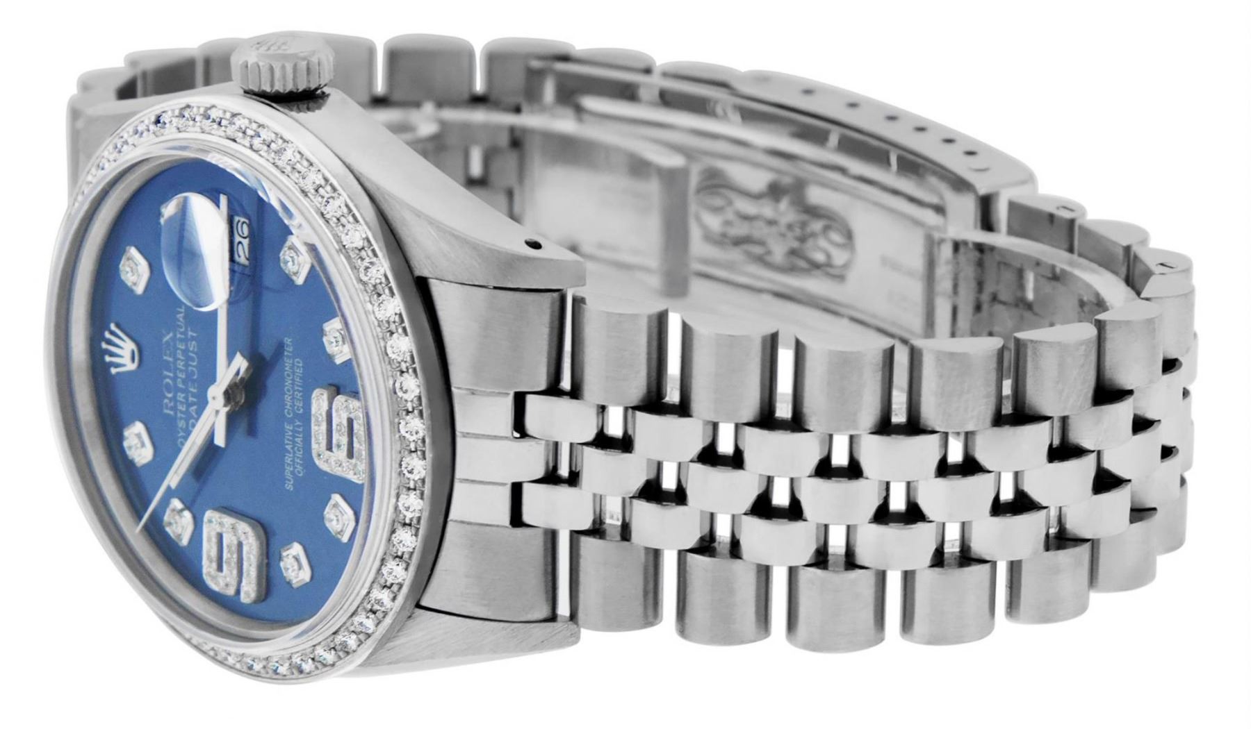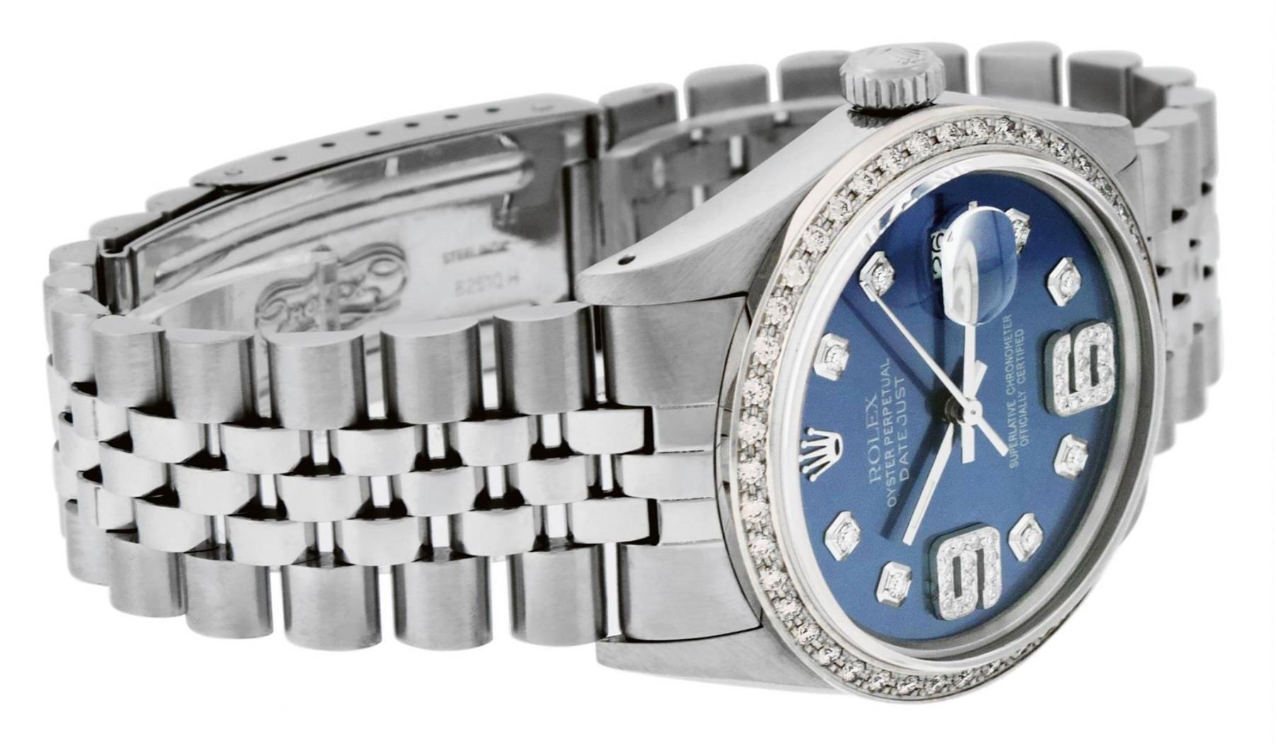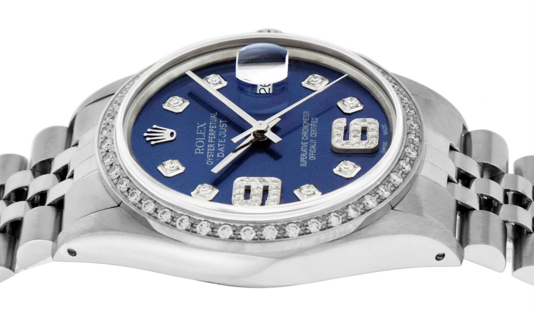 One Mens Stainless Steel Rolex Datejust Polished, Serviced & Electronically Tested, Stainless Steel Case: 36mm, Stainless Steel Crown, Custom Bezel: New 18K White Gold Beadset Diamond Bezel, Diamond Count: 44 Diamonds, Total Weight 1.00 Carat, Clarity: SI-VS, Color: G to H. Custom Crystal: New Scratch Resistant Synthetic Sapphire Cyclops Lens. Custom Hands: New Luminescent Hands. Movement: Automatic Winding Movement Caliber 3035. Custom Dial: Blue Diamond Dial with 9 & 6 Diamond Hour Markers, Diamond Count: 8 Diamonds + 28 Diamonds On 6 & 9 Hour Markers, G To H In Color, Clarity: SI-VS. Date Window: 3 O'Clock Position Date Display, Quickset, Model: Datejust. Condition: G-6 Extra Fine. Bracelet: Stainless Steel Jubilee Band. Bright Polish & Satin Finish. 7.0 Inch Length, Adjustable. Standard Clasp, With Rolex Logo. This Watch Has Been Serviced Time Tested And Is In Excellent Condition It Is Free Of All Scratches And Dents