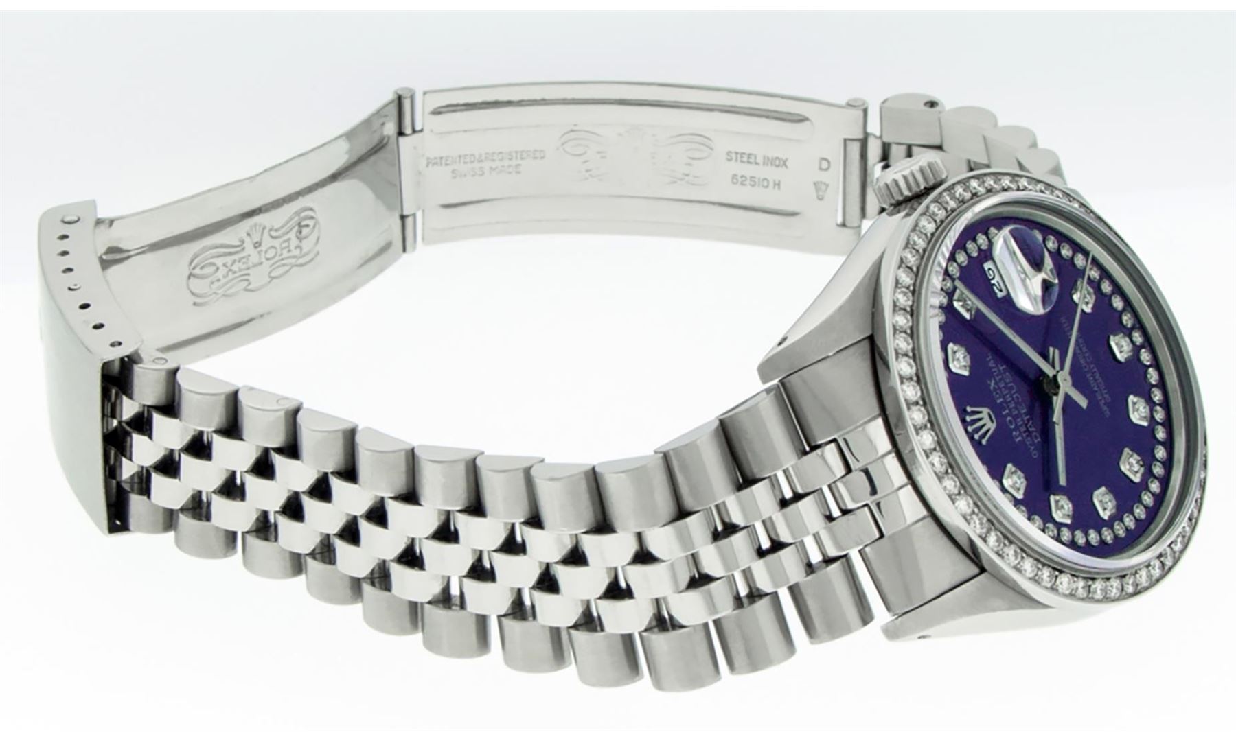One Mens Pre Owned Rolex Stainless Steel Datejust Polished Bright with Satin Finish, Stainless Steel Case: 36mm, Stainless Steel Crown, Custom Bezel: New Stainless Steel Beadset Diamond Bezel, Diamond Count: 54 Diamonds. Custom Crystal: New Sapphire With Magnified Date Window. Custom Hands: New Luminescent Hands. Rolex Movement: Automatic Winding Movement 3035. Custom Dial: Custom Blue Diamond Dial, Diamond Count: 58 Diamonds On Dial. Date Window: 3 O'Clock Position Date Display, Quickset, Model: Datejust. Condition: G-6 Extra Fine. Rolex Bracelet: Stainless Steel Jubilee Band. Bright Polish And Satin Finish. 7.0 Inch Length, Adjustable. Standard Clasp, With Rolex Logo. This Watch Has Been Serviced Time Tested And Is In Excellent Condition It Is Free Of All Scratches And Dents.