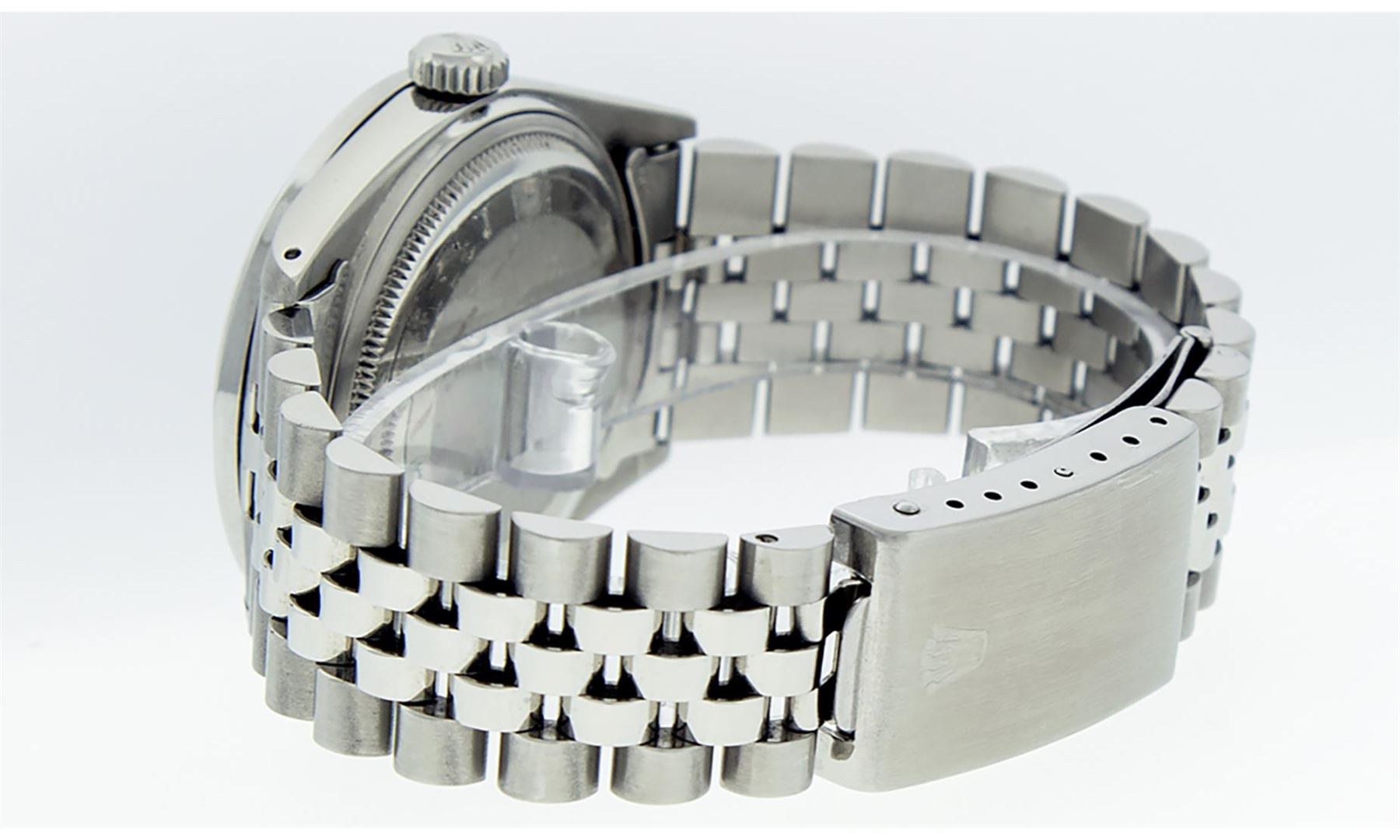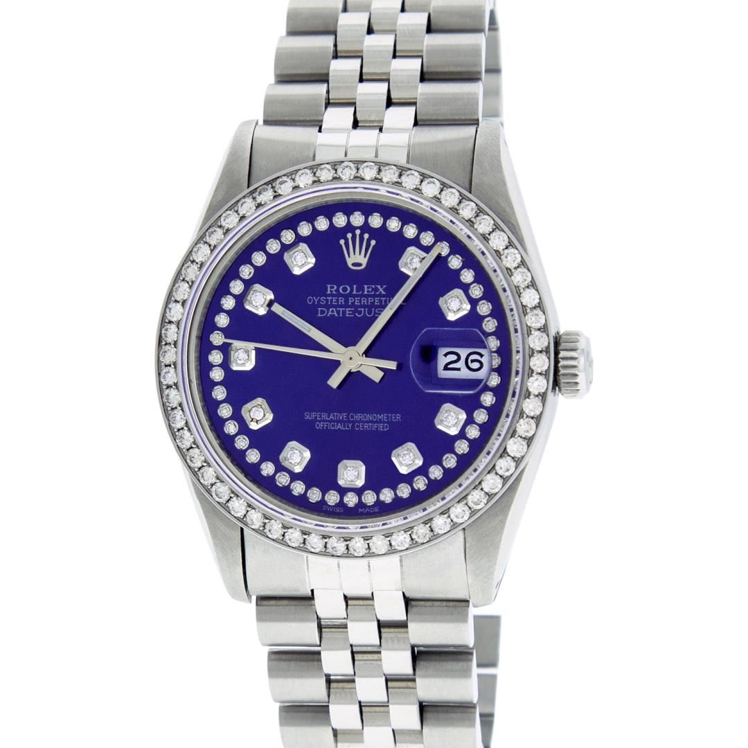 One Mens Pre Owned Rolex Stainless Steel Datejust Polished Bright with Satin Finish, Stainless Steel Case: 36mm, Stainless Steel Crown, Custom Bezel: New Stainless Steel Beadset Diamond Bezel, Diamond Count: 54 Diamonds. Custom Crystal: New Sapphire With Magnified Date Window. Custom Hands: New Luminescent Hands. Rolex Movement: Automatic Winding Movement 3035. Custom Dial: Custom Blue Diamond Dial, Diamond Count: 58 Diamonds On Dial. Date Window: 3 O'Clock Position Date Display, Quickset, Model: Datejust. Condition: G-6 Extra Fine. Rolex Bracelet: Stainless Steel Jubilee Band. Bright Polish And Satin Finish. 7.0 Inch Length, Adjustable. Standard Clasp, With Rolex Logo. This Watch Has Been Serviced Time Tested And Is In Excellent Condition It Is Free Of All Scratches And Dents.