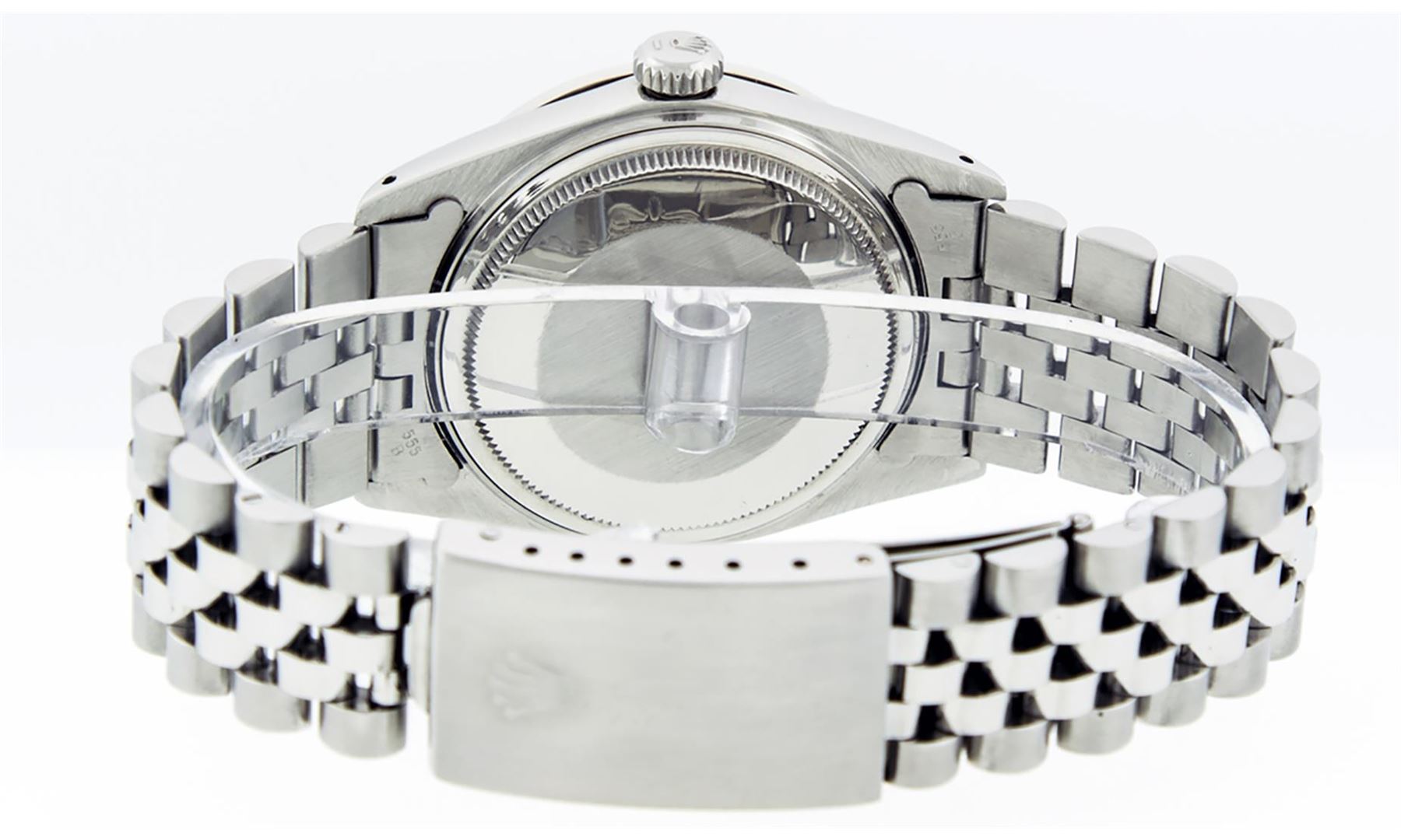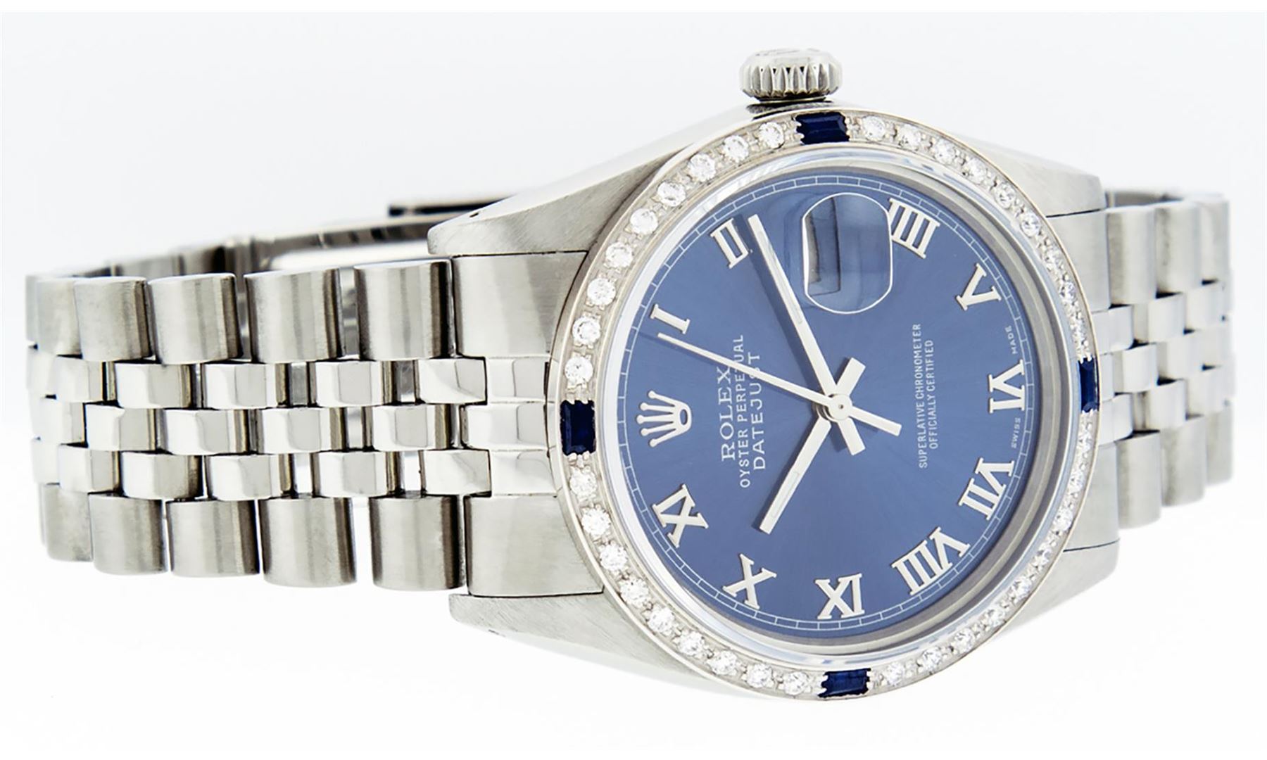 One Mens Stainless Steel Rolex Datejust Polished Bright with Satin Finish, This Watch Has Been Serviced & Electronically Tested, Stainless Steel Case: 36mm, Stainless Steel Crown, Custom Bezel: New 18K White Gold Sapphire Beadset Diamond Bezel, Diamond + Gem Count: 36 Diamonds + 4 Sapphires, Total Weight 1.00 Carat, Clarity: SI-VS, Color: G to H. Custom Crystal: New Synthetic Sapphire Cyclops Lens. Custom Hands: New Luminescent Hands. Movement: Automatic Winding Movement Caliber 3035. Custom Dial: Blue Roman With Square Track. Date Window: 3 O'Clock Position Date Display, Quickset, Model: Datejust, Condition: G-6 Extra Fine. Bracelet: Stainless Steel Jubilee. Bracelet: 7.0 Inch Length, Adjustable. Standard Clasp, With Rolex Logo. This Watch Has Been Serviced Time Tested And Is In Excellent Condition It Is Free Of All Scratches And Dents.