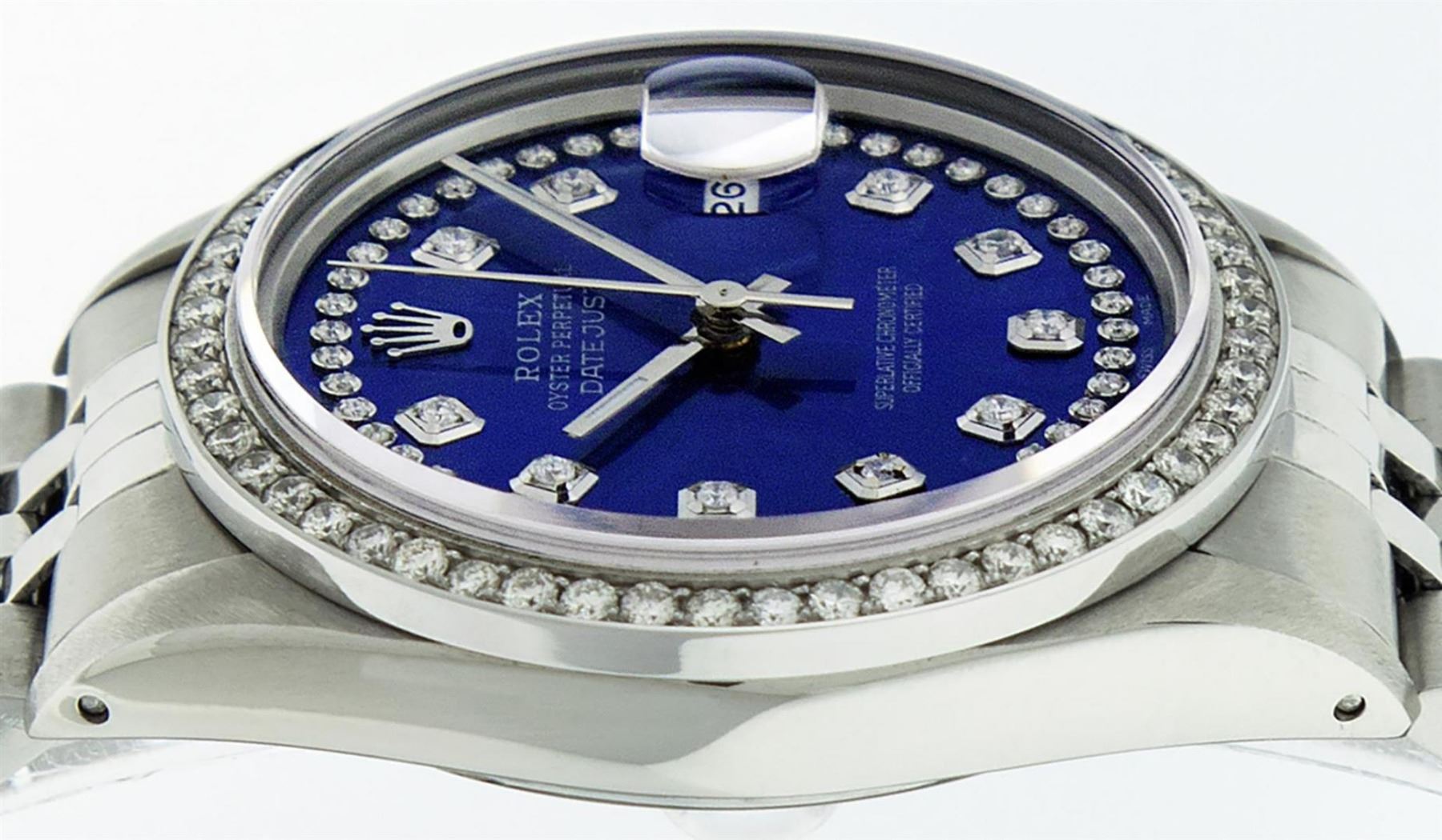One Mens Rolex Stainless Steel Datejust Polished Bright with Satin Finish, This Watch Has Been Serviced & Electronically Tested, Stainless Steel Case: 36mm, Stainless Steel Crown, Custom Bezel: New Stainless Steel Beadset Diamond Bezel, Diamond Count: 54 Diamonds, Total Weight 1.00 Carat, Clarity: SI-VS, Color: G to H. Custom Crystal: New Synthetic Sapphire Cyclops Lens. Custom Hands: New Luminescent Hands. Movement: Automatic Winding Movement Caliber 3035. Custom Dial: Blue String Diamond Dial, Diamond Count: 58 Diamonds In Dial, Color: G to H, Clarity: VS2-SI1. Date Window: 3 O'Clock Position Date Display, Quickset, Model: Datejust. Condition: G-6 Extra Fine. Bracelet: Stainless Steel Jubilee Band. Bright Polish & Satin Finish. 7.0 Inch Length, Adjustable. Standard Clasp, With Rolex Logo. This Watch Has Been Serviced Time Tested And Is In Excellent Condition It Is Free Of All Scratches And Dents.