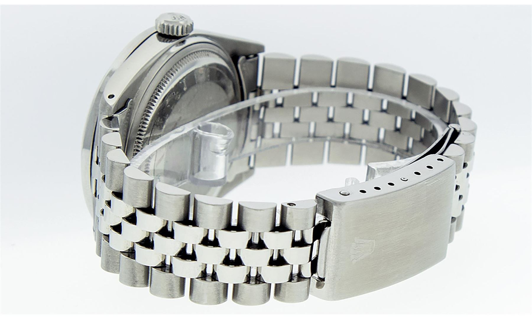 One Mens Pre Owned Rolex Stainless Steel Datejust Polished Bright with Satin Finish, This Watch Has Been Serviced & Electronically Tested, Stainless Steel Case: 36mm, Rolex Stainless Steel Crown, Custom Bezel: New Stainless Steel Beadset Diamond Bezel, Diamond Count: 54 Diamonds, Clarity: SI-VS, Color: G to H. Custom Crystal: New Sapphire With Magnified Date Window. Custom Hands: New Luminescent Hands. Rolex Movement: Automatic Winding Movement. Custom Dial: Refinished To Blue With Custom Added String Diamonds, Diamond Count: 58 Diamonds In Dial, Color: G to H, Clarity: VS2-SI1. Date Window: 3 O'Clock Position Date Display, Quickset, Model: Datejust. Condition: G-6 Extra Fine. Rolex Bracelet: Stainless Steel Jubilee Band. Bright Polish & Satin Finish. 7.0 Inch Length, Adjustable. Standard Clasp, With Rolex Logo. This Watch Has Been Serviced Time Tested And Is In Excellent Condition It Is Free Of All Scratches And Dents.