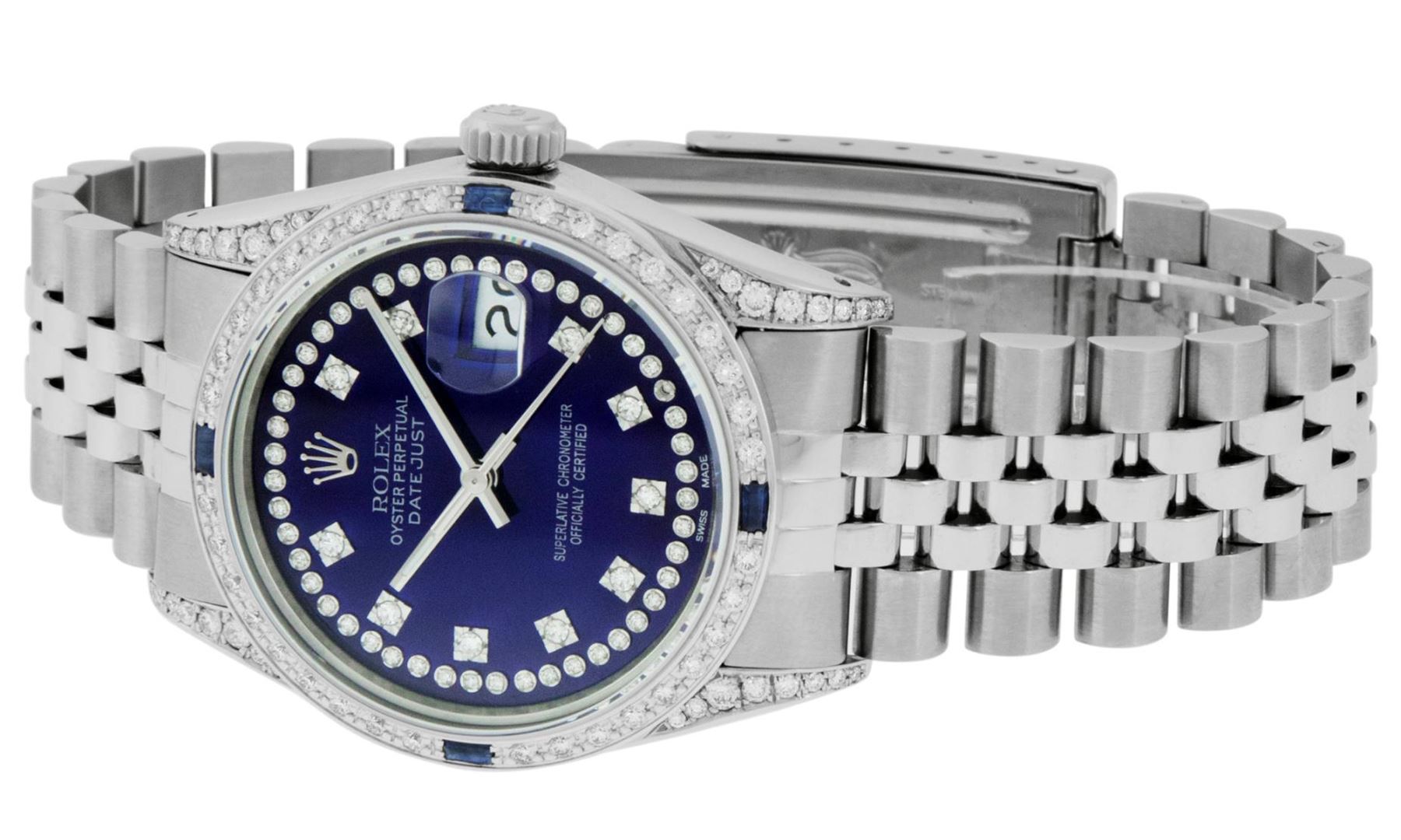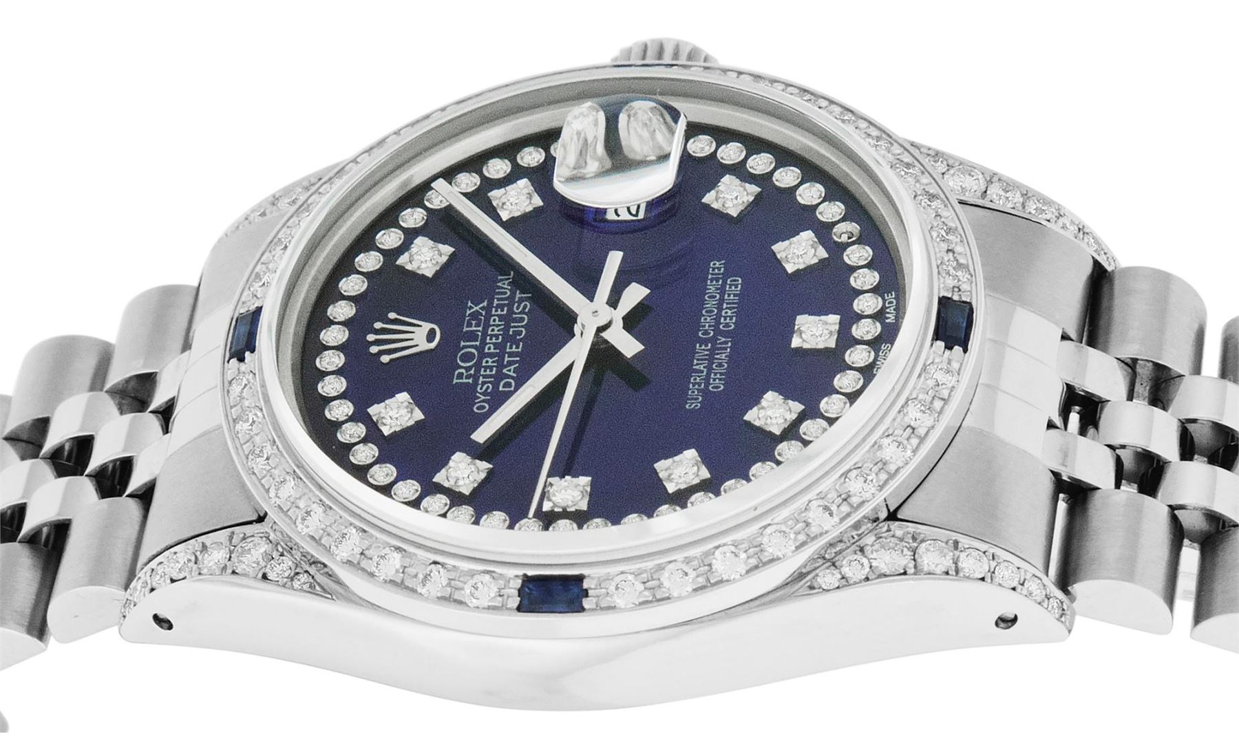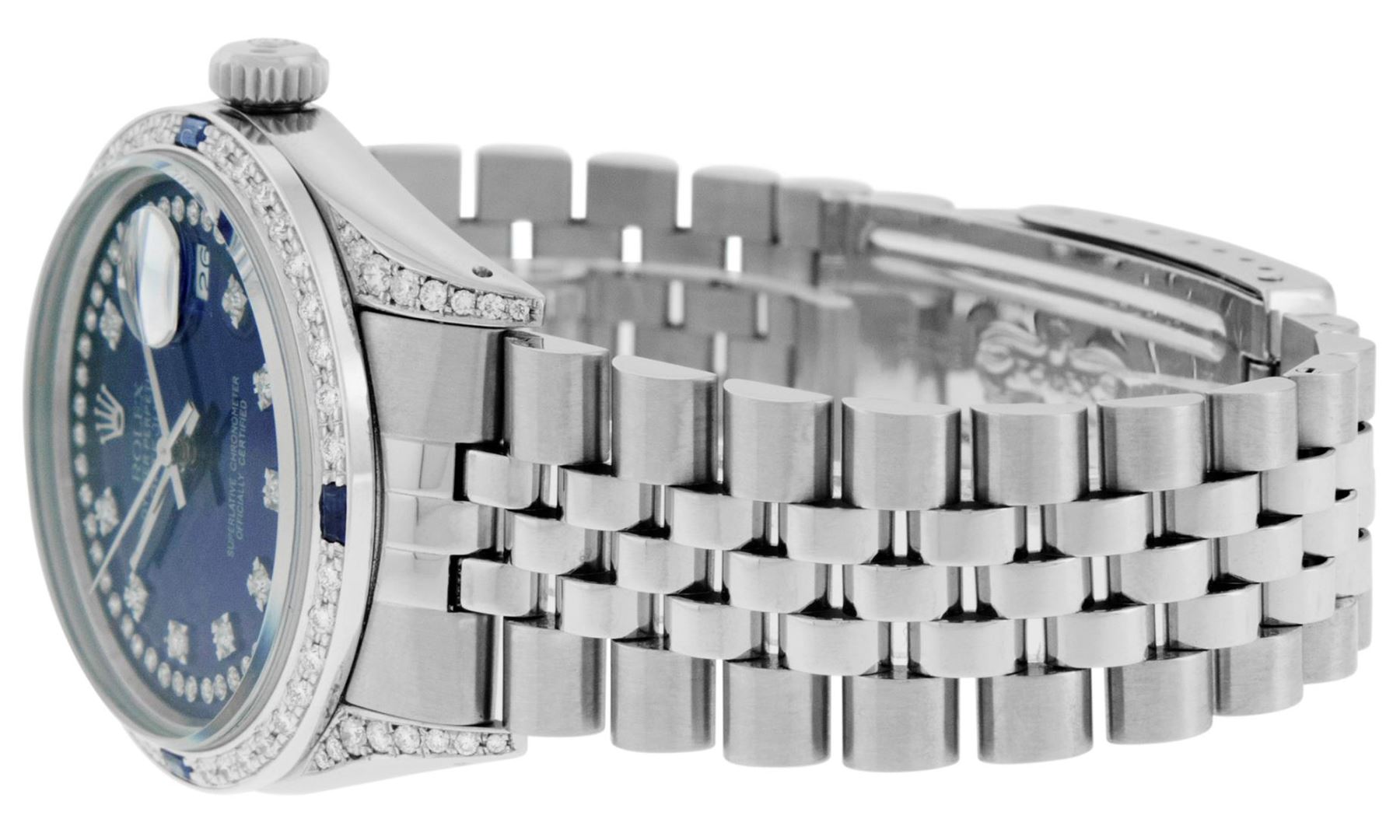 One Mens Pre Owned Rolex Datejust Polished Bright with Satin Finish, Serviced And Electronically Tested, Stainless Steel Case: 36mm, Custom Diamond Lugs: 28 Added Diamonds On Lugs. Stainless Steel Crown, Custom Bezel: 18K White Gold Diamond + Sapphire Beadset, Diamond Count: 36 Diamonds + 4 Sapphires. Custom Crystal: New Sapphire With Magnified Date Window. Custom Hands: New Luminescent Hands. Rolex Movement: Automatic Winding Movement 3035. Custom Dial: Custom Blue Dial With Added String Diamonds, Stone Count: 43 Diamonds On Dial. Date Window: 3 O'Clock Position Date Display, Quickset, Model: Quickset Datejust Condition: G-6 Extra Fine. Rolex Bracelet: Stainless Steel Jubilee Band. Bright Polish & Satin Finish. 7.0 Inch Length, Adjustable. Standard Clasp, With Rolex Logo. This Watch Has Been Serviced And Polished And Its Free Of All Dents And Scratches.