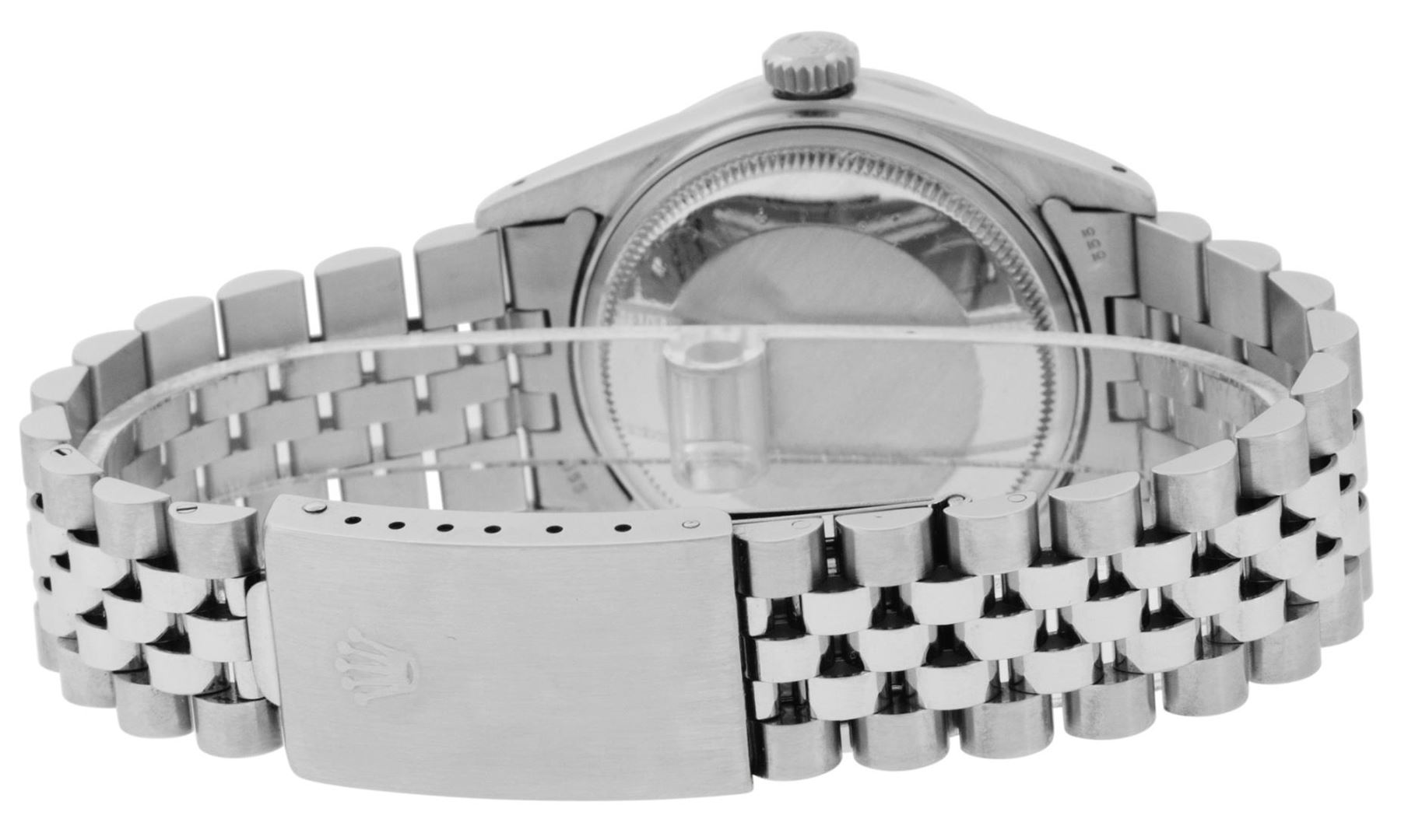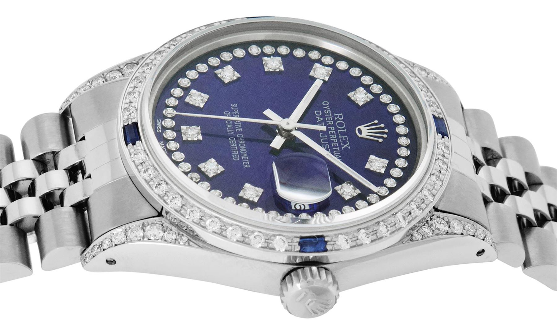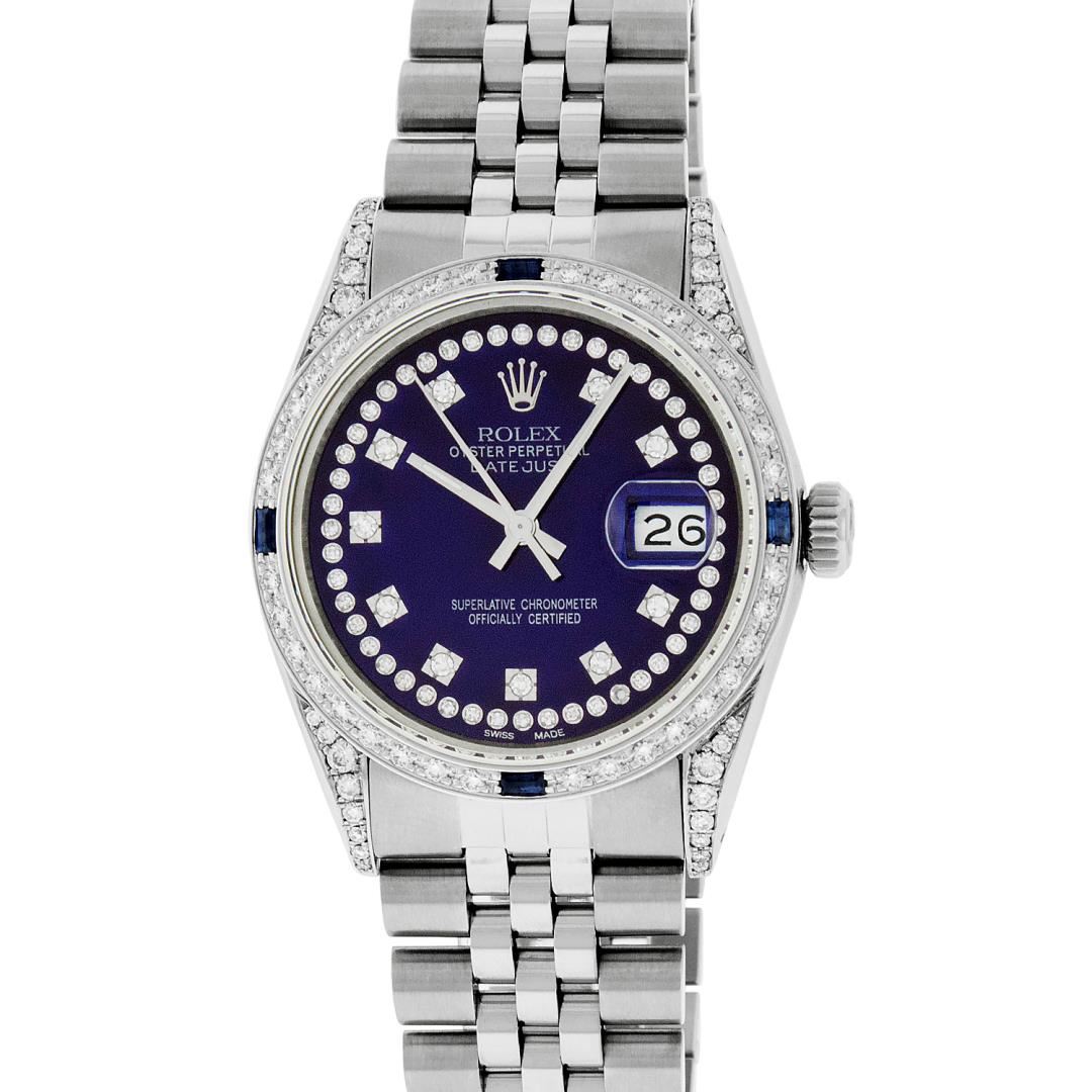 One Mens Pre Owned Rolex Datejust Polished Bright with Satin Finish, Serviced And Electronically Tested, Stainless Steel Case: 36mm, Custom Diamond Lugs: 28 Added Diamonds On Lugs. Stainless Steel Crown, Custom Bezel: 18K White Gold Diamond + Sapphire Beadset, Diamond Count: 36 Diamonds + 4 Sapphires. Custom Crystal: New Sapphire With Magnified Date Window. Custom Hands: New Luminescent Hands. Rolex Movement: Automatic Winding Movement 3035. Custom Dial: Custom Blue Dial With Added String Diamonds, Stone Count: 43 Diamonds On Dial. Date Window: 3 O'Clock Position Date Display, Quickset, Model: Quickset Datejust Condition: G-6 Extra Fine. Rolex Bracelet: Stainless Steel Jubilee Band. Bright Polish & Satin Finish. 7.0 Inch Length, Adjustable. Standard Clasp, With Rolex Logo. This Watch Has Been Serviced And Polished And Its Free Of All Dents And Scratches.