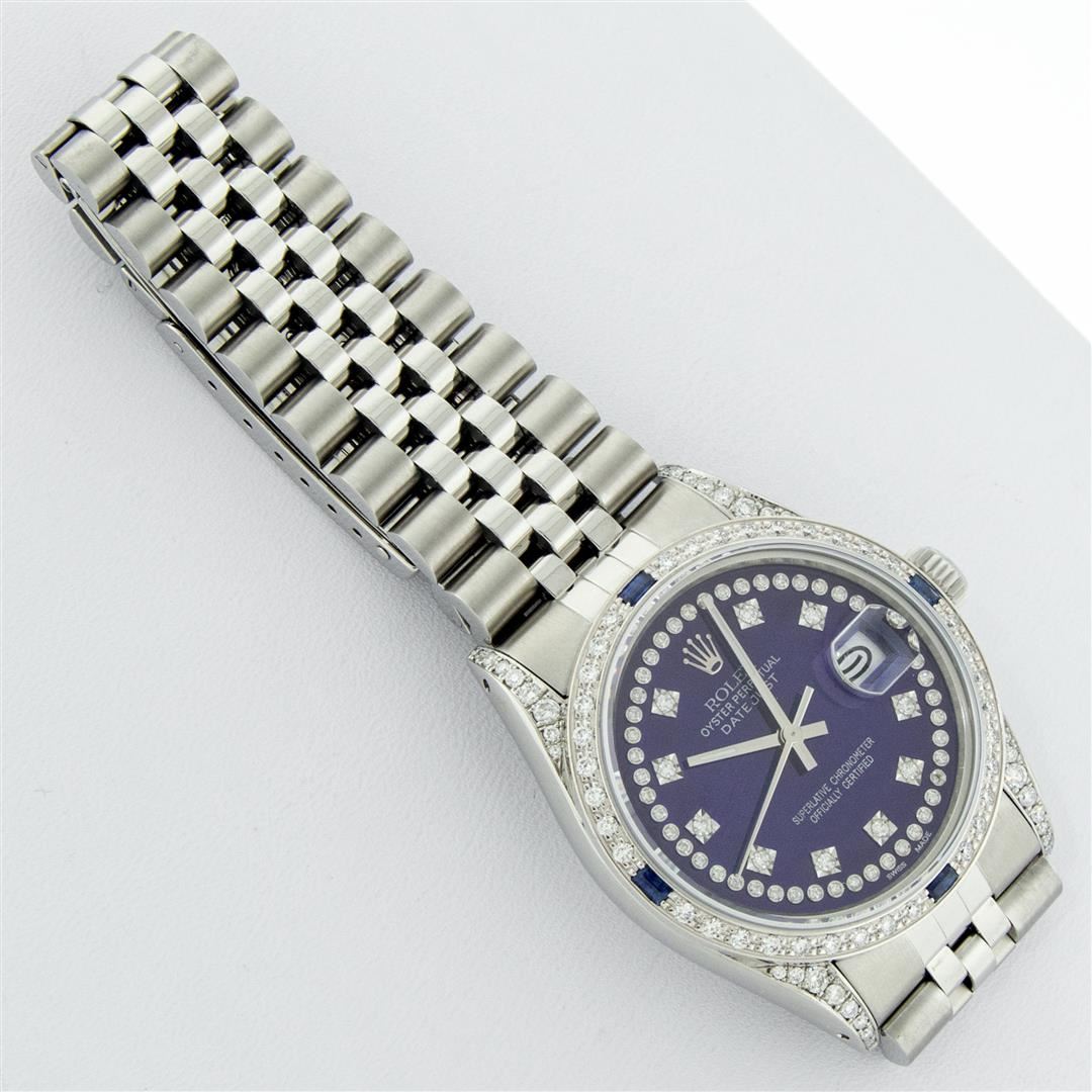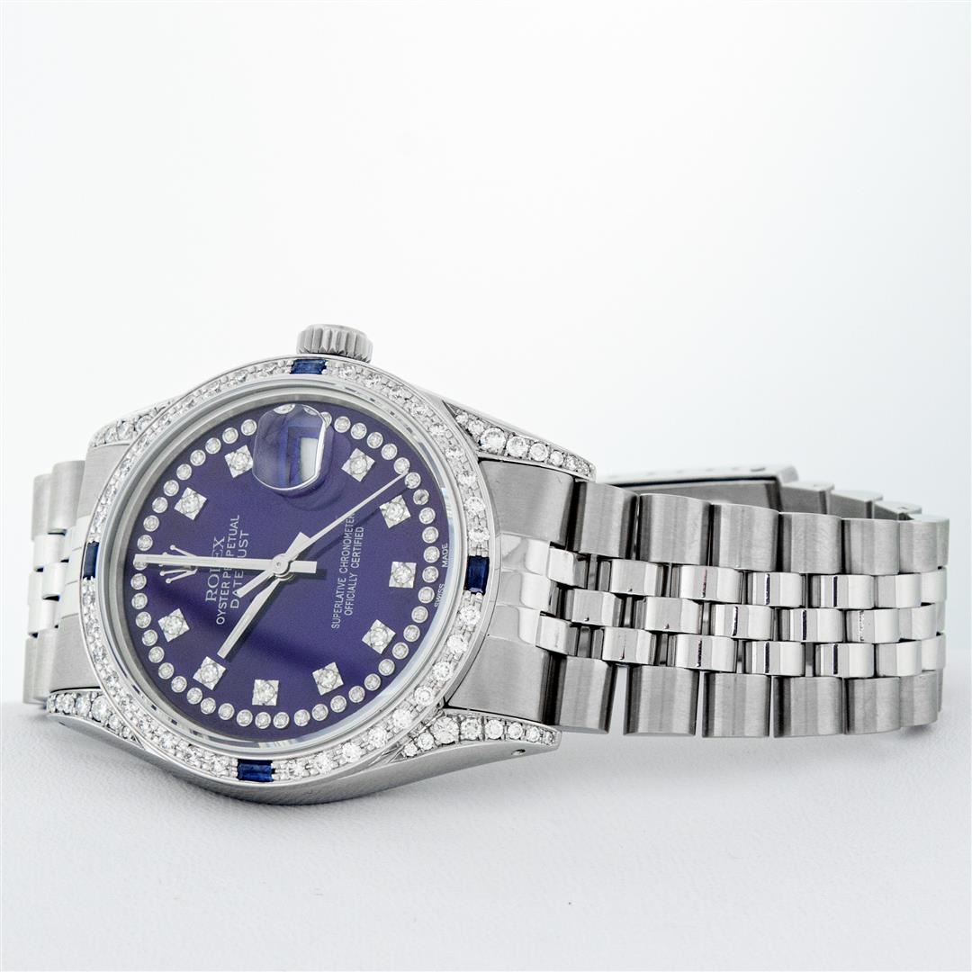 One Mens Rolex Datejust Polished Bright with Satin Finish, Serviced & Electronically Tested, Stainless Steel Case: 36mm, Custom Diamond Lugs: 28 Diamonds On Lugs, Color: G to H, Clarity: SI-VS. Stainless Steel Crown, Custom Bezel: 18K White Gold Diamond + Sapphire Beadset, Diamond Count: 36 Diamonds + 4 Sapphires, Total Weight 1.00 Carat, Clarity: SI-VS, Color: G to H. Custom Crystal: New Scratch Resistant Synthetic Sapphire Cyclops Lens. Custom Hands: New Luminescent Hands. Movement: Automatic Winding Movement. Custom Dial: Blue String Diamond Dial, Stone Count: 43 Diamonds On Dial, Diamond Color: G To H In Color, Clarity: VS. Date Window: 3 O'Clock Position Date Display, Quickset, Model: Datejust Condition: G-6 Extra Fine. Bracelet: Stainless Steel Jubilee Band. Bright Polish & Satin Finish. 7.0 Inch Length, Adjustable. Standard Clasp, With Rolex Logo. This Watch Has Been Serviced And Polished And Its Free Of All Dents And Scratches.