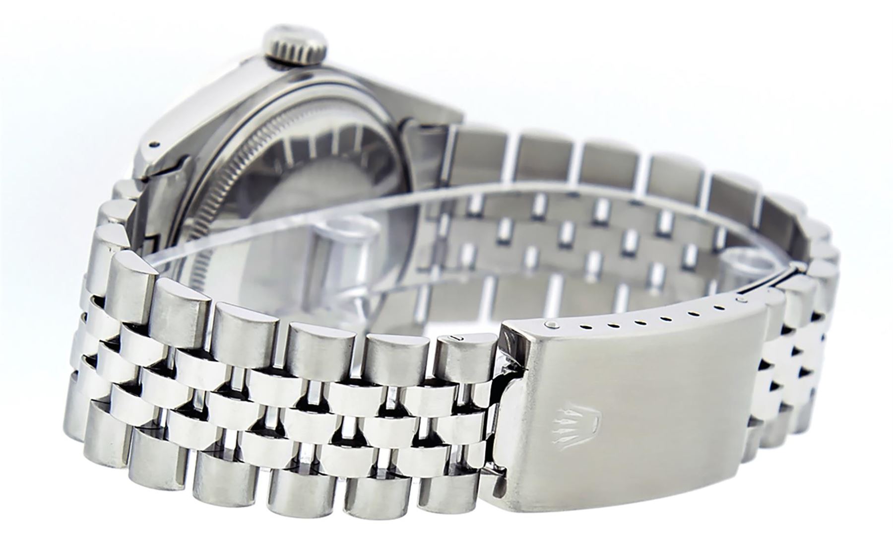 One Mens Rolex Datejust Polished Bright with Satin Finish, Serviced & Electronically Tested, Stainless Steel Case: 36mm, Custom Diamond Lugs: 28 Diamonds In Lugs, Color: G to H, Clarity: SI-VS. Stainless Steel Crown, Custom Bezel: 18K White Gold Diamond + Sapphire Beadset, Diamond Count: 36 Diamonds + 4 Sapphires, Total Weight 1.00 Carat, Clarity: SI-VS, Color: G to H. Custom Crystal: New Scratch Resistant Synthetic Sapphire Cyclops Lens. Custom Hands: New Luminescent Hands. Movement: Automatic Winding Movement. Custom Dial: Blue Mother Of Pearl String Diamond Dial, Stone Count: 58 Diamonds In Dial, Diamond Color: G To H In Color, Clarity: VS. Date Window: 3 O'Clock Position Date Display, Quickset, Model: Datejust Condition: G-6 Extra Fine. Bracelet: Stainless Steel Jubilee Band. Bright Polish & Satin Finish. 7.0 Inch Length, Adjustable. Standard Clasp, With Rolex Logo. This Watch Has Been Serviced And Polished And Its Free Of All Dents And Scratches.