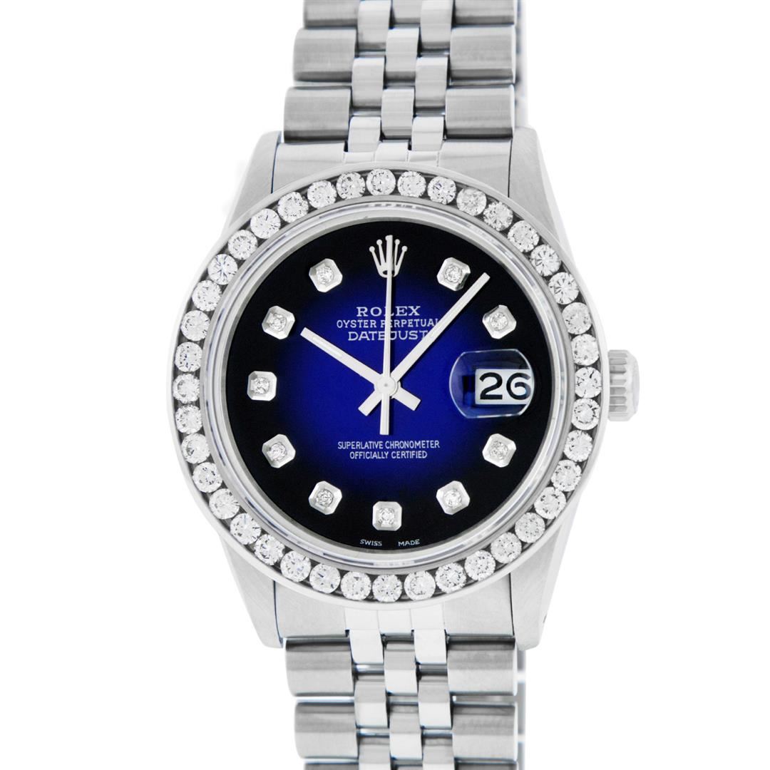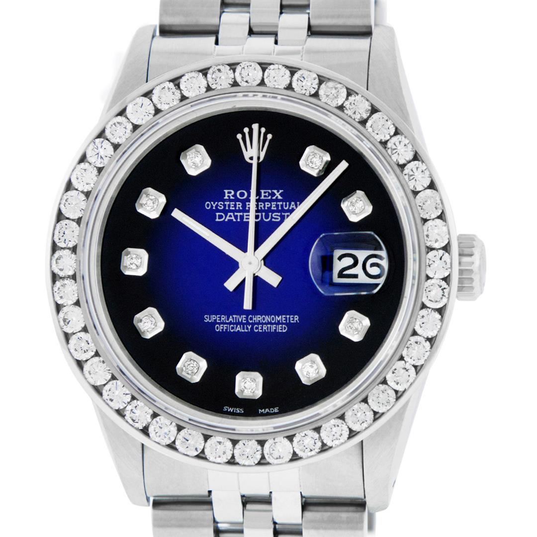 One Mens Rolex Datejust Polished Bright with Satin Finish, Serviced & Electronically Tested, Stainless Steel Case:36mm, Stainless Steel Crown, Custom Bezel: 18K White Gold 3ct Channel Set Diamond Bezel, Diamond Count: 40 Diamonds, Total Weight 3.00 Carat, Clarity: SI-VS, Color: G to H. Custom Crystal: Synthetic Sapphire Cyclops Lens. Movement: Automatic Winding Movement Caliber 3035. Custom Dial: Blue Vignette Diamond Dial, Diamond Count: 10 Diamonds In Dial, Diamond Color: G To H In Color, Clarity: SI-VS. Date Window: 3 O'Clock Position Date Display, Quickset, Model: Datejust Condition: G-6 Extra Fine. Bracelet: Stainless Steel Jubilee Band. Bright Polish & Satin Finish. 7.0 Inch Length, Adjustable. Standard Clasp, With Rolex Logo.