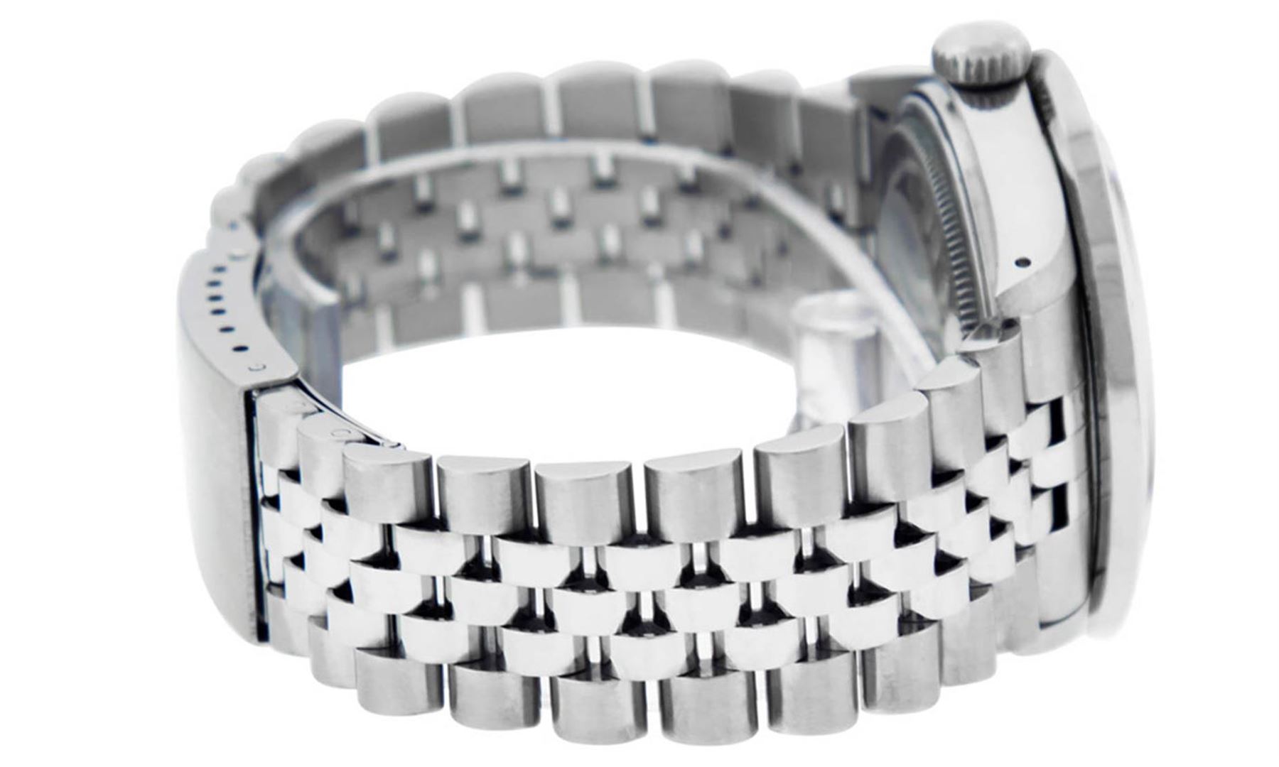 One Mens Stainless Steel Rolex Datejust Polished Bright with Satin Finish, Fully Serviced & Electronically Tested, Stainless Steel Case:36mm, Stainless Steel Crown, Custom Bezel: 18K White Gold 3.0 Carat Channel Set Diamond Bezel, Diamond Count: 40 Diamon