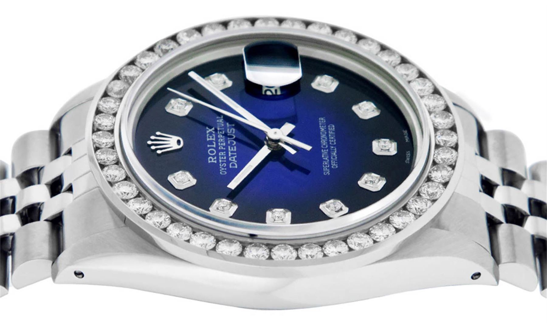 One Mens Stainless Steel Rolex Datejust Polished Bright with Satin Finish, Fully Serviced & Electronically Tested, Stainless Steel Case:36mm, Stainless Steel Crown, Custom Bezel: 18K White Gold 3.0 Carat Channel Set Diamond Bezel, Diamond Count: 40 Diamonds, Total Weight 3.0 Carat, Clarity: SI-VS, Color: G to H. Custom Crystal: New Synthetic Sapphire Cyclops Lens. Custom Hands: New Luminecent Hands. Movement: Automatic Winding Movement Caliber 3035. Custom Dial: Blue Vignette Diamond Dial, 10 Diamonds in Dial, G To H In Color, Clarity: SI-VS. Date Window: 3 O'Clock Position Date Display, Quickset, Model: Datejust 36mm, Condition: G-6 Extra Fine. Bracelet: Rolex Stainless Steel Jubilee Band. Bright Polish & Satin Finish. 7.0 Inch Length, Adjustable. Standard Clasp, With Rolex Logo. This watch has been serviced and polished and its free of all dents and scratches and has been time tested.