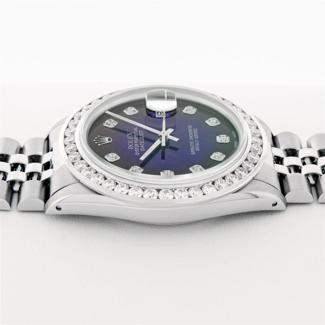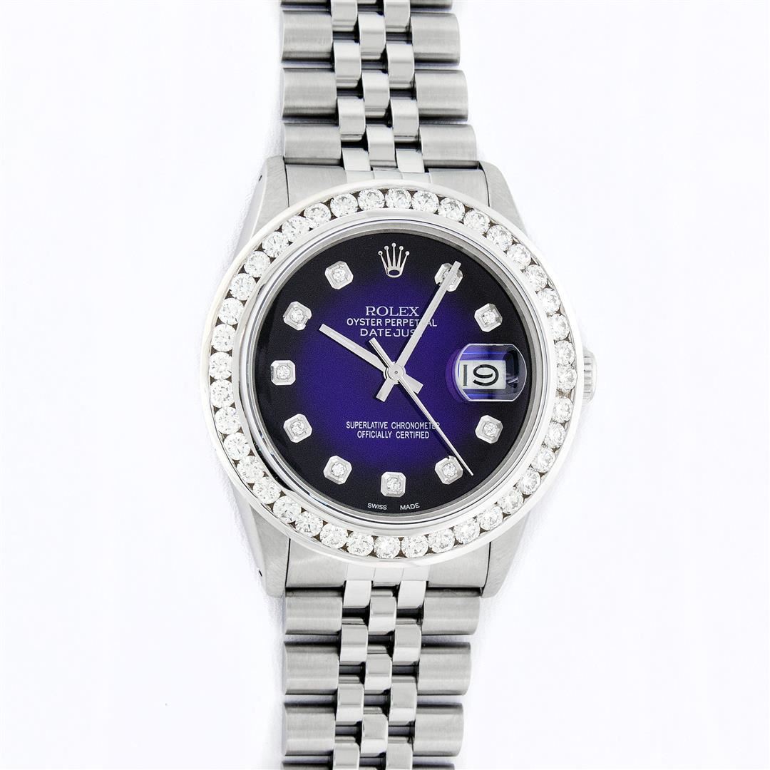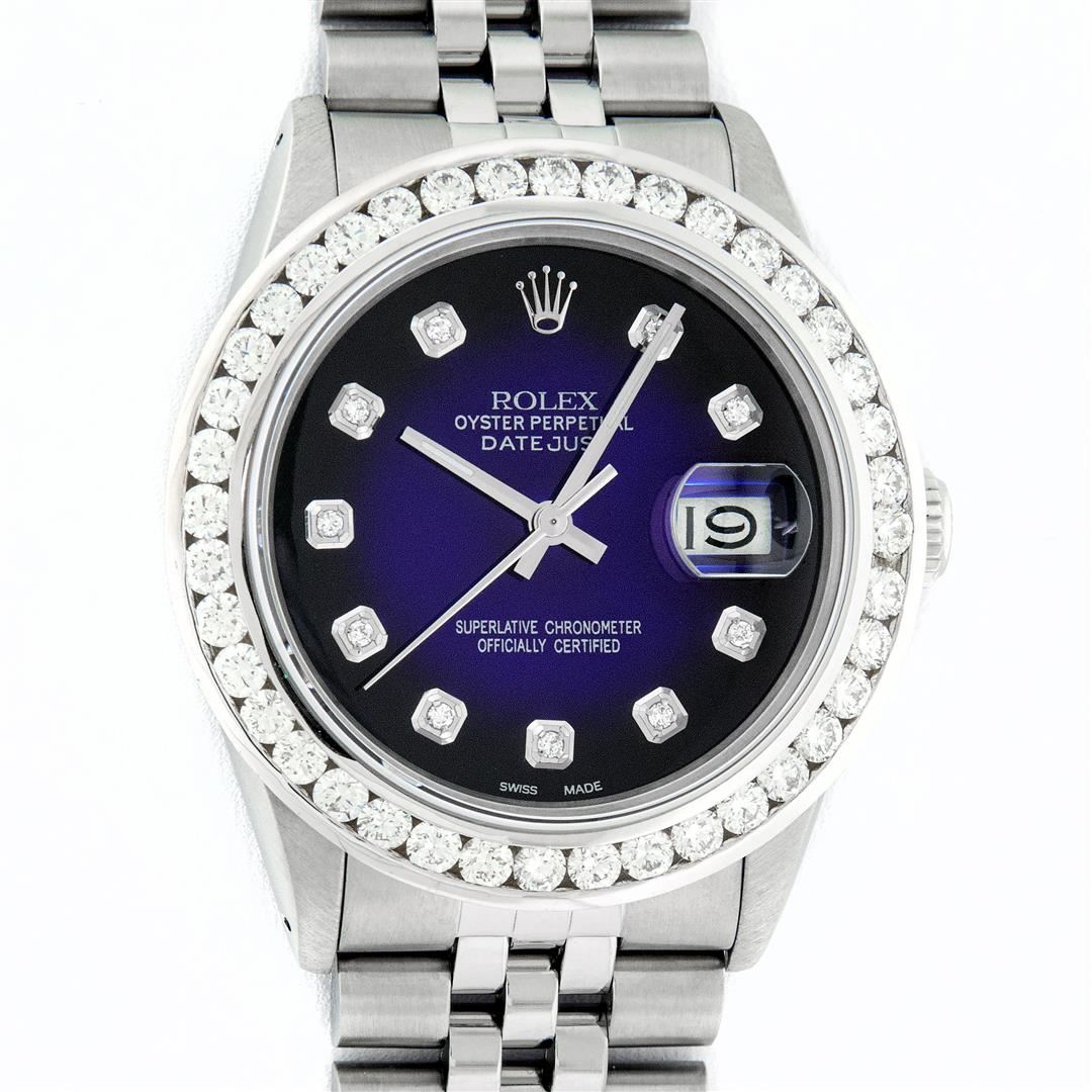 One Mens Stainless Steel Rolex Datejust Polished Bright with Satin Finish, Fully Serviced & Electronically Tested, Stainless Steel Case:36mm, Stainless Steel Crown, Custom Bezel: 18K White Gold 3.00 Ctw Diamond Bezel, Diamond Count: 40 Diamonds, Total Weight 3.0 Carat, Clarity: SI-VS, Color: G to H. Custom Crystal: New Synthetic Sapphire Cyclops Lens. Custom Hands: New Luminecent Hands. Movement: Automatic Winding Movement Caliber 3035. Custom Dial: Blue Vignette Diamond Dial, 10 Diamonds in Dial, G To H In Color, Clarity: SI-VS. Date Window: 3 O'Clock Position Date Display, Quickset, Model: Datejust 36mm, Condition: G-6 Extra Fine. Bracelet: Rolex Stainless Steel Jubilee Band. Bright Polish & Satin Finish. 7.0 Inch Length, Adjustable. Standard Clasp, With Rolex Logo. Watch Has Been Serviced And Polished It Is Free Of All Scratches And Dents. This Watch Comes With A Rolex Box, Appraisal, And Watch Winder.