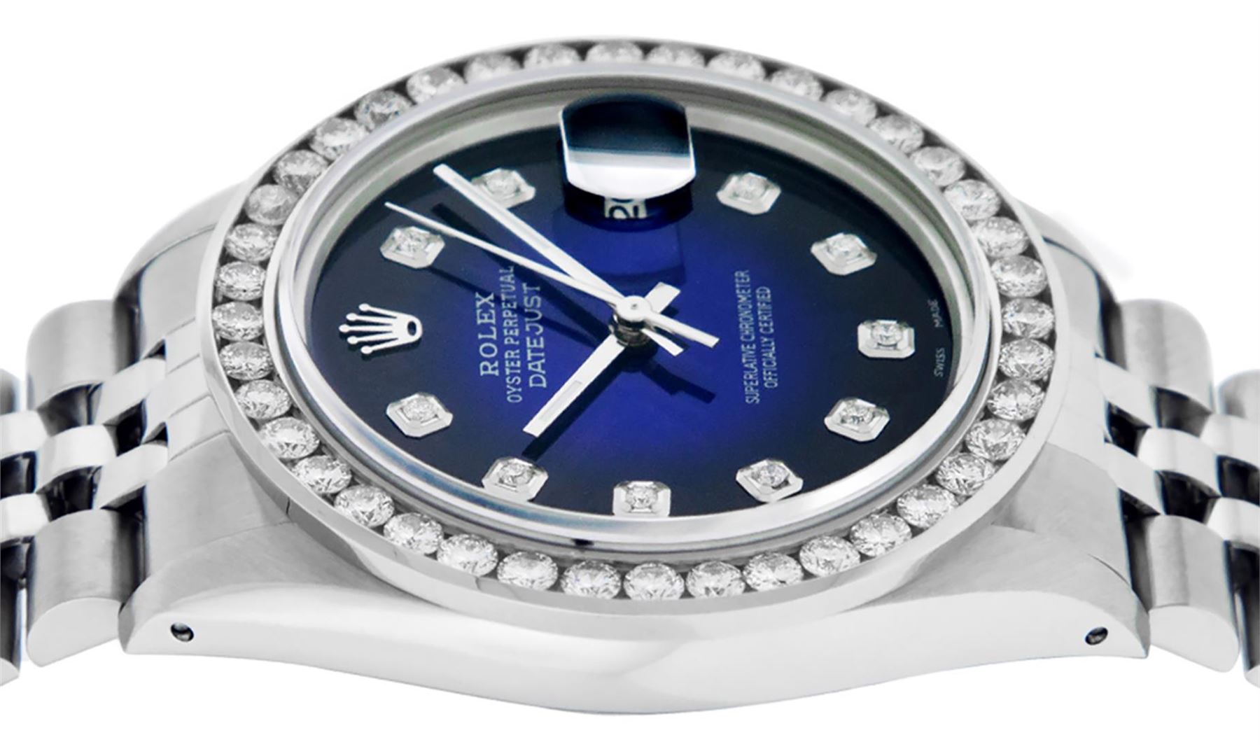 One Mens Stainless Steel Rolex Datejust Polished Bright with Satin Finish, Fully Serviced & Electronically Tested, Stainless Steel Case:36mm, Stainless Steel Crown, Custom Bezel: 18K White Gold 3.00 Ctw Diamond Bezel, Diamond Count: 40 Diamonds, Total Weight 3.0 Carat, Clarity: SI-VS, Color: G to H. Custom Crystal: New Synthetic Sapphire Cyclops Lens. Custom Hands: New Luminecent Hands. Movement: Automatic Winding Movement Caliber 3035. Custom Dial: Blue Vignette Diamond Dial, 10 Diamonds in Dial, G To H In Color, Clarity: SI-VS. Date Window: 3 O'Clock Position Date Display, Quickset, Model: Datejust 36mm, Condition: G-6 Extra Fine. Bracelet: Rolex Stainless Steel Jubilee Band. Bright Polish & Satin Finish. 7.0 Inch Length, Adjustable. Standard Clasp, With Rolex Logo. Watch Has Been Serviced And Polished It Is Free Of All Scratches And Dents.