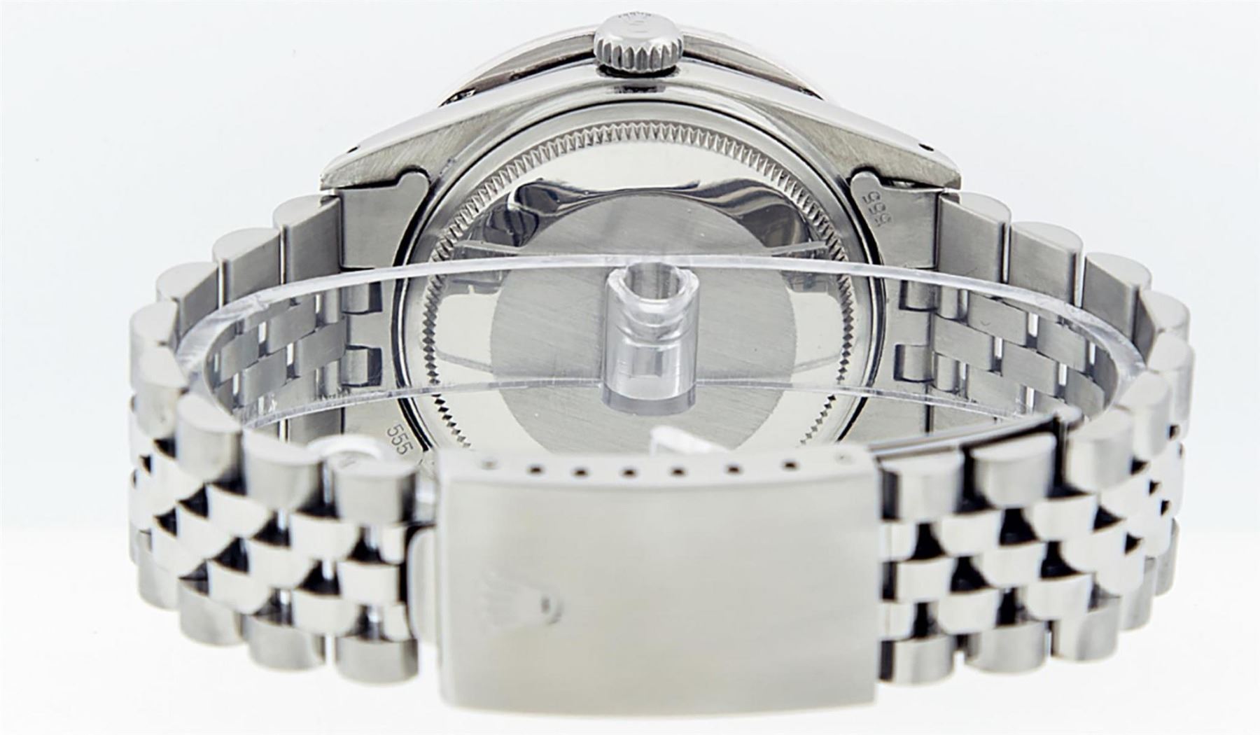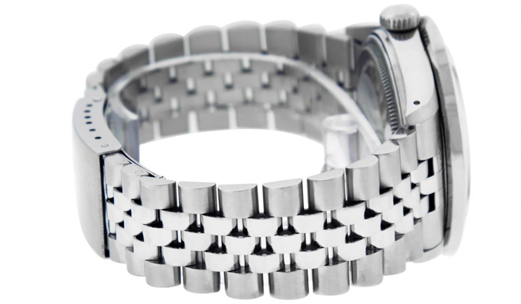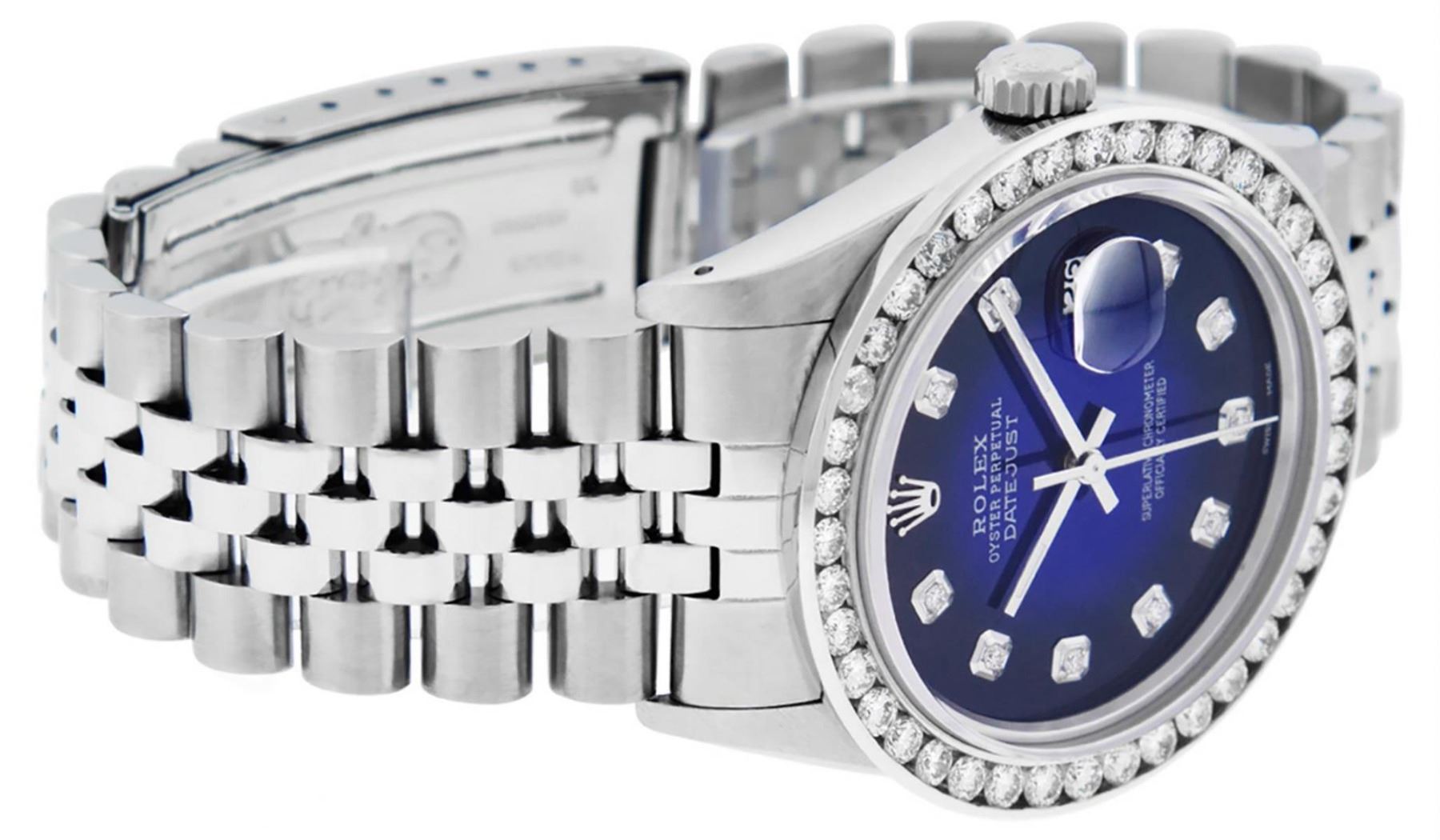 One Mens Stainless Steel Rolex Datejust Polished Bright with Satin Finish, Fully Serviced & Electronically Tested, Stainless Steel Case:36mm, Stainless Steel Crown, Custom Bezel: 18K White Gold 3.00 Ctw Diamond Bezel, Diamond Count: 40 Diamonds, Total Weight 3.0 Carat, Clarity: SI-VS, Color: G to H. Custom Crystal: New Scratch Resistant Synthetic Sapphire Cyclops Lens. Custom Hands: New Luminecent Hands. Movement: Automatic Winding Movement. Custom Dial: Blue Vignette Diamond Dial, 10 Diamonds in Dial, G To H In Color, Clarity: SI-VS. Date Window: 3 O'Clock Position Date Display, Quickset, Model: Datejust 36mm, Condition: G-6 Extra Fine. Bracelet: Rolex Stainless Steel Jubilee Band. Bright Polish & Satin Finish. 7.0 Inch Length, Adjustable. Standard Clasp, With Rolex Logo. Watch Has Been Serviced And Polished It Is Free Of All Scratches And Dents.