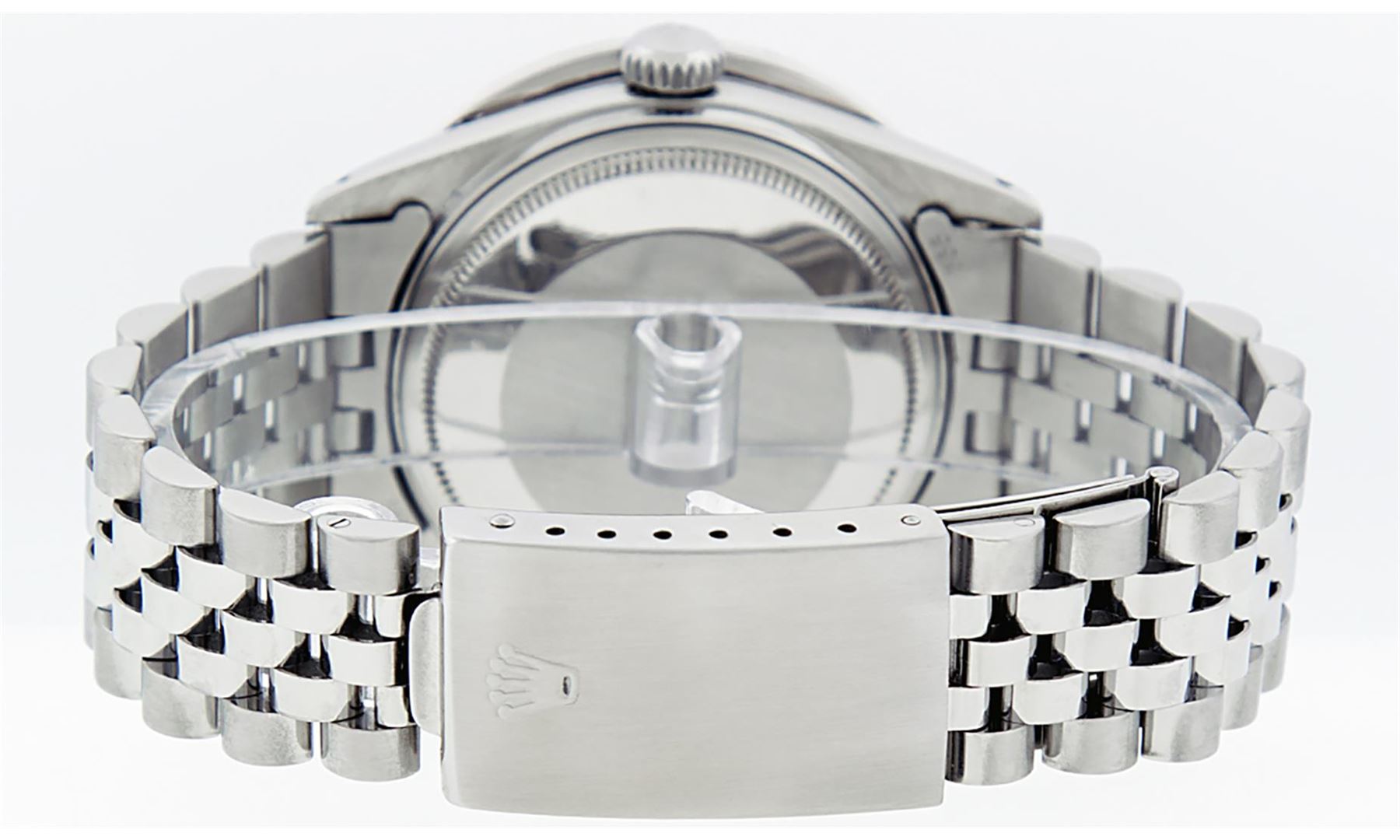 One Mens Stainless Steel Rolex Datejust Polished Bright with Satin Finish, Fully Serviced & Electronically Tested, Stainless Steel Case:36mm, Stainless Steel Crown, Custom Bezel: 18K White Gold 3.00 Ctw Diamond Bezel, Diamond Count: 40 Diamonds, Total Weight 3.0 Carat, Clarity: SI-VS, Color: G to H. Custom Crystal: New Scratch Resistant Synthetic Sapphire Cyclops Lens. Custom Hands: New Luminecent Hands. Movement: Automatic Winding Movement. Custom Dial: Blue Vignette Diamond Dial, 10 Diamonds in Dial, G To H In Color, Clarity: SI-VS. Date Window: 3 O'Clock Position Date Display, Quickset, Model: Datejust 36mm, Condition: G-6 Extra Fine. Bracelet: Rolex Stainless Steel Jubilee Band. Bright Polish & Satin Finish. 7.0 Inch Length, Adjustable. Standard Clasp, With Rolex Logo. Watch Has Been Serviced And Polished It Is Free Of All Scratches And Dents.