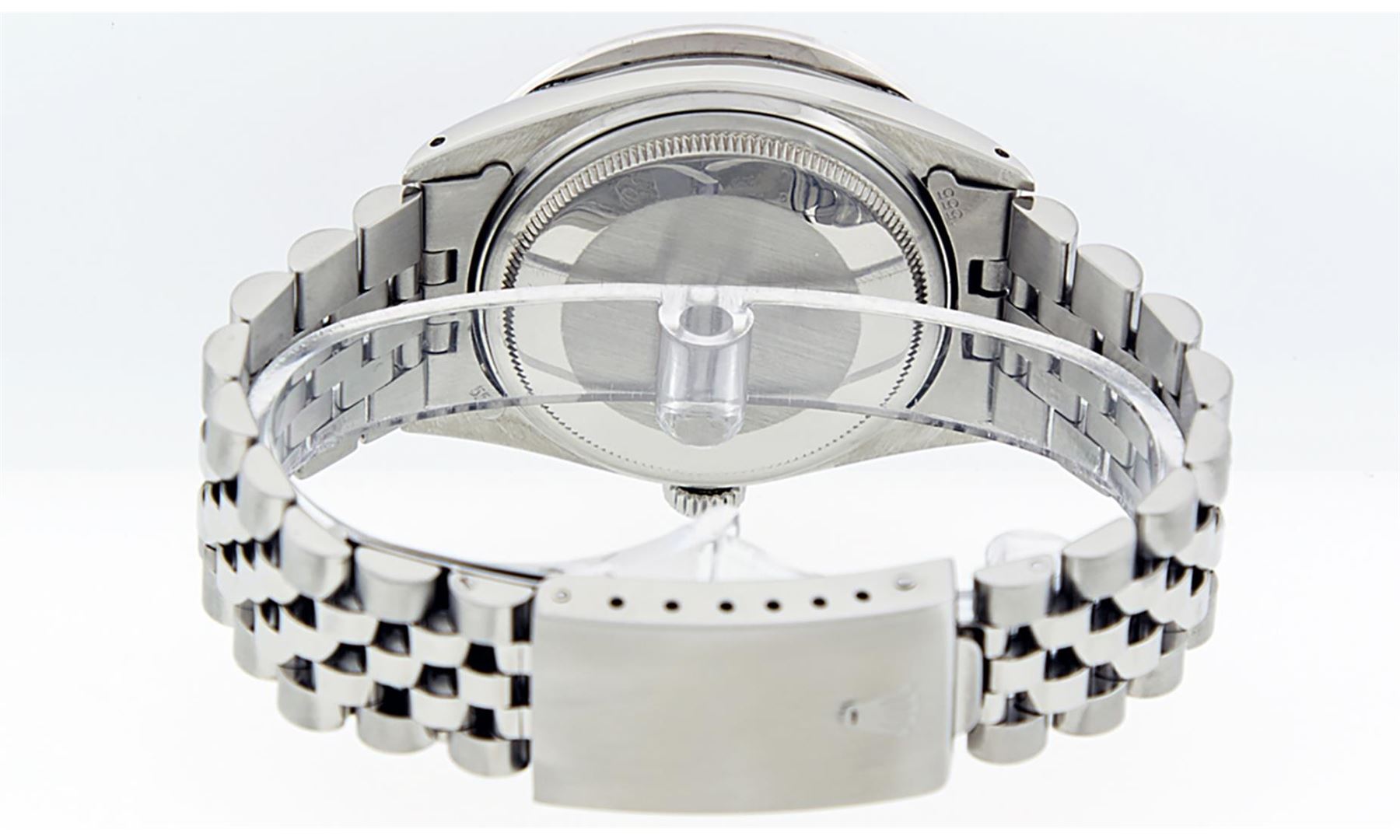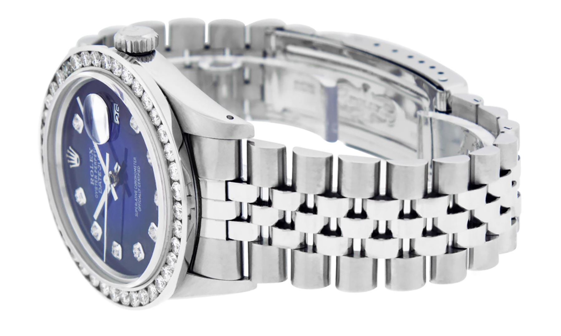 One Mens Pre Owned Stainless Steel Rolex Datejust Polished Bright with Satin Finish, Fully Serviced & Electronically Tested, Rolex Stainless Steel Case: 36mm, Rolex Stainless Steel Crown, Custom Bezel: New 18K White Gold 3.00 Ctw Diamond Bezel, Diamond Count: 40 Diamonds, Total Weight 3.0 Carat. Custom Crystal: New Sapphire With Magnified Date Window. Custom Hands: New Luminescent Hands. Rolex Movement: Automatic Winding Movement 3035. Custom Dial: Custom Blue Vignette Dial With Added Diamond Hour Markers, 10 Diamonds On Dial. Date Window: 3 O'Clock Position Date Display, Quickset, Model: Datejust 36mm, Condition: G-6 Extra Fine. Rolex Bracelet: Rolex Stainless Steel Jubilee Band. Bright Polish And Satin Finish. 7.0 Inch Length, Adjustable. Standard Clasp, With Rolex Logo. This Watch Has Been Serviced And Polished It Is Free Of All Scratches And Dents.