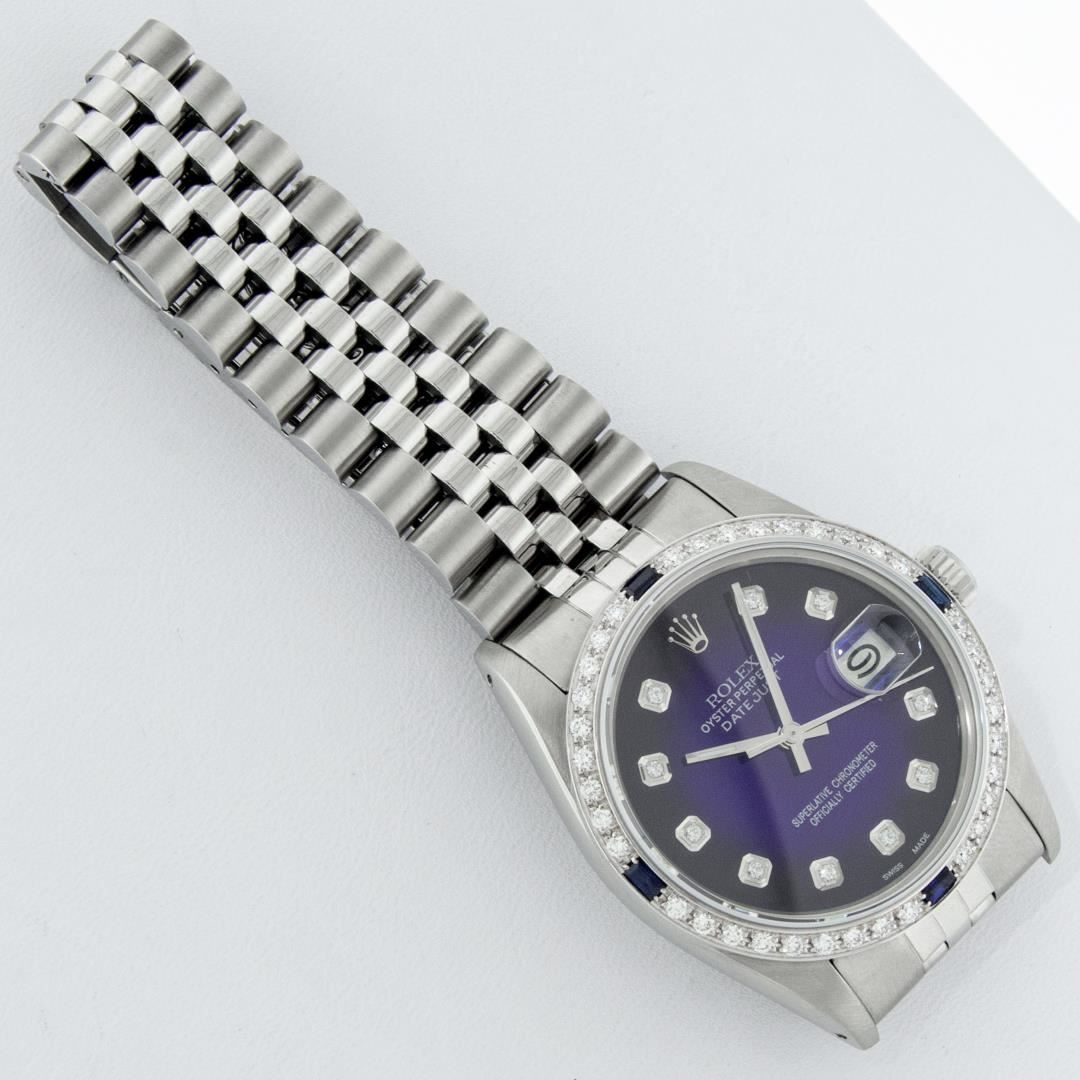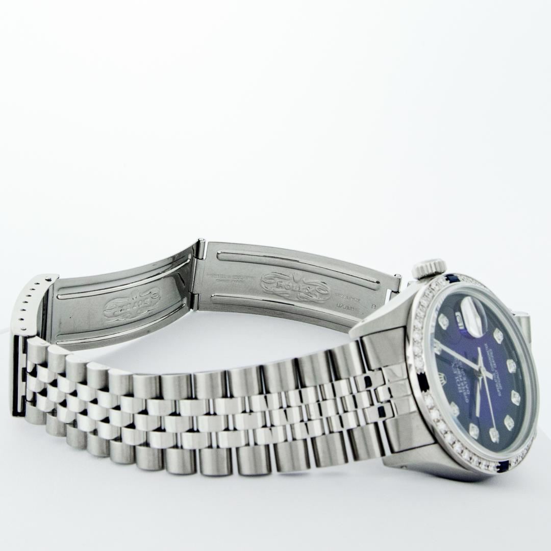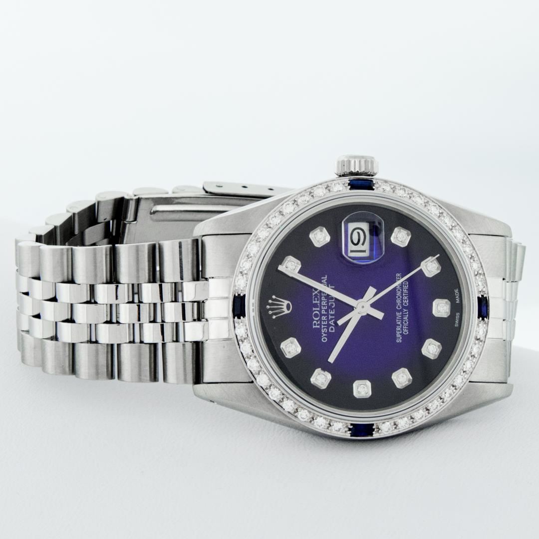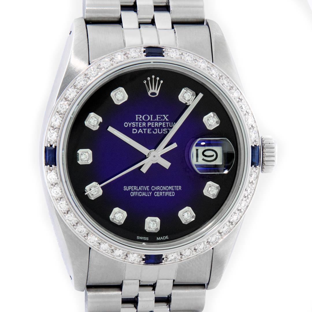 One Pre Owned Rolex Stainless Steel 36MM Datejust Polished Bright with Satin Finish, Rolex Stainless Steel Case: 36mm, Rolex Stainless Steel Crown, Custom Bezel: New 18K White Gold Sapphire Beadset Diamond Bezel. Custom Crystal: New Sapphire With Date Window. Custom Hands: New Luminescent Hands. Rolex Movement: Automatic Winding Movement 3035. Custom Dial: Custom Blue Vignette With Added Diamond Hour Markers, Diamond Count: 10 Diamonds in Dial. Date Window: 3 O'Clock Position Date Display, Quickset, Model: Quickset Datejust, Condition: G-6 Extra Fine. Rolex Bracelet: Stainless Steel Jubilee Band. Bracelet: 7.0 Inch Length, Adjustable. Fold Clasp, With Rolex Logo. This Watch Has Been Serviced Time Tested And Is In Excellent Condition It Is Free Of All Scratches And Dents.