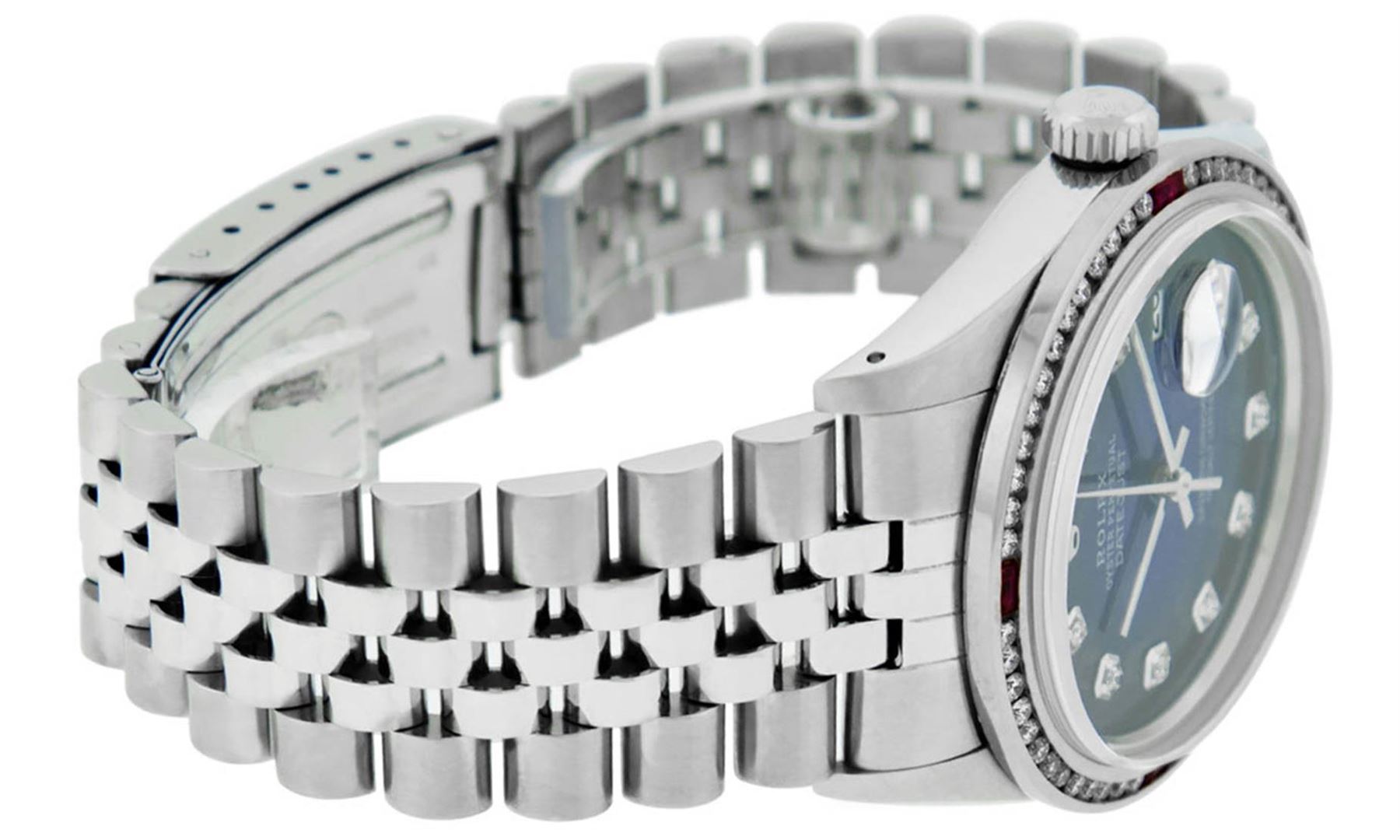 One Mens Stainless Steel Rolex Datejust Polished Bright with Satin Finish, Fully Serviced & Electronically Tested, Stainless Steel Case:36mm, Stainless Steel Crown, Custom Bezel: 18K White Gold Ruby Channel Set Diamond Bezel, Diamond Count: 52 Diamonds +
