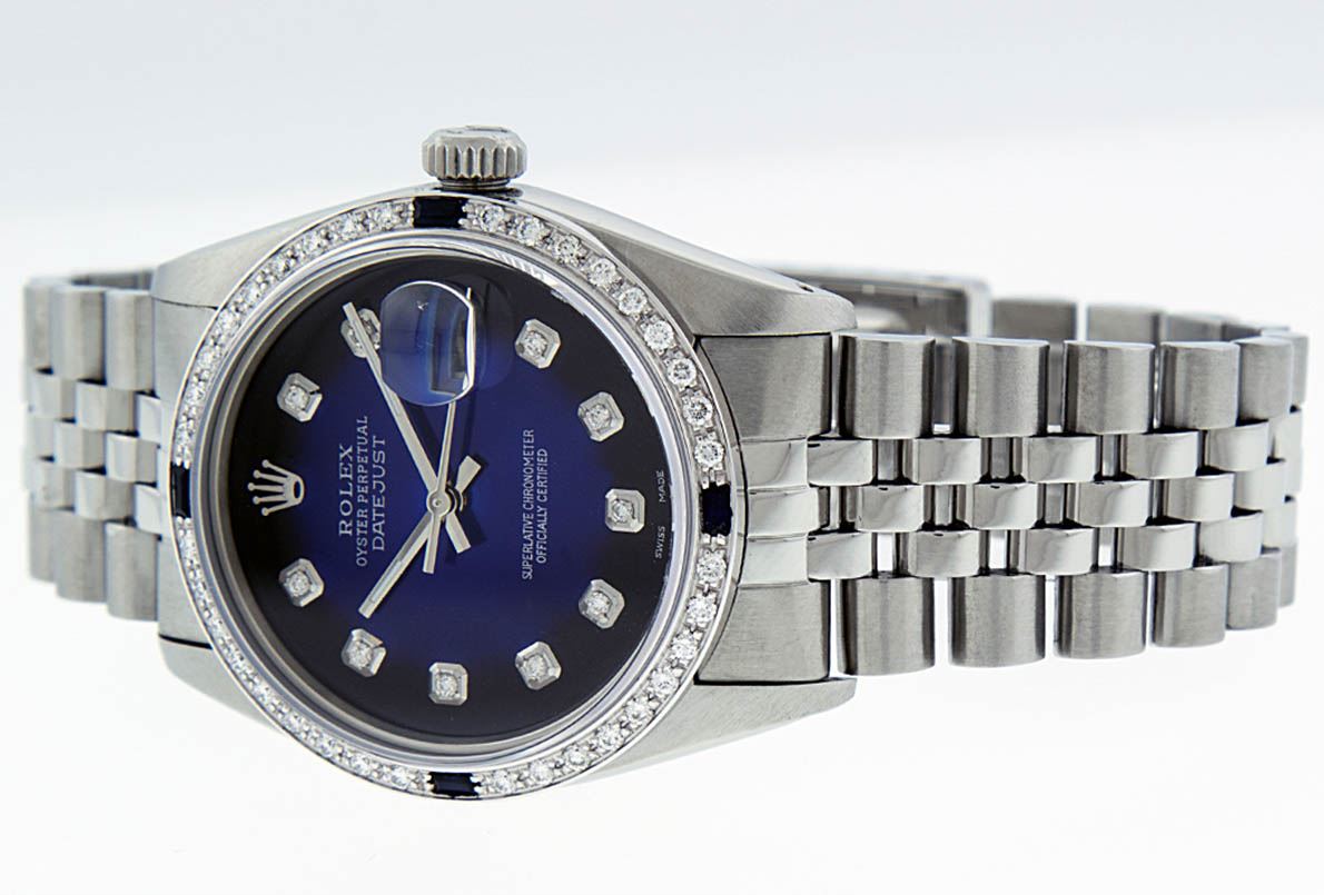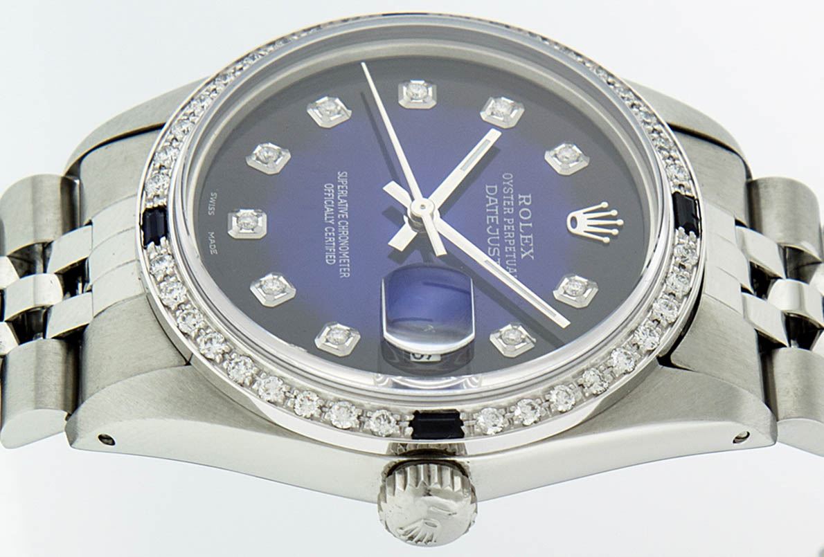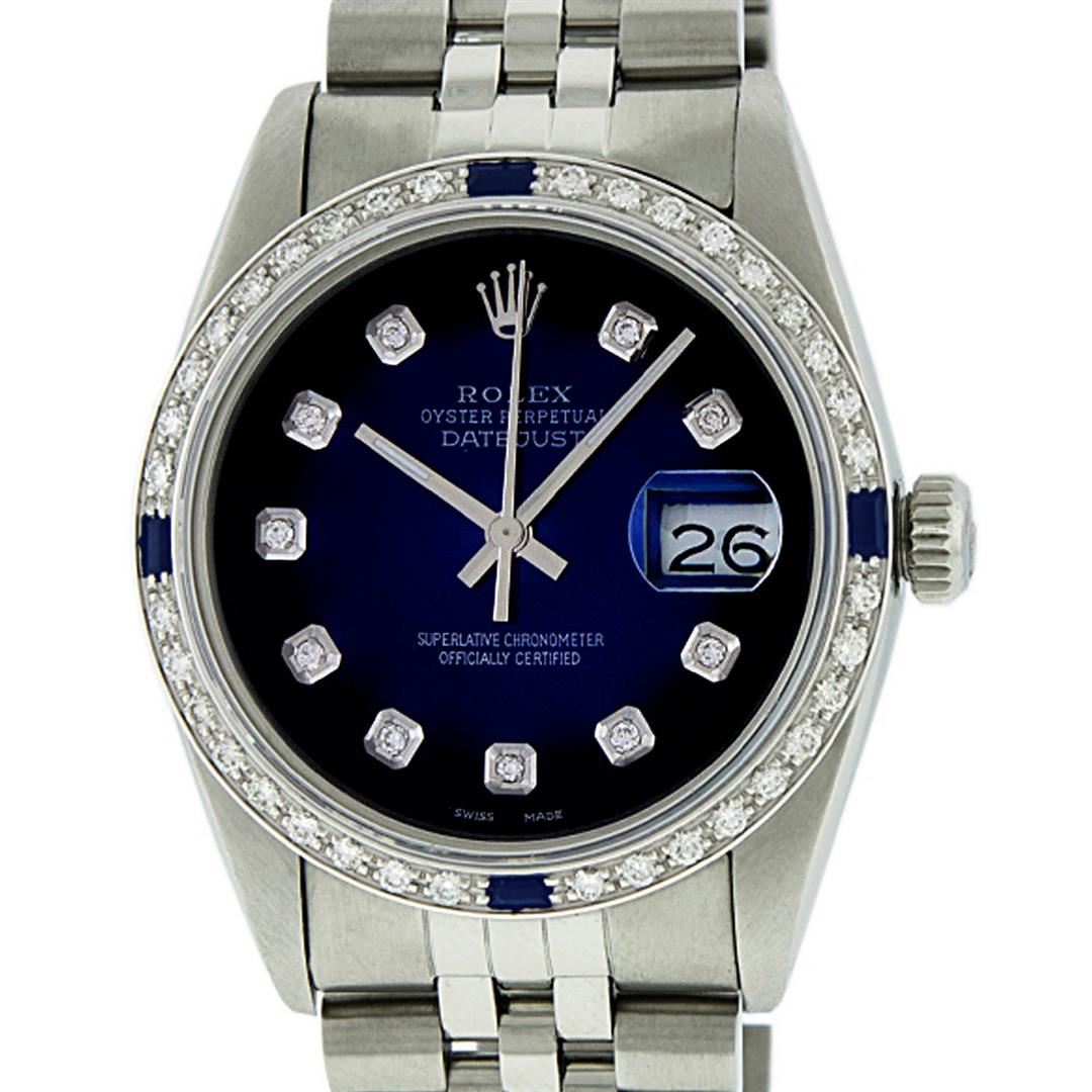One Mens Rolex Datejust Polished Bright with Satin Finish, This Watch Has Been Serviced & Electronically Tested, Stainless Steel Case: 36mm, Stainless Steel Crown, Custom Bezel: New 18K White Gold Sapphire Beadset Diamond Bezel, Diamond + Gem Count: 36 Diamonds + 4 Sapphires Total Weight 1.00 Carat, Clarity: Si-VS, Color: G to H. Custom Crystal: New Synthetic Sapphire Cyclops Lens. Custom Hands: New Luminescent Hands. Movement: Automatic Winding Movement Caliber 3035. Custom Dial: Blue Vignette With Diamond Hour Markers, Diamond Count: 10 Diamonds in Dial, Diamond Color: G To H In Color, Clarity: Si-VS. Date Window: 3 O'Clock Position Date Display, Quickset, Model: Datejust, Condition: G-6 Extra Fine. Bracelet: Stainless Steel Jubilee. Bracelet: 7.0 Inch Length, Adjustable. Standard Clasp, With Rolex Logo. This Watch Has Been Serviced Time Tested And Is In Excellent Condition It Is Free Of All Scratches And Dents.