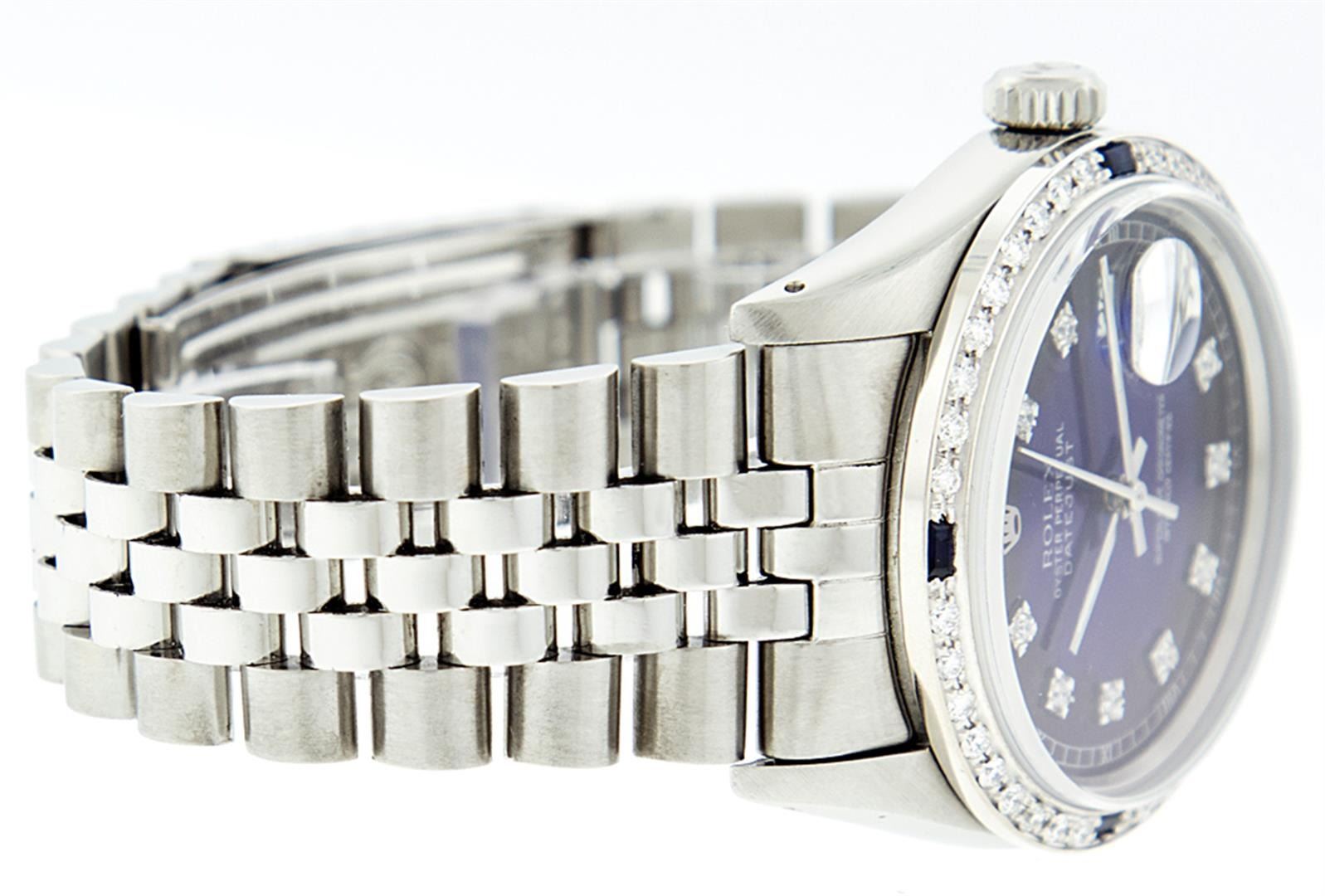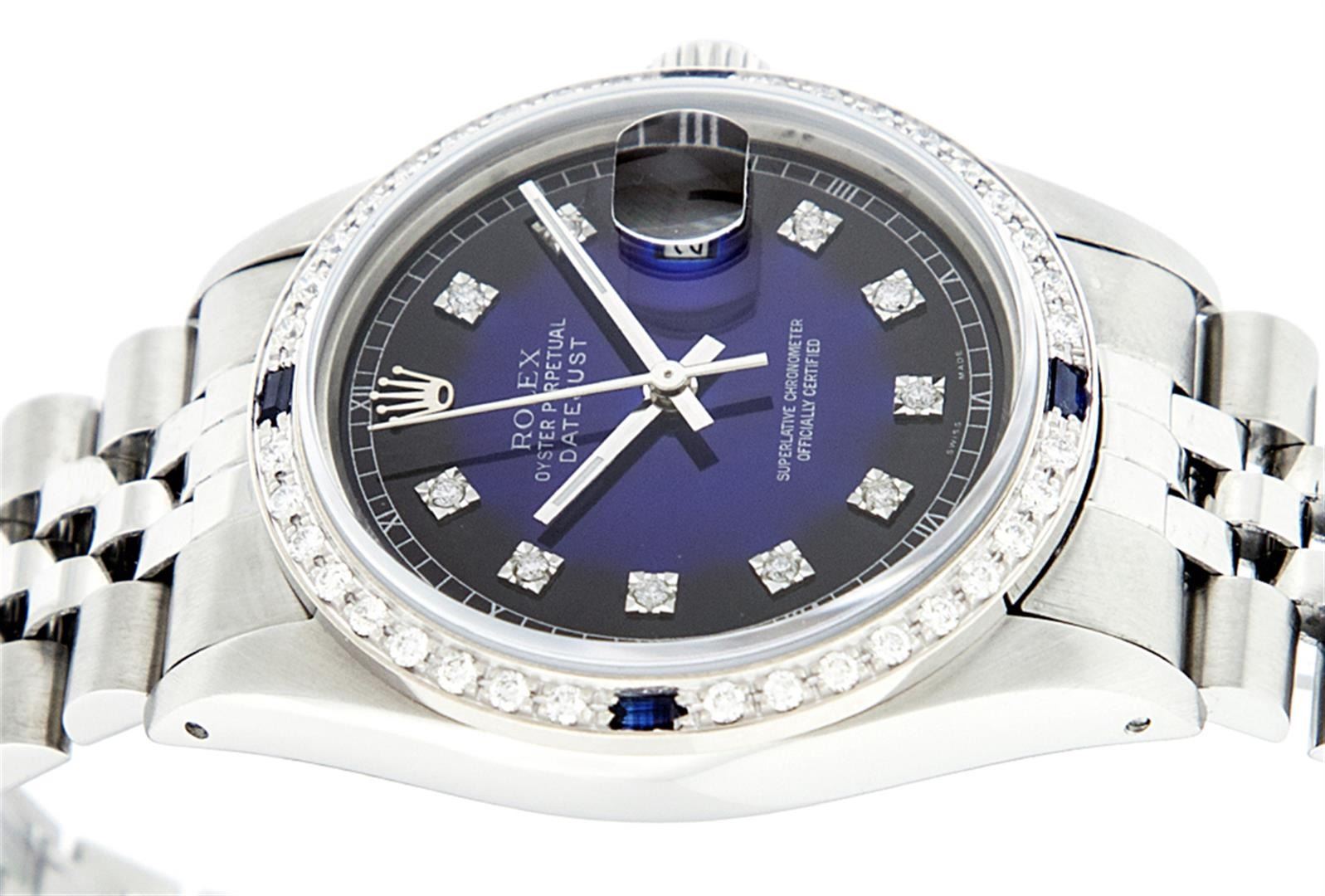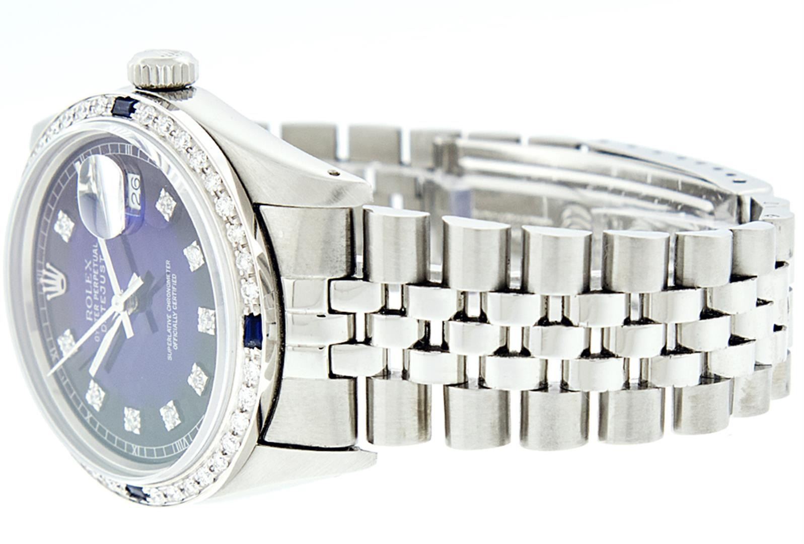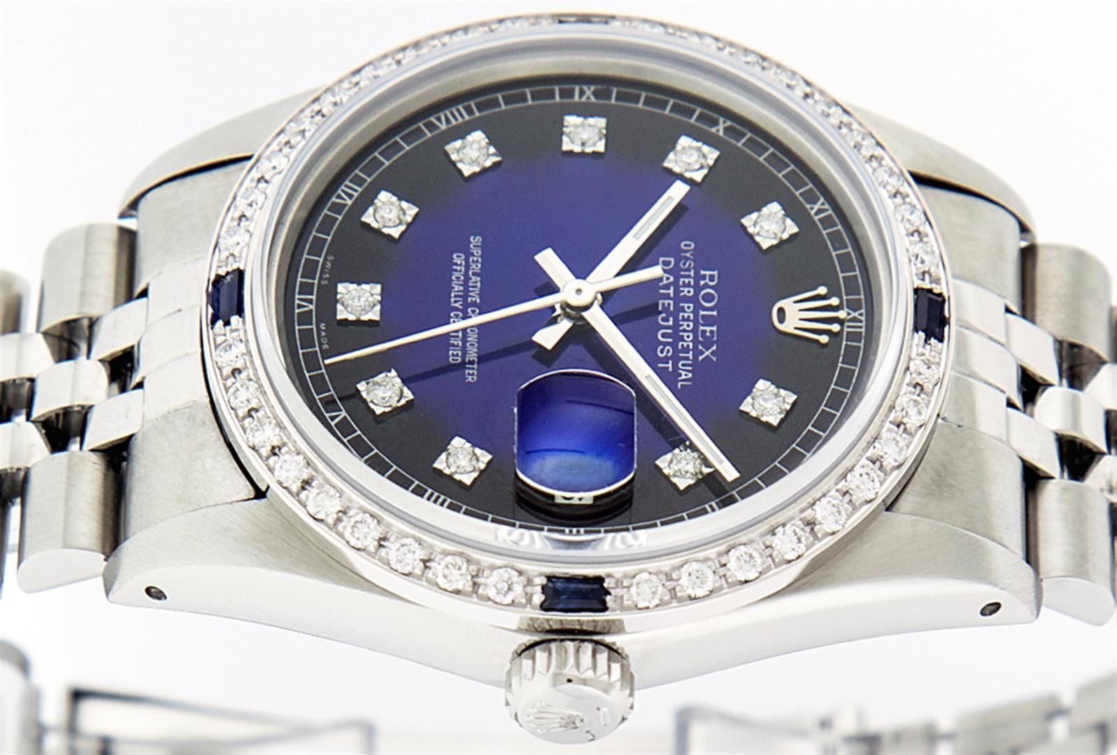 One Mens Pre Owned Stainless Steel Rolex Datejust Polished, Serviced & Electronically Tested, Stainless Steel Case: 36mm, Rolex Stainless Steel Crown, Custom Bezel: New 18K White Gold Sapphire Beadset Diamond Bezel, Diamond + Gem Count: 36 Diamonds + 4 Sapphires, Clarity: SI-VS, Color: G to H. Custom Crystal: New Sapphire Magnified Date. Custom Hands: New Luminescent Hands. Rolex Movement: Automatic Winding Movement. Custom Dial: Refinished To Blue Vignette With Custom Added Diamond Hour Markers, 10 Diamonds in Dial, G To H In Color, Clarity: SI-VS. Date Window: 3 O'Clock Position Date Display, Quickset, Model: Datejust. Condition: G-6 Extra Fine. Rolex Bracelet: Stainless Steel Jubilee. Bright Polish & Satin Finish. 7.0 Inch Length, Adjustable. Standard Clasp, With Rolex Logo. This Watch Has Been Serviced Time Tested And Is In Excellent Condition It Is Free Of All Scratches And Dents.