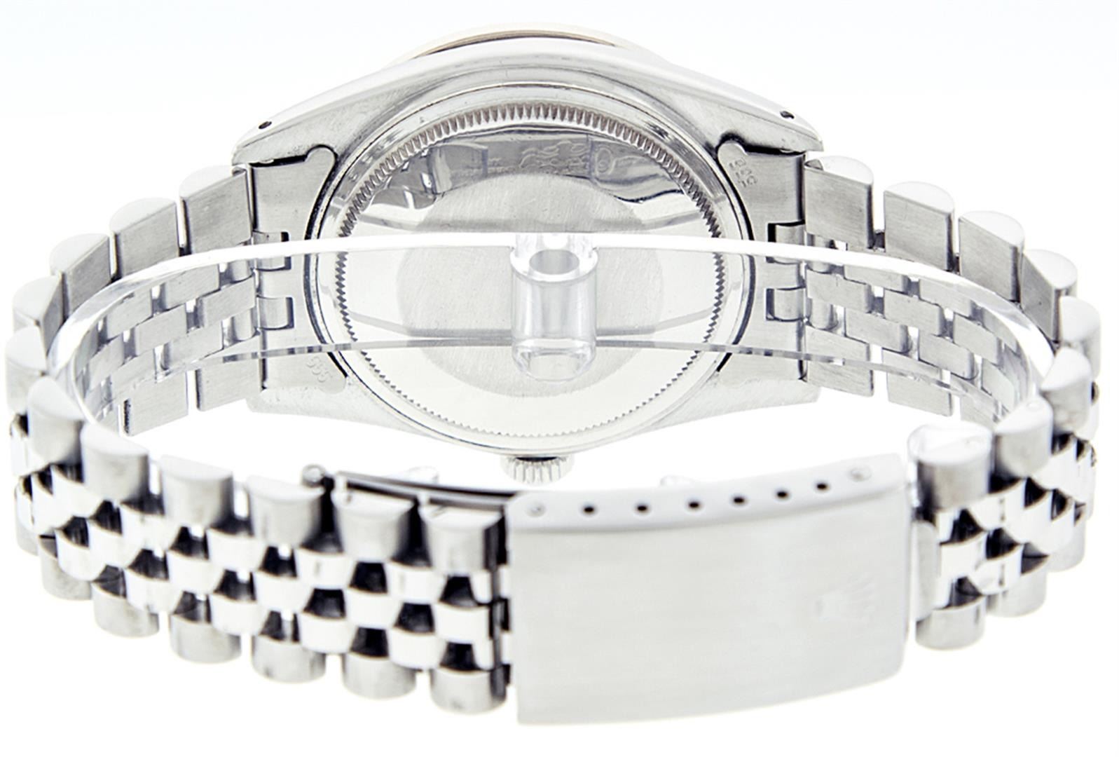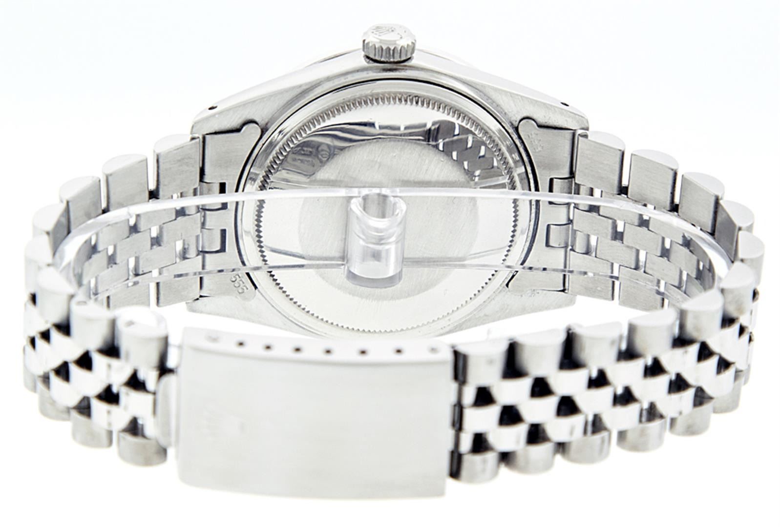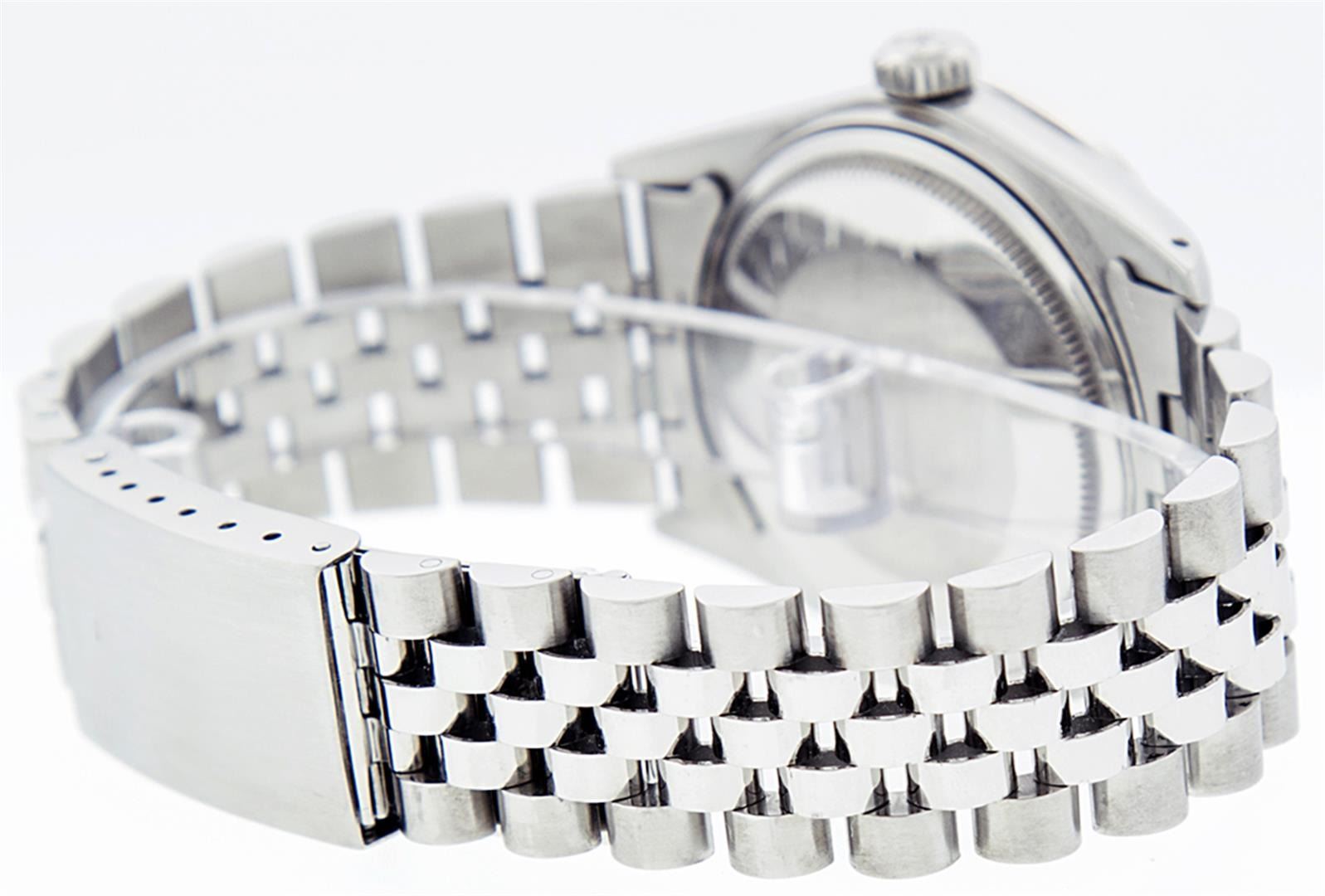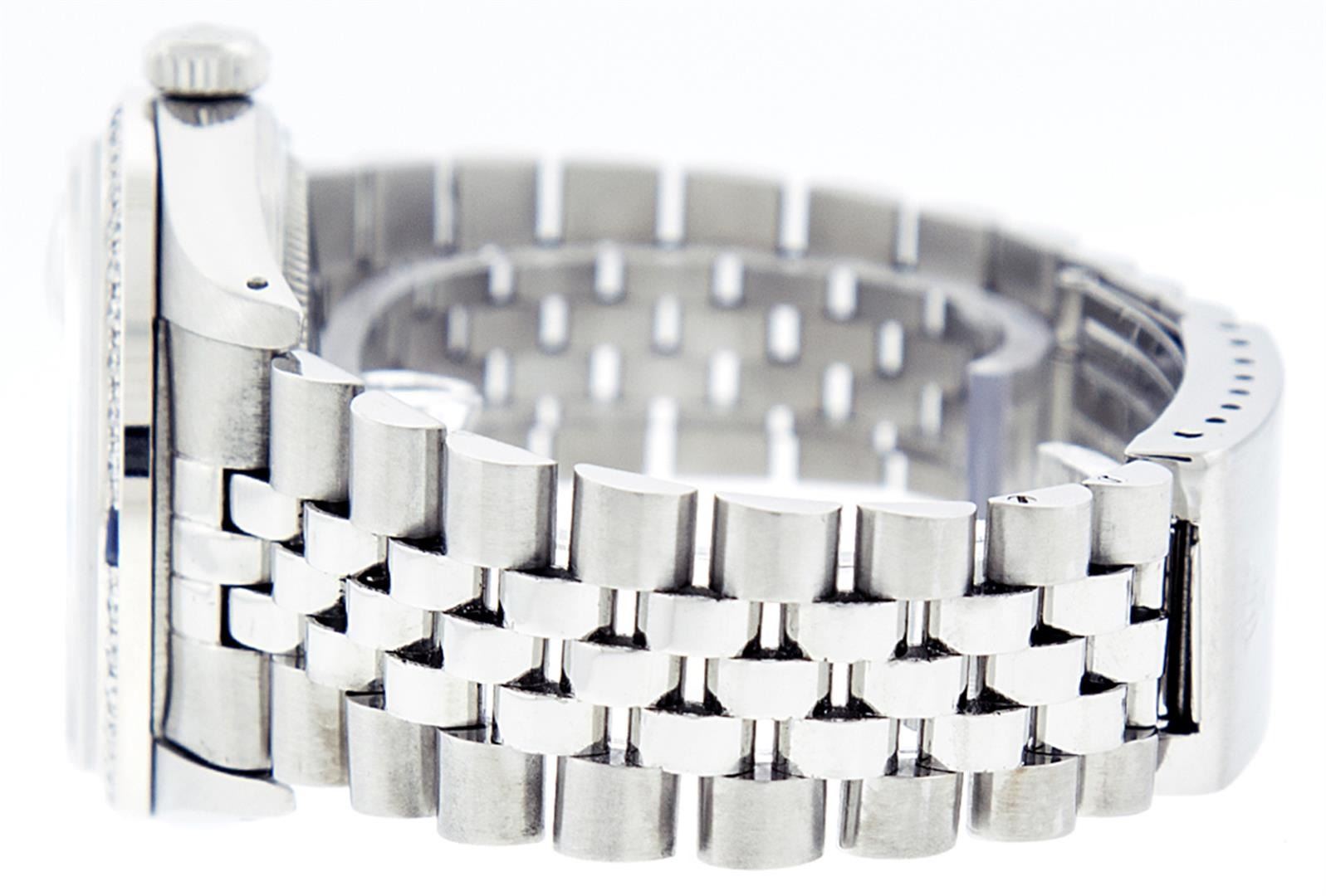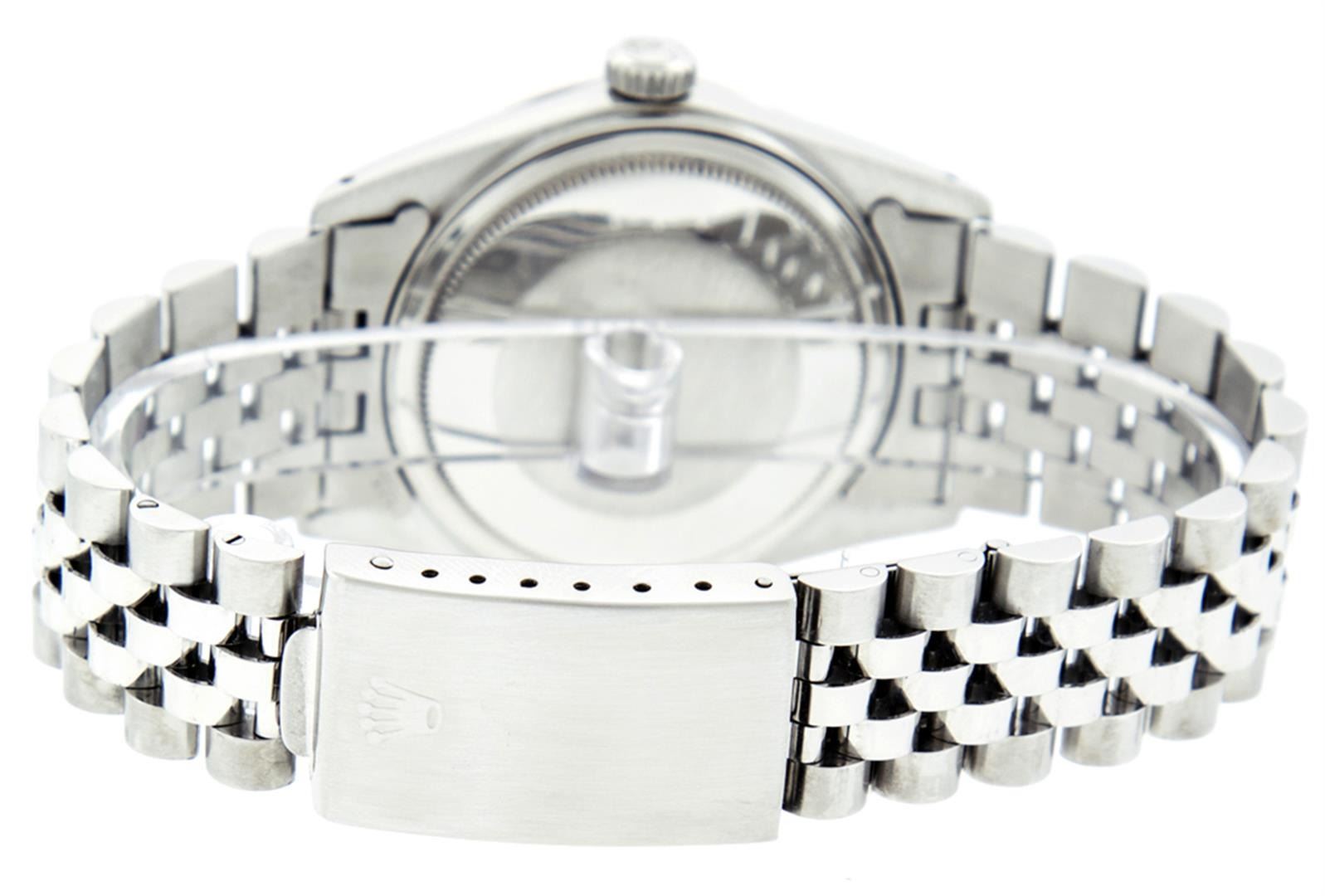 One Mens Pre Owned Stainless Steel Rolex Datejust Polished, Serviced & Electronically Tested, Stainless Steel Case: 36mm, Rolex Stainless Steel Crown, Custom Bezel: New 18K White Gold Sapphire Beadset Diamond Bezel, Diamond + Gem Count: 36 Diamonds + 4 Sapphires, Clarity: SI-VS, Color: G to H. Custom Crystal: New Sapphire Magnified Date. Custom Hands: New Luminescent Hands. Rolex Movement: Automatic Winding Movement. Custom Dial: Refinished To Blue Vignette With Custom Added Diamond Hour Markers, 10 Diamonds in Dial, G To H In Color, Clarity: SI-VS. Date Window: 3 O'Clock Position Date Display, Quickset, Model: Datejust. Condition: G-6 Extra Fine. Rolex Bracelet: Stainless Steel Jubilee. Bright Polish & Satin Finish. 7.0 Inch Length, Adjustable. Standard Clasp, With Rolex Logo. This Watch Has Been Serviced Time Tested And Is In Excellent Condition It Is Free Of All Scratches And Dents.