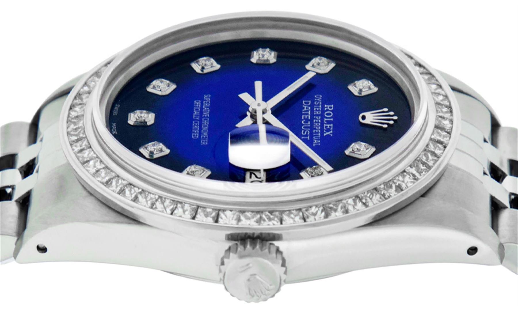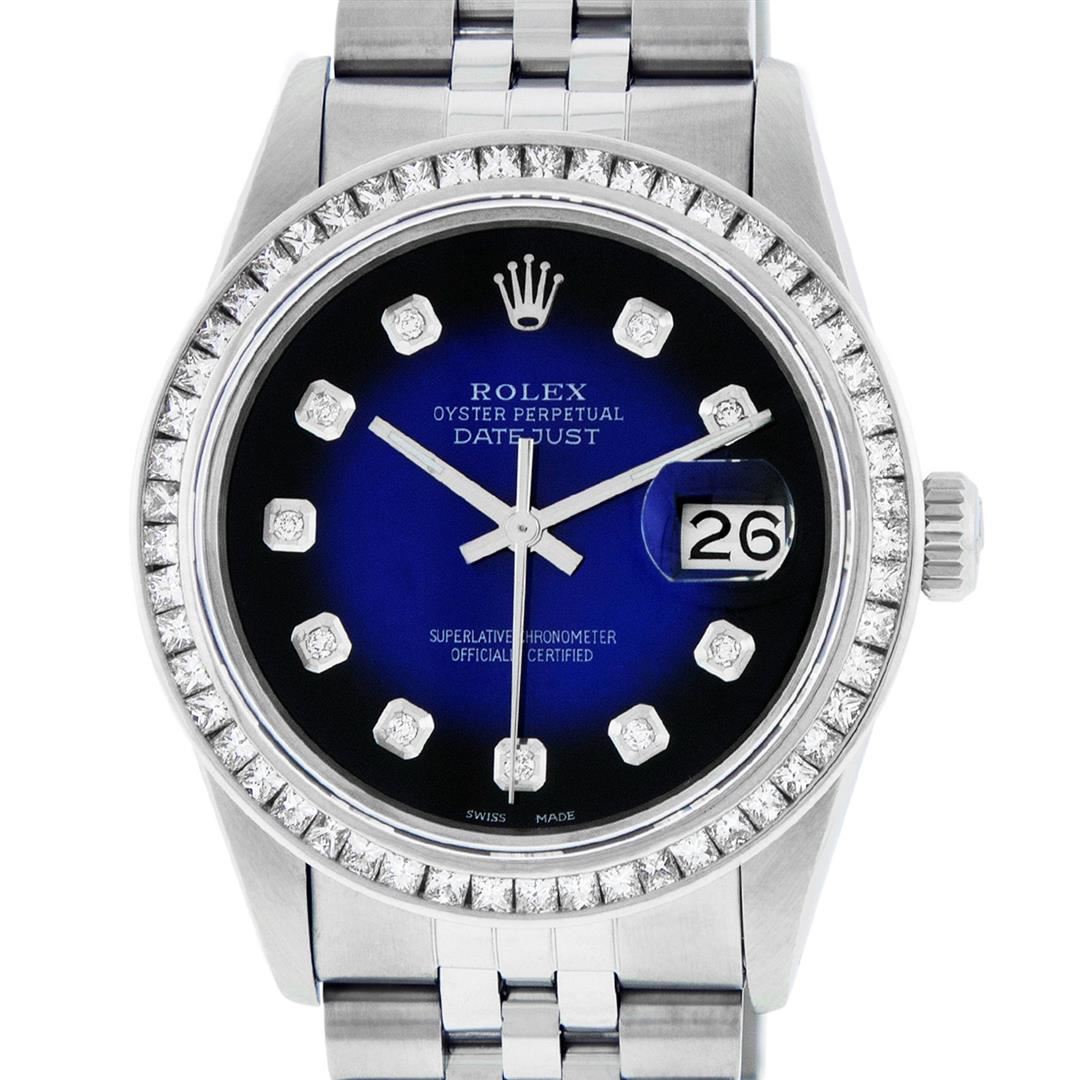 One Mens Stainless Steel Rolex Datejust Polished Bright with Satin Finish, Fully Serviced & Electronically Tested, Stainless Steel Case:36mm, Stainless Steel Crown, Custom Bezel: 14K White Gold 2.75 Carat Princess Cut Diamond Bezel, Diamond Count: 53 Diamonds, Total Weight 2.75 Carat, Clarity: SI-VS, Color: G to H. Custom Crystal: New Synthetic Sapphire Cyclops Lens. Custom Hands: New Luminescent Hands. Movement: Automatic Winding Movement Caliber 3035. Custom Dial: Blue Vignette Diamond Dial, 10 Diamonds in Dial, G To H In Color, Clarity: SI-VS. Date Window: 3 O'Clock Position Date Display, Quickset, Model: Datejust 36mm, Condition: G-6 Extra Fine. Bracelet: Rolex Stainless Steel Jubilee Band. Bright Polish & Satin Finish. 7.0 Inch Length, Adjustable. Standard Clasp, With Rolex Logo. This watch has been serviced and polished and its free of all dents and scratches and has been time tested.