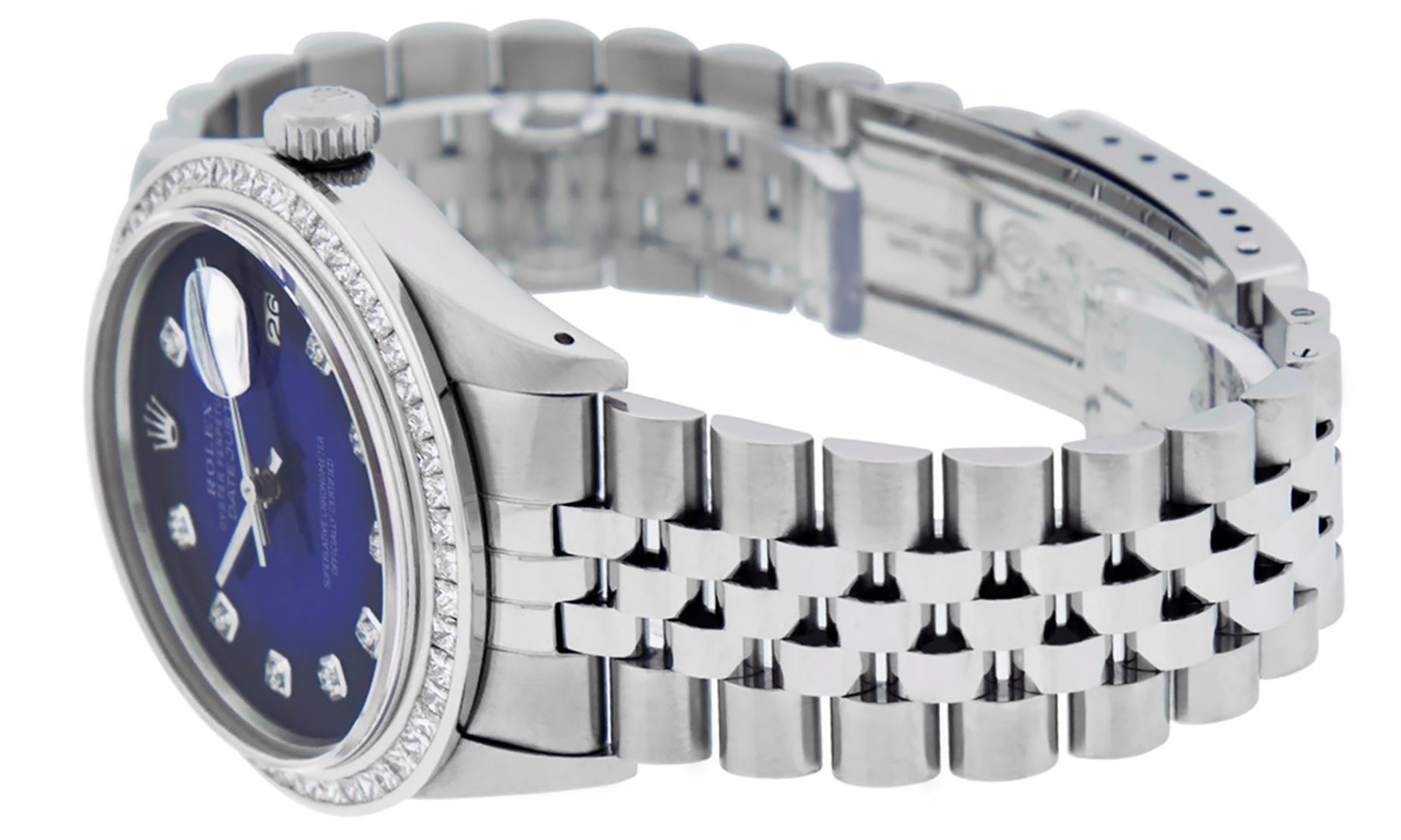 One Mens Stainless Steel Rolex Datejust Polished Bright with Satin Finish, Fully Serviced & Electronically Tested, Stainless Steel Case:36mm, Stainless Steel Crown, Custom Bezel: 14K White Gold 2.75 Carat Princess Cut Diamond Bezel, Diamond Count: 53 Diamonds, Total Weight 2.75 Carat, Clarity: SI-VS, Color: G to H. Custom Crystal: New Scratch Resistant Synthetic Sapphire Cyclops Lens. Custom Hands: New Luminecent Hands. Movement: Automatic Winding Movement. Custom Dial: Blue Vignette Diamond Dial, 10 Diamonds in Dial, G To H In Color, Clarity: SI-VS. Date Window: 3 O'Clock Position Date Display, Quickset, Model: Datejust 36mm, Condition: G-6 Extra Fine. Bracelet: Rolex Stainless Steel Jubilee Band. Bright Polish & Satin Finish. 7.0 Inch Length, Adjustable. Standard Clasp, With Rolex Logo. Watch Has Been Serviced And Polished It Is Free Of All Scratches And Dents.