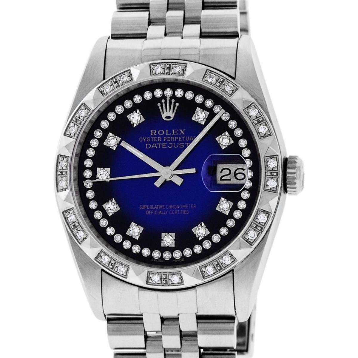 One Mens Rolex Datejust Polished Bright with Satin Finish, Serviced & Electronically Tested, Stainless Steel Case: 36mm, Stainless Steel Crown, New Custom Bezel: 18K White Gold Pyramid Diamond Bezel, Diamond Count: 24 Diamonds On Bezel, Total Weight .75 Carat, Clarity: SI-VS, Color: G to H. Custom Crystal: New Scratch Resistant Synthetic Sapphire Cyclops Lens. Custom Hands: New Luminecent Hands. Movement: Automatic Winding Movement Caliber 3035. Custom Refinished Dial: Blue Vignette String Single Cut Diamond Dial, Diamond Count: 58 Diamonds On Dial, Diamond Color: G To H In Color, Clarity: VS. Date Window: 3 O'Clock Position Date Display, Quickset, Model: Datejust Condition: G-6 Extra Fine. Bracelet: Stainless Steel Jubilee Band. Bright Polish & Satin Finish. 7.0 Inch Length, Adjustable. Standard Clasp, With Rolex Logo. This Watch Has Been Serviced And Polished And Its Free Of All Dents And Scratches.
