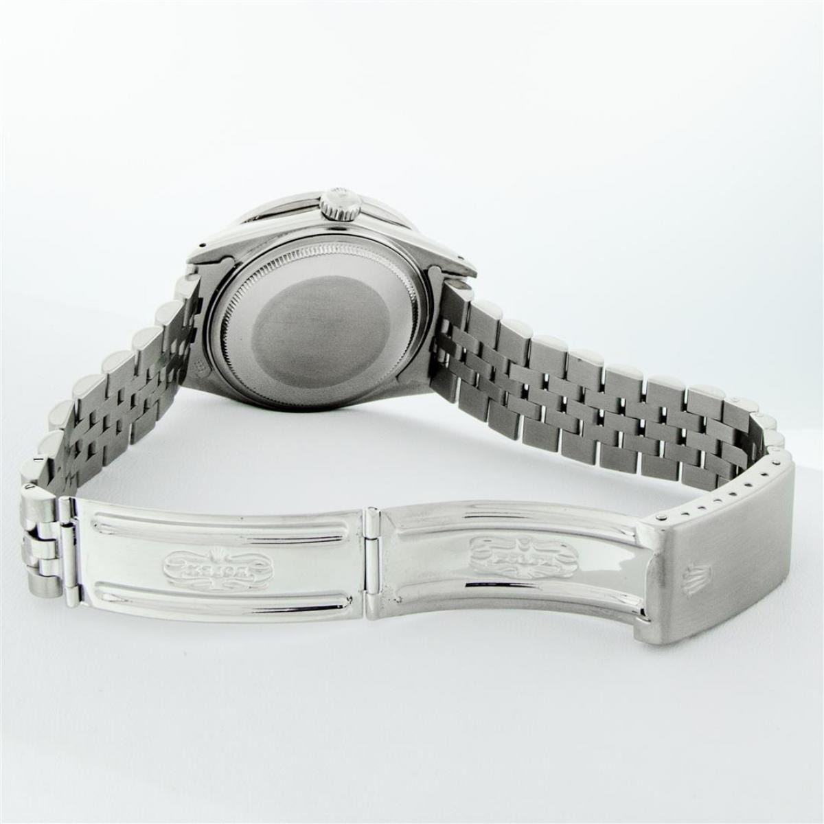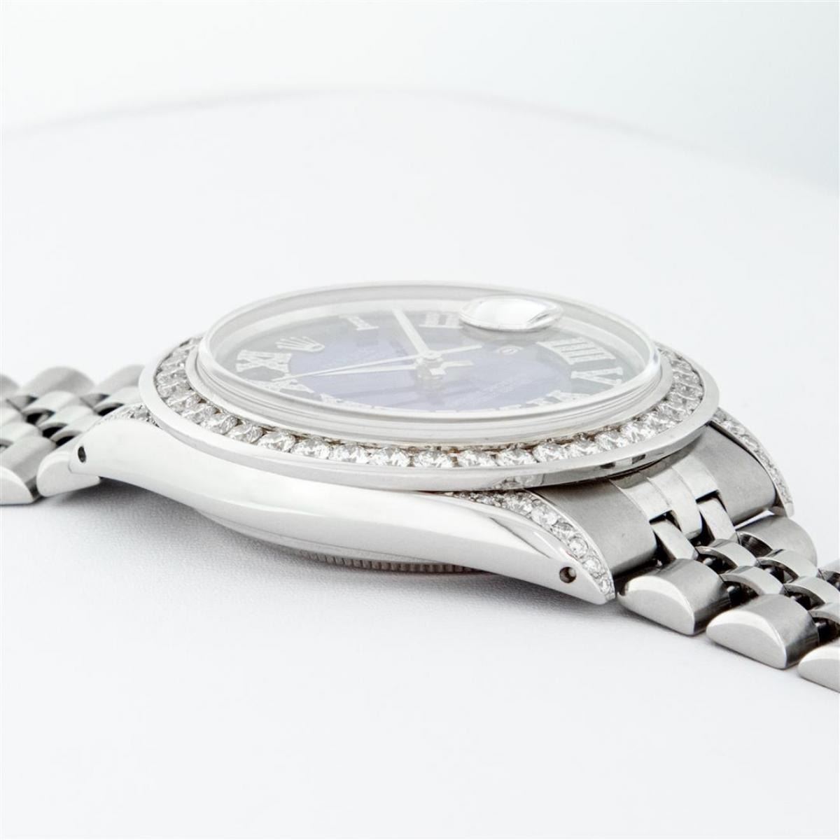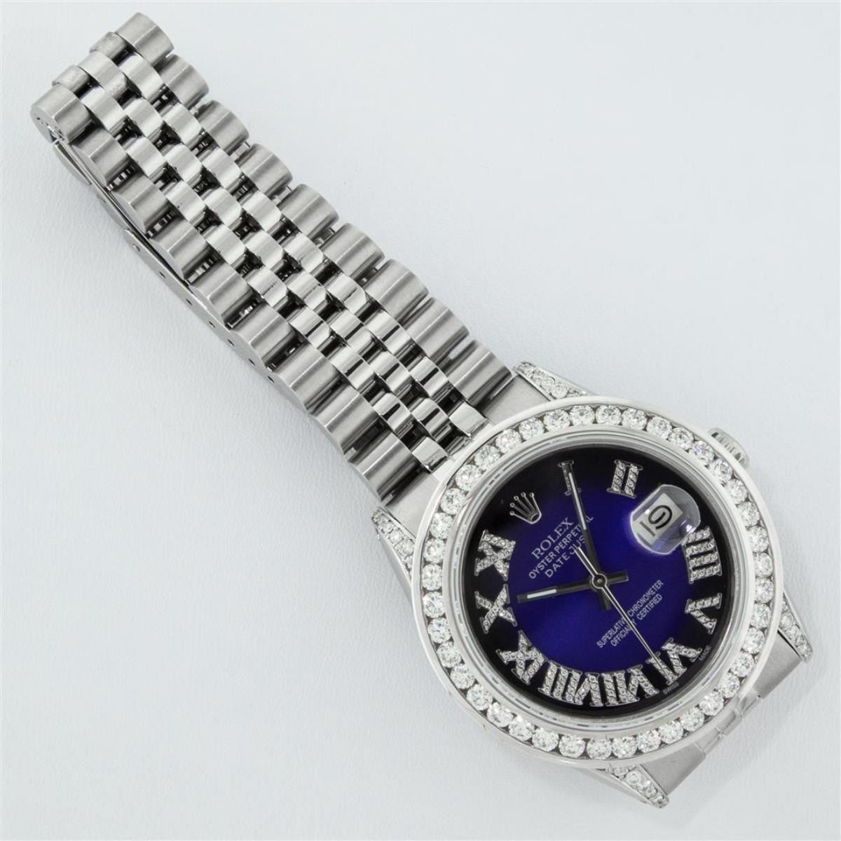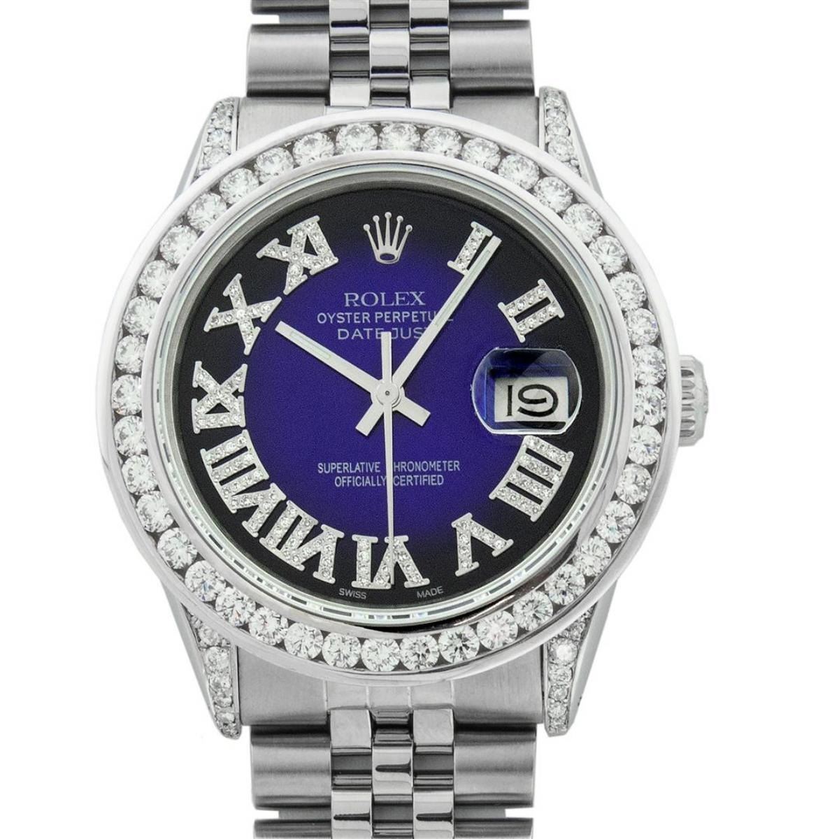 One Mens Stainless Steel Rolex Datejust Polished Bright with Satin Finish, Serviced & Electronically Tested, Stainless Steel Case: 36mm, Diamond Lugs: 24 Diamonds On Lugs, Color: G to H, Clarity: SI-VS. Stainless Steel Crown, New Custom Bezel: 18K White Gold 3.00 Ctw Diamond Bezel, Diamond Count: 40 Diamonds, Total Weight 3.0 Carat, Clarity: SI-VS, Color: G to H. Custom Crystal: New Scratch Resistant Synthetic Sapphire Cyclops Lens. Movement: Automatic Winding Movement. Custom Dial: Blue Vignette Roman Diamond Dial, Diamond Color: G To H In Color, Clarity: SI-VS. Date Window: 3 O'Clock Position Date Display, Quickset, Model: Quickset Datejust, Condition: G-6 Extra Fine. Bracelet: Stainless Steel Jubilee Band. Bright Polish & Satin Finish. 7.0 Inch Length, Adjustable. Standard Clasp, With Rolex Logo. This Watch Has Been Serviced Time Tested And Is In Excellent Condition It Is Free Of All Scratches And Dents.