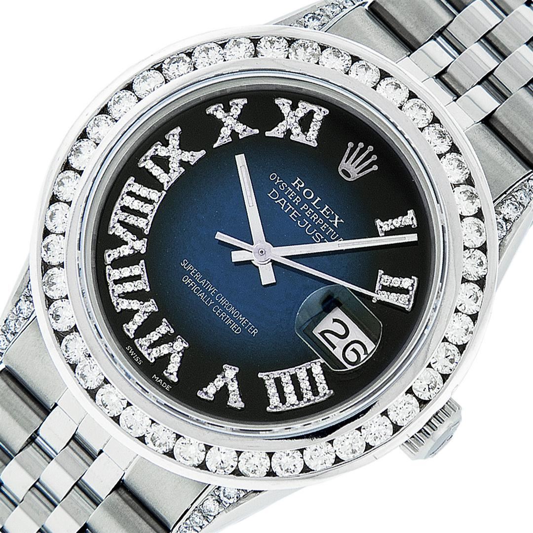 One Mens Stainless Steel Rolex Datejust Polished Bright with Satin Finish, Serviced & Electronically Tested, Stainless Steel Case: 36mm, Diamond Lugs: 24 Diamonds On Lugs, Color: G to H, Clarity: SI-VS. Stainless Steel Crown, New Custom Bezel: 18K White Gold 3.00 Ctw Diamond Bezel, Diamond Count: 40 Diamonds, Total Weight 3.0 Carat, Clarity: SI-VS, Color: G to H. Custom Crystal: New Scratch Resistant Synthetic Sapphire Cyclops Lens. Movement: Automatic Winding Movement. Custom Dial: Blue Vignette Roman Diamond Dial, Diamond Color: G To H In Color, Clarity: SI-VS. Date Window: 3 O'Clock Position Date Display, Quickset, Model: Quickset Datejust, Condition: G-6 Extra Fine. Bracelet: Stainless Steel Jubilee Band. Bright Polish & Satin Finish. 7.0 Inch Length, Adjustable. Standard Clasp, With Rolex Logo. This Watch Has Been Serviced Time Tested And Is In Excellent Condition It Is Free Of All Scratches And Dents.