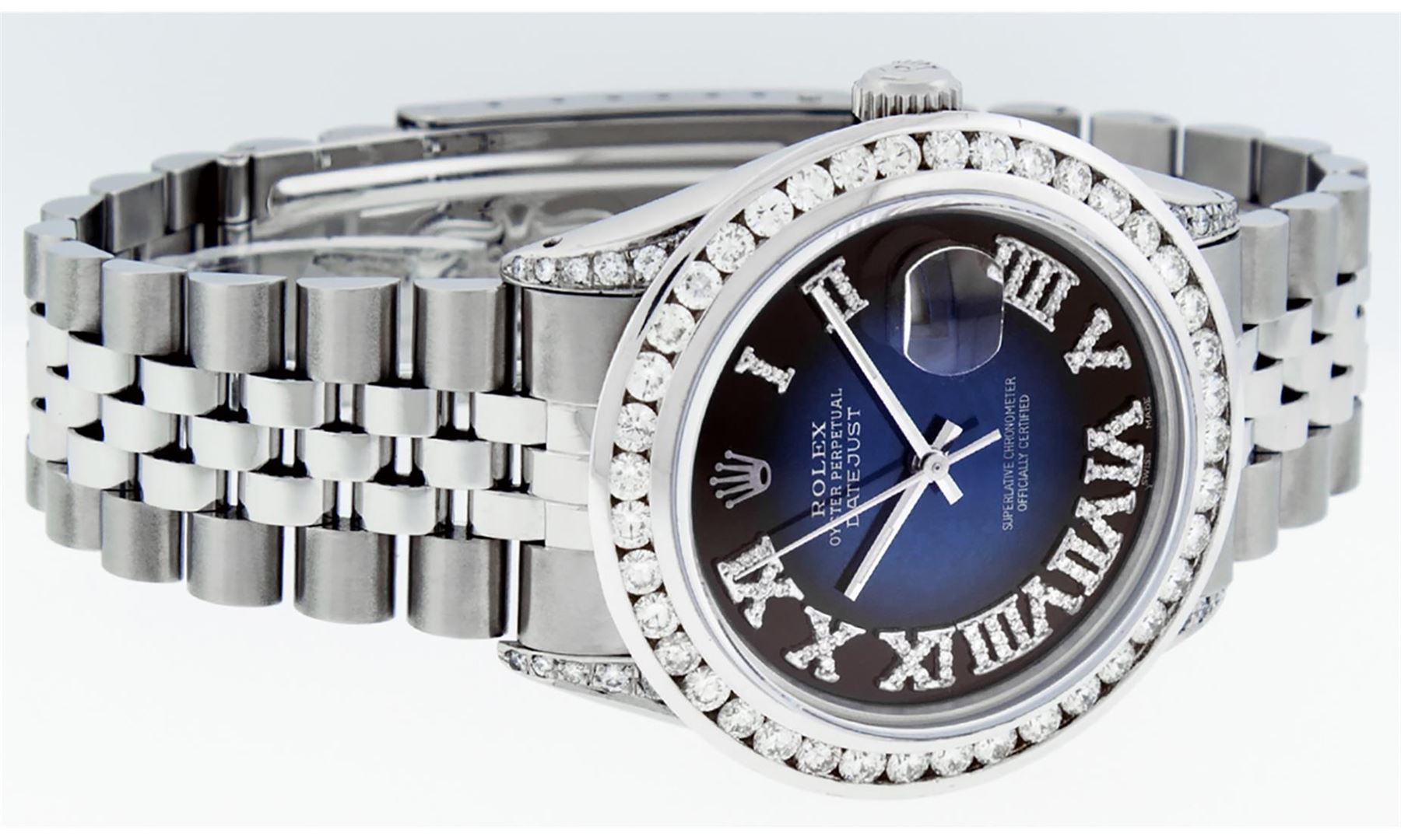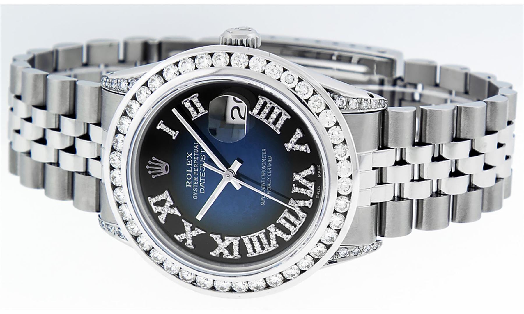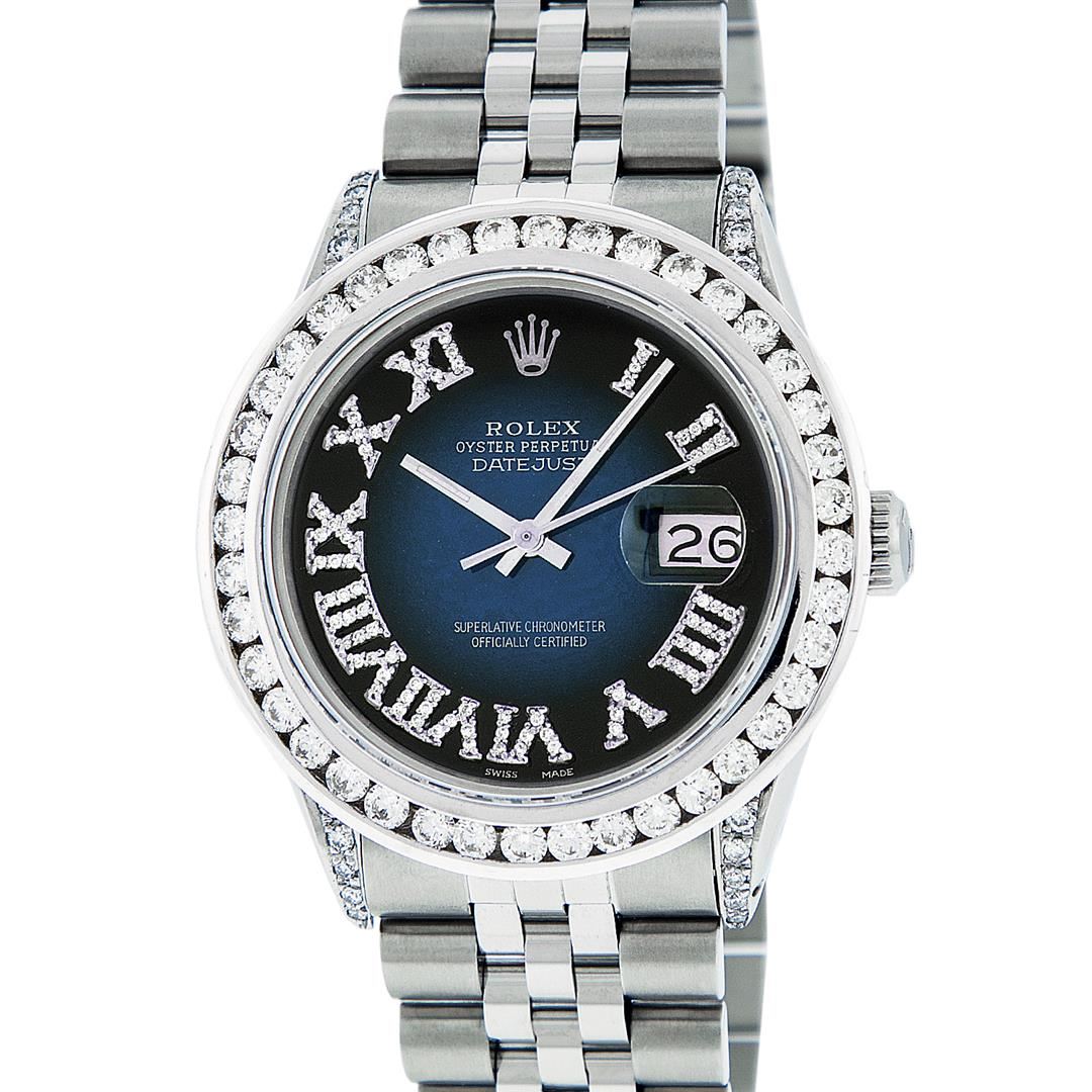 One Mens Stainless Steel Rolex Datejust Polished Bright with Satin Finish, Serviced & Electronically Tested, Stainless Steel Case: 36mm, Diamond Lugs: 24 Diamonds On Lugs, Color: G to H, Clarity: SI-VS. Stainless Steel Crown, New Custom Bezel: 18K White Gold 3.00 Ctw Diamond Bezel, Diamond Count: 40 Diamonds, Total Weight 3.0 Carat, Clarity: SI-VS, Color: G to H. Custom Crystal: New Scratch Resistant Synthetic Sapphire Cyclops Lens. Movement: Automatic Winding Movement Caliber 3035. Custom Dial: Blue Vignette Roman Diamond Dial, Diamond Color: G To H In Color, Clarity: SI-VS. Date Window: 3 O'Clock Position Date Display, Quickset, Model: Quickset Datejust, Condition: G-6 Extra Fine. Bracelet: Stainless Steel Jubilee Band. Bright Polish & Satin Finish. 7.0 Inch Length, Adjustable. Standard Clasp, With Rolex Logo. This Watch Has Been Serviced Time Tested And Is In Excellent Condition It Is Free Of All Scratches And Dents. This Watch Also Comes With A Brand New Wooden Watch Winder.