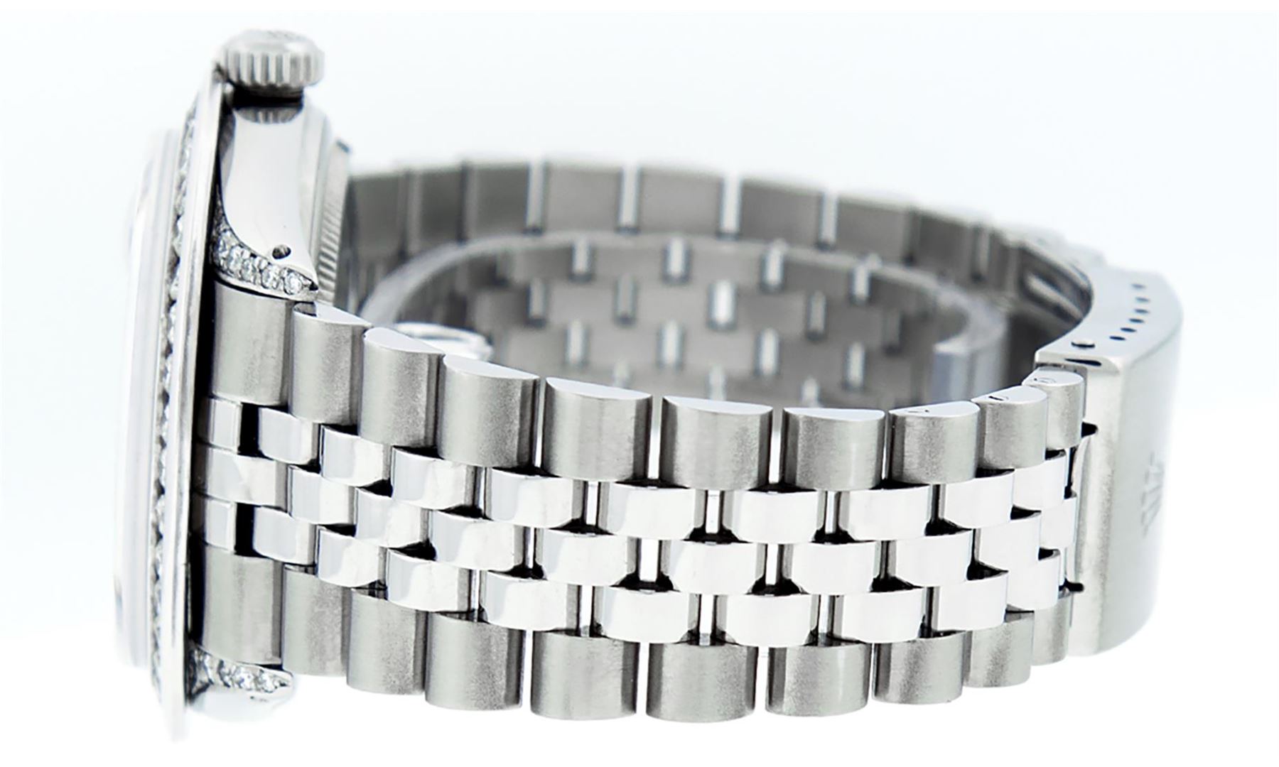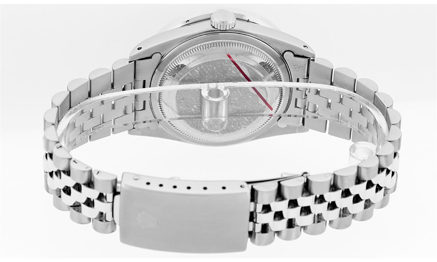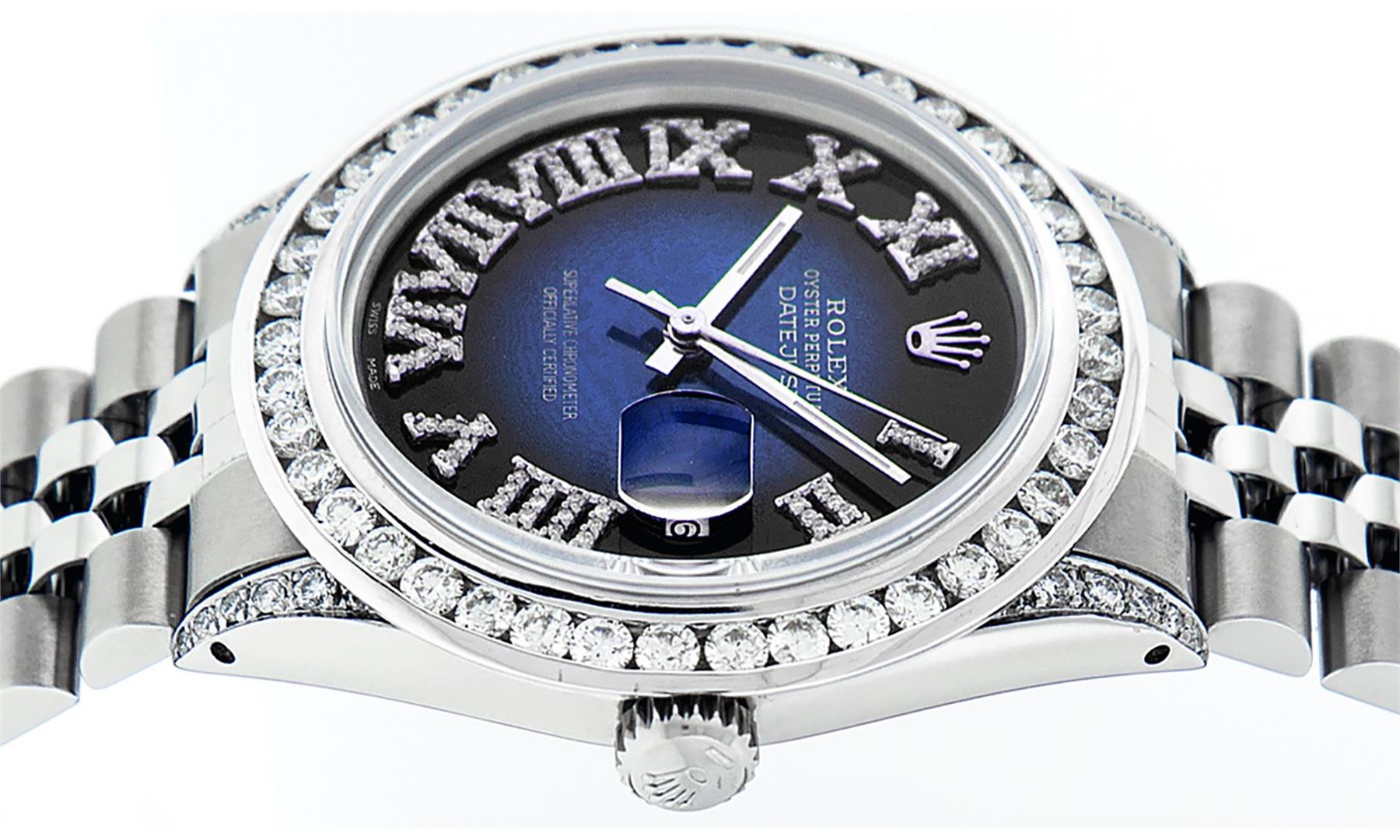 One Mens Stainless Steel Rolex Datejust Polished Bright with Satin Finish, Serviced & Electronically Tested, Stainless Steel Case: 36mm, Diamond Lugs: 24 Diamonds On Lugs, Color: G to H, Clarity: SI-VS. Stainless Steel Crown, New Custom Bezel: 18K White Gold 3.00 Ctw Diamond Bezel, Diamond Count: 40 Diamonds, Total Weight 3.0 Carat, Clarity: SI-VS, Color: G to H. Custom Crystal: New Scratch Resistant Synthetic Sapphire Cyclops Lens. Movement: Automatic Winding Movement Caliber 3035. Custom Dial: Blue Vignette Roman Diamond Dial, Diamond Color: G To H In Color, Clarity: SI-VS. Date Window: 3 O'Clock Position Date Display, Quickset, Model: Quickset Datejust, Condition: G-6 Extra Fine. Bracelet: Stainless Steel Jubilee Band. Bright Polish & Satin Finish. 7.0 Inch Length, Adjustable. Standard Clasp, With Rolex Logo. This Watch Has Been Serviced Time Tested And Is In Excellent Condition It Is Free Of All Scratches And Dents. This Watch Also Comes With A Brand New Wooden Watch Winder.
