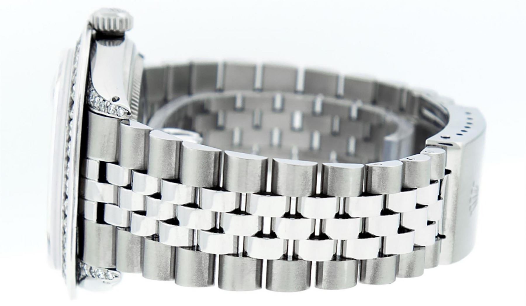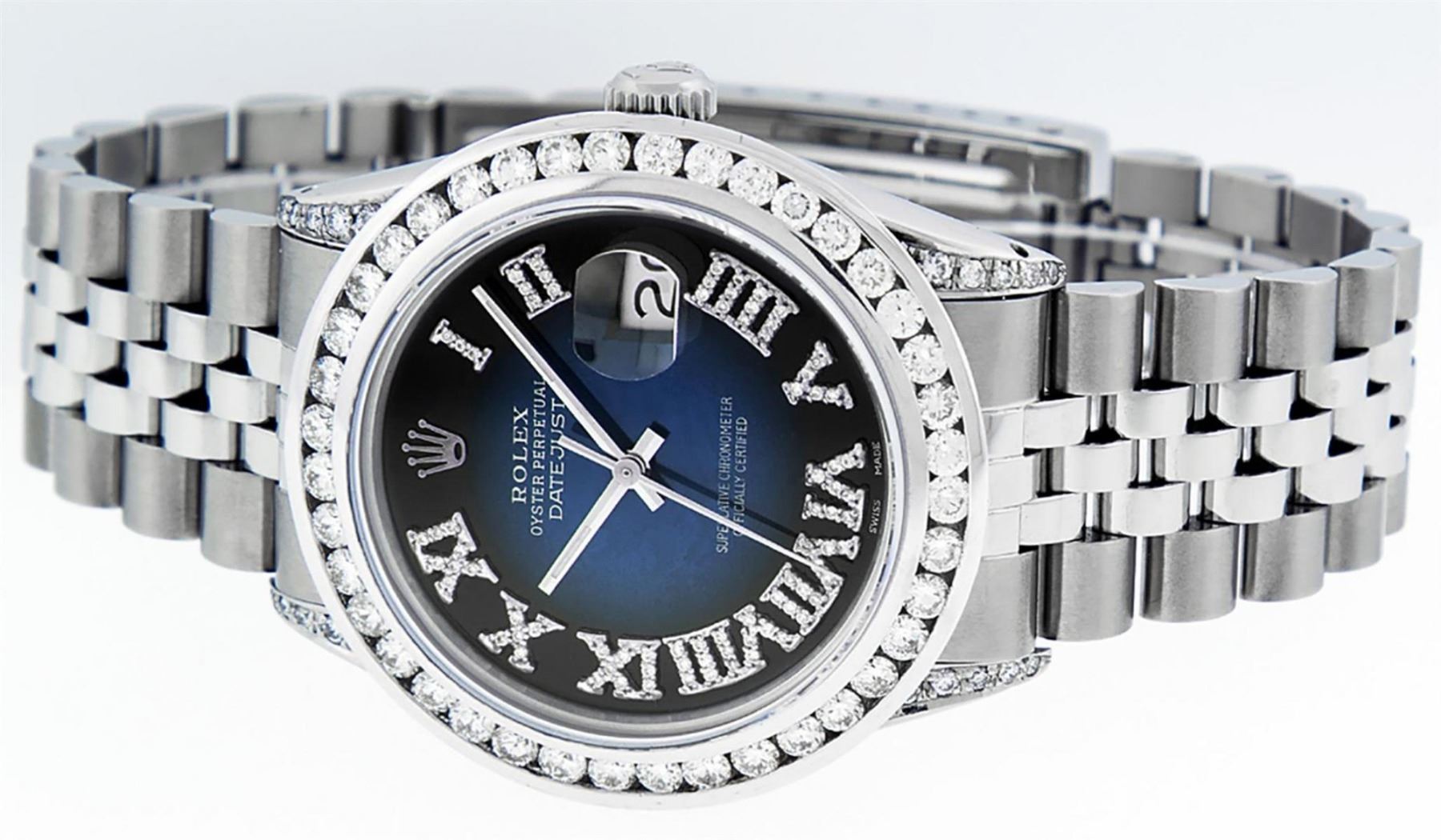 One Mens Stainless Steel Rolex Datejust Polished Bright with Satin Finish, Serviced & Electronically Tested, Stainless Steel Case: 36mm, Diamond Lugs: 24 Diamonds On Lugs, Color: G to H, Clarity: SI-VS. Stainless Steel Crown, New Custom Bezel: 18K White Gold 3.00 Ctw Diamond Bezel, Diamond Count: 40 Diamonds, Total Weight 3.0 Carat, Clarity: SI-VS, Color: G to H. Custom Crystal: New Scratch Resistant Synthetic Sapphire Cyclops Lens. Movement: Automatic Winding Movement Caliber 3035. Custom Dial: Blue Vignette Roman Diamond Dial, Diamond Color: G To H In Color, Clarity: SI-VS. Date Window: 3 O'Clock Position Date Display, Quickset, Model: Quickset Datejust, Condition: G-6 Extra Fine. Bracelet: Stainless Steel Jubilee Band. Bright Polish & Satin Finish. 7.0 Inch Length, Adjustable. Standard Clasp, With Rolex Logo. This Watch Has Been Serviced Time Tested And Is In Excellent Condition It Is Free Of All Scratches And Dents. This Watch Also Comes With A Brand New Wooden Watch Winder.