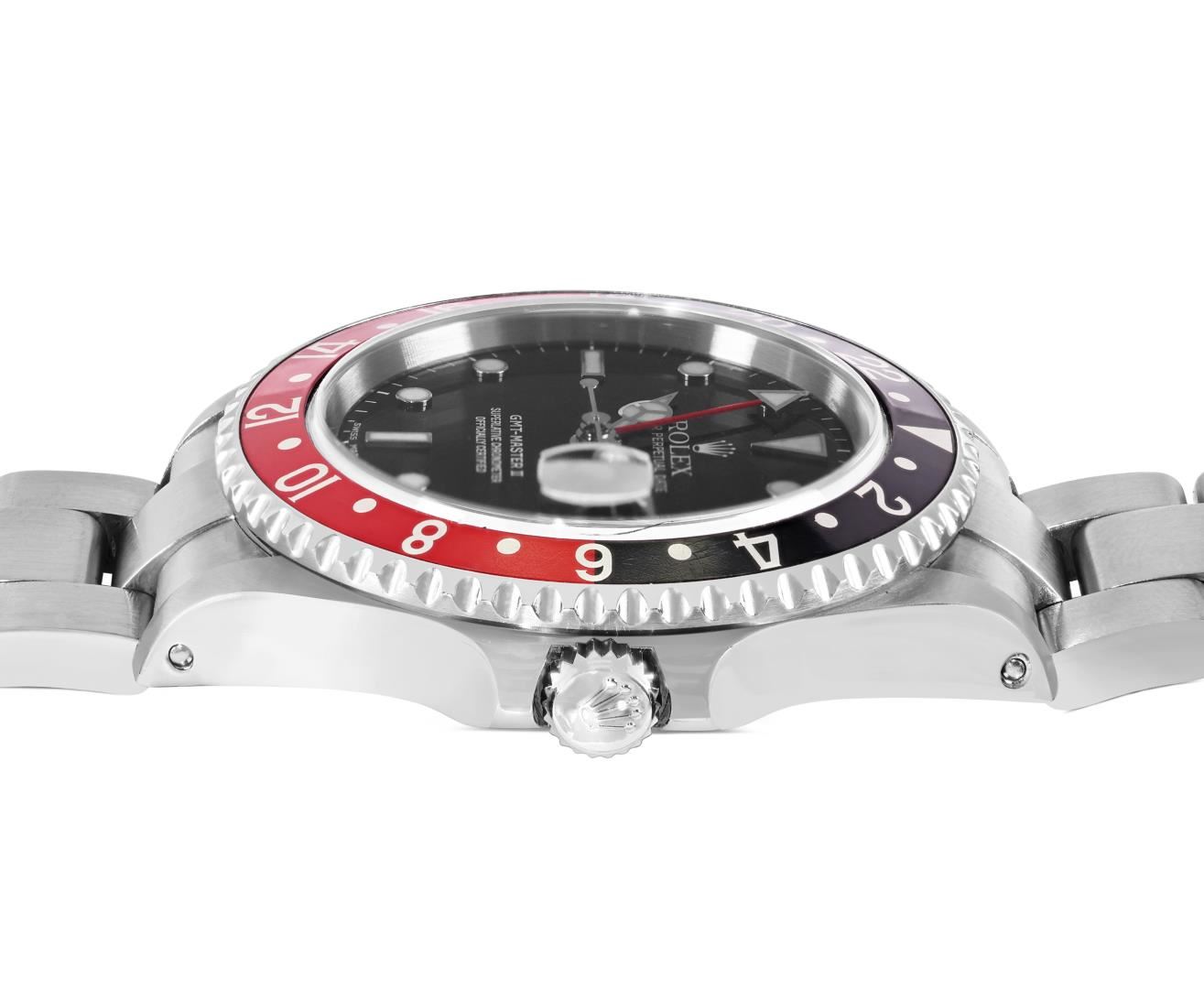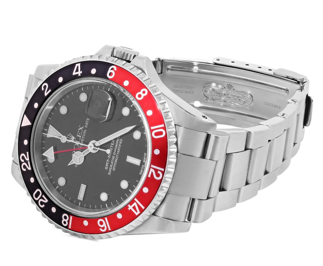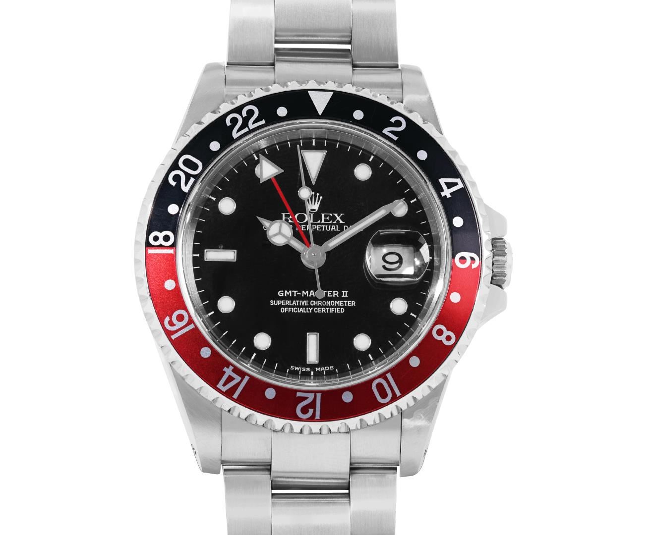 One Mens Pre Owned Rolex Stainless Steel GMT Master 2 Polished, Serviced And Electronically Tested, Rolex Stainless Steel Case: 40mm, Rolex Stainless Steel Crown, Rolex Bezel: Stainless Steel Bi Directional Rotatable Bezel With Black And Red Insert. Rolex Crystal: Sapphire Crystal With Magnified Date Window. Rolex Movement: Automatic Winding Movement Caliber 3185. Dial: Black Dial. Functions: GMT Hand. Date Window: 3 O'Clock Position Date Display, Model: GMT Master 2, Quickset, Condition: G-6 Extra Fine. Rolex Bracelet: Stainless Steel Oyster Band. Bright Polish And Satin Finish. 7.0 Inch Length, Adjustable. Standard Clasp, With Rolex Logo. This Watch Has Been Serviced Time Tested And Is In Excellent Condition It Is Free Of All Scratches And Dents. This Watch Comes With A Rolex Box.