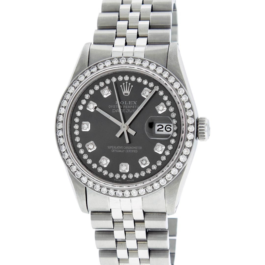 One Mens Rolex Datejust Polished Bright with Satin Finish, Serviced & Electronically Tested, Stainless Steel Case:36mm, Stainless Steel Crown, Custom Bezel: Stainless Steel Beadset Diamond Bezel, Diamond Count: 54 Diamonds Total Weight 1.00 Carat, Clarity: SI-VS, Color: G to H. Custom Crystal: Synthetic Sapphire Cyclops Lens. Movement: Automatic Winding Movement Caliber 3035. Custom Dial: Dark Rhodium String Diamond Dial, Diamond Count: 58 Diamonds In Dial, Color: G to H, Clarity: VS2-SI1. Date Window: 3 O'Clock Position Date Display, Quickset, Model: Datejust. Condition: G-6 Extra Fine. Bracelet:Stainless Steel Jubilee. Bright Polish & Satin Finish. 7.0 Inch Length, Adjustable. Standard Clasp, With Rolex Logo. This watch has been serviced time tested and is in excellent condition it is free of all scratches and dents.
