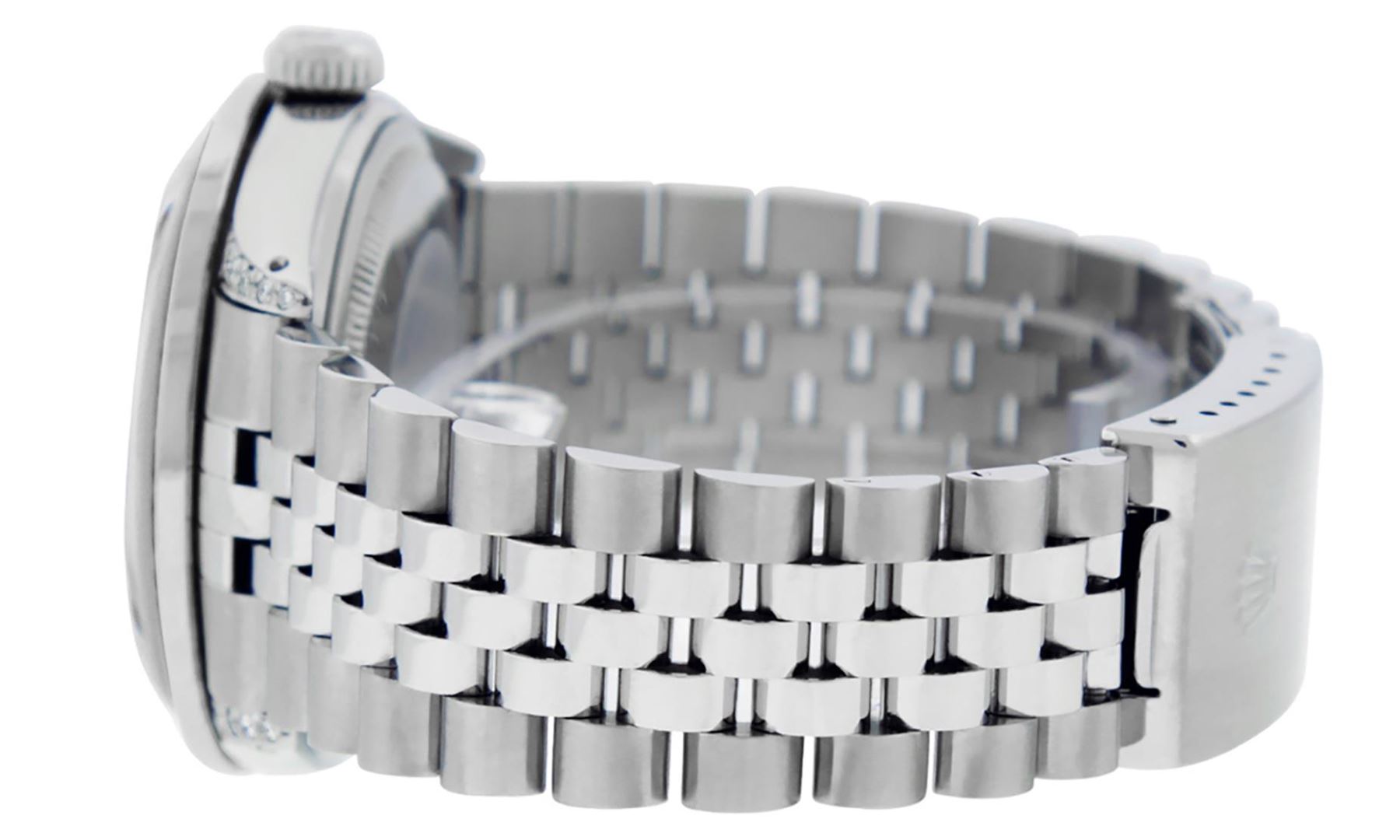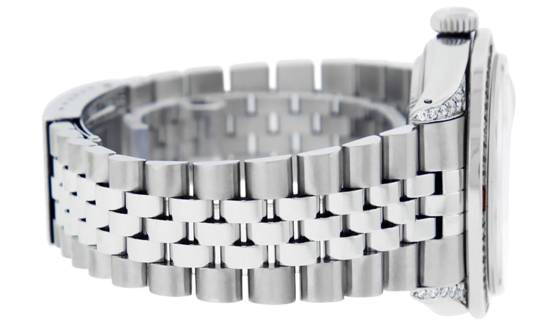 One Mens Rolex Datejust Polished Bright with Satin Finish, Serviced And Electronically Tested, Stainless Steel Case: 36mm, Custom Diamond Lugs: 28 Diamonds In Lugs. Stainless Steel Crown, Custom Bezel: New 18K White Gold Ruby Channel Set Diamond Bezel, Diamond + Gem Count: 52 Diamonds + 4 Rubies. Custom Crystal: New Sapphire With Magnified Date Window. Custom Hands: New Luminescent Hands. Rolex Movement: Automatic Winding Movement 3035. Custom Dial: Custom White Dial With Added Diamond Hour Markers, Diamond Count: 10 Diamonds In Dial. Date Window: 3 O'Clock Position Date Display, Quickset, Model: Datejust Condition: G-6 Extra Fine. Rolex Bracelet: Stainless Steel Jubilee Band. Bright Polish And Satin Finish. 7.0 Inch Length, Adjustable. Standard Clasp, With Rolex Logo. This Watch Has Been Serviced And Polished And Its Free Of All Dents And Scratches.