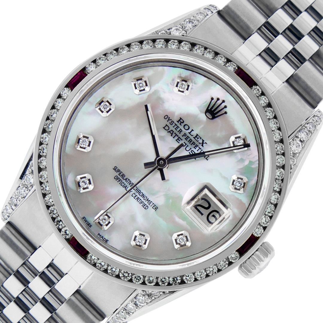 One Mens Rolex Datejust Polished Bright with Satin Finish, Serviced And Electronically Tested, Stainless Steel Case: 36mm, Custom Diamond Lugs: 28 Diamonds In Lugs. Stainless Steel Crown, Custom Bezel: New 18K White Gold Ruby Channel Set Diamond Bezel, Diamond + Gem Count: 52 Diamonds + 4 Rubies. Custom Crystal: New Sapphire With Magnified Date Window. Custom Hands: New Luminescent Hands. Rolex Movement: Automatic Winding Movement 3035. Custom Dial: Custom White Dial With Added Diamond Hour Markers, Diamond Count: 10 Diamonds In Dial. Date Window: 3 O'Clock Position Date Display, Quickset, Model: Datejust Condition: G-6 Extra Fine. Rolex Bracelet: Stainless Steel Jubilee Band. Bright Polish And Satin Finish. 7.0 Inch Length, Adjustable. Standard Clasp, With Rolex Logo. This Watch Has Been Serviced And Polished And Its Free Of All Dents And Scratches.