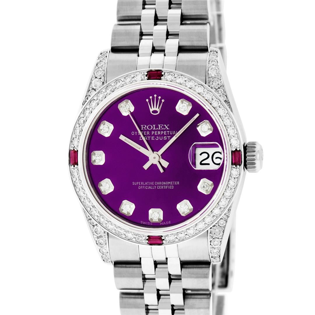 One Mens Rolex Datejust Polished Bright with Satin Finish, Serviced & Electronically Tested, Stainless Steel Case: 36mm, Custom Diamond Lugs: 28 Diamonds In Lugs, Color: G to H, Clarity: SI-VS. Stainless Steel Crown, Custom Bezel: 18K White Gold Diamond + Ruby Beadset, Diamond Count: 36 Diamonds + 4 Rubies, Total Weight 1.00 Carat, Clarity: SI-VS, Color: G to H. Custom Crystal: New Scratch Resistant Synthetic Sapphire Cyclops Lens. Custom Hands: New Luminescent Hands. Movement: Automatic Winding Movement Caliber 3035. Custom Dial: Purple Diamond Dial, Stone Count: 10 Diamonds On Dial, Diamond Color: G To H In Color, Clarity: VS. Date Window: 3 O'Clock Position Date Display, Quickset, Model: Datejust Condition: G-6 Extra Fine. Bracelet: Stainless Steel Jubilee Band. Bright Polish & Satin Finish. 7.0 Inch Length, Adjustable. Standard Clasp, With Rolex Logo. This Watch Has Been Serviced And Polished And Its Free Of All Dents And Scratches.