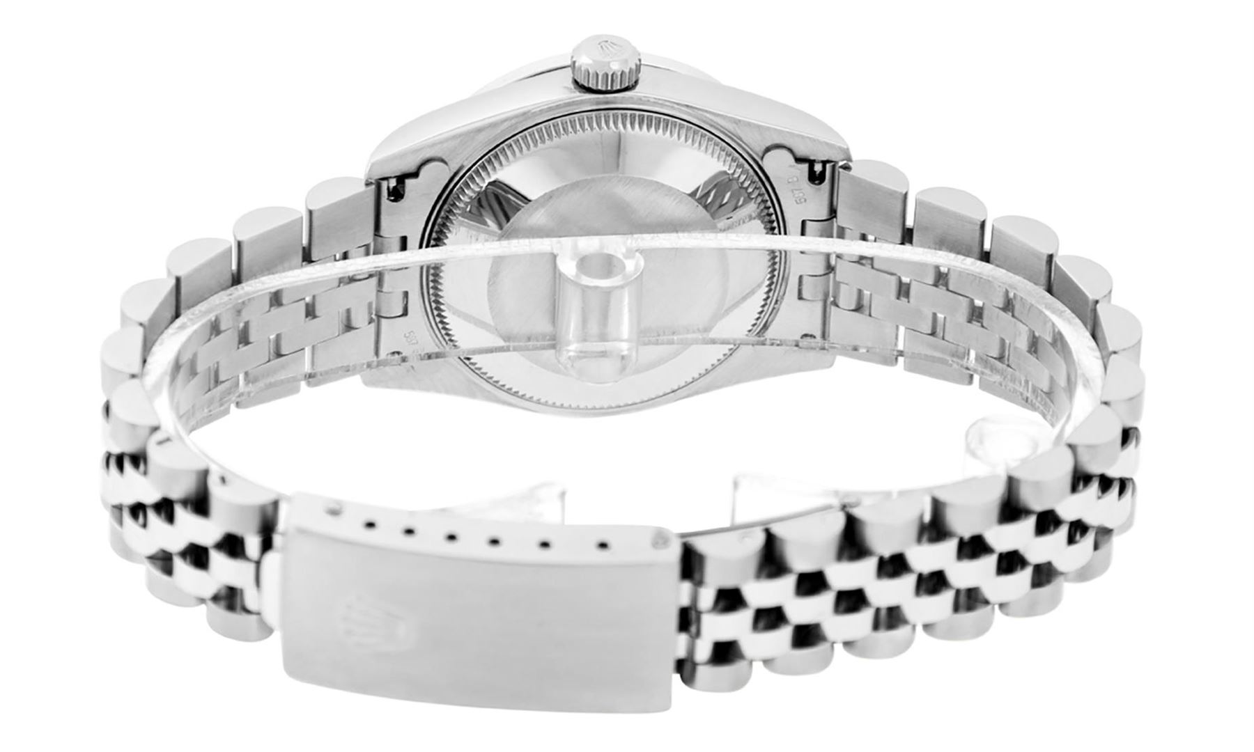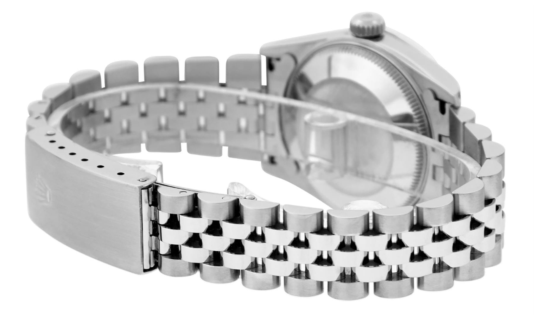 One Mens Rolex Datejust Polished Bright with Satin Finish, Serviced & Electronically Tested, Stainless Steel Case: 36mm, Custom Diamond Lugs: 28 Diamonds In Lugs, Color: G to H, Clarity: SI-VS. Stainless Steel Crown, Custom Bezel: 18K White Gold Diamond + Ruby Beadset, Diamond Count: 36 Diamonds + 4 Rubies, Total Weight 1.00 Carat, Clarity: SI-VS, Color: G to H. Custom Crystal: New Scratch Resistant Synthetic Sapphire Cyclops Lens. Custom Hands: New Luminescent Hands. Movement: Automatic Winding Movement Caliber 3035. Custom Dial: Purple Diamond Dial, Stone Count: 10 Diamonds On Dial, Diamond Color: G To H In Color, Clarity: VS. Date Window: 3 O'Clock Position Date Display, Quickset, Model: Datejust Condition: G-6 Extra Fine. Bracelet: Stainless Steel Jubilee Band. Bright Polish & Satin Finish. 7.0 Inch Length, Adjustable. Standard Clasp, With Rolex Logo. This Watch Has Been Serviced And Polished And Its Free Of All Dents And Scratches.