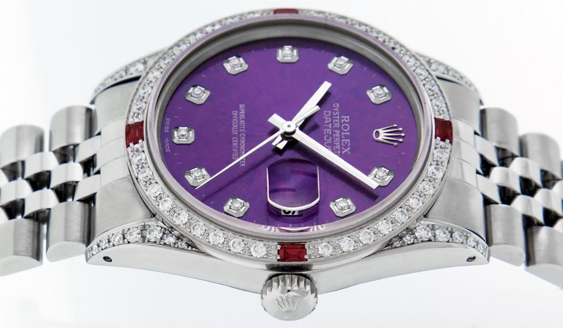 One Mens Rolex Datejust Polished Bright with Satin Finish, Serviced & Electronically Tested, Stainless Steel Case: 36mm, Custom Diamond Lugs: 28 Diamonds In Lugs, Color: G to H, Clarity: SI-VS. Stainless Steel Crown, Custom Bezel: 18K White Gold Diamond + Ruby Beadset, Diamond Count: 36 Diamonds + 4 Rubies, Total Weight 1.00 Carat, Clarity: SI-VS, Color: G to H. Custom Crystal: New Scratch Resistant Synthetic Sapphire Cyclops Lens. Custom Hands: New Luminescent Hands. Movement: Automatic Winding Movement Caliber 3035. Custom Dial: Purple Single Cut Diamond Dial With Dash Track, Stone Count: 10 Diamonds In Dial, Diamond Color: G To H In Color, Clarity: VS. Date Window: 3 O'Clock Position Date Display, Quickset, Model: Datejust Condition: G-6 Extra Fine. Bracelet: Stainless Steel Jubilee Band. Bright Polish & Satin Finish. 7.0 Inch Length, Adjustable. Standard Clasp, With Rolex Logo. This Watch Has Been Serviced And Polished And Its Free Of All Dents And Scratches.