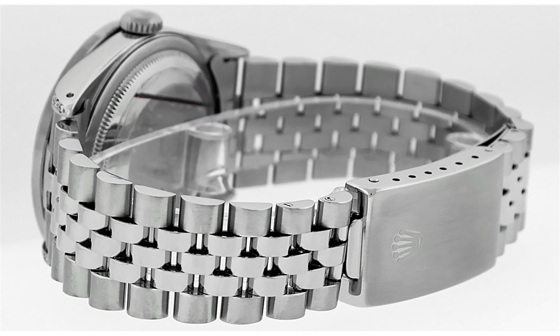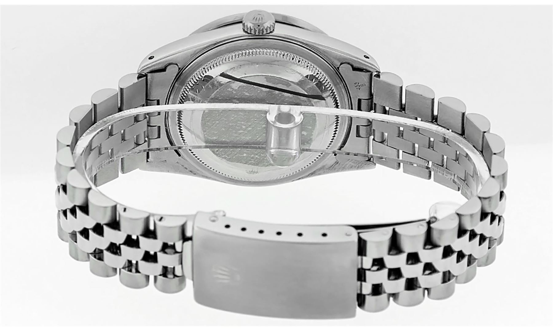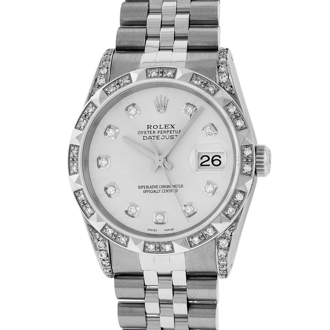 One Mens Rolex Datejust Polished Bright with Satin Finish, Serviced & Electronically Tested, Stainless Steel Case: 36mm, Custom Diamonds On Lugs: 28 Diamonds On Lugs, Color: G to H, Clarity: SI-VS. Stainless Steel Crown, Custom Bezel: 18K White Gold Pyramid Diamond Bezel, Diamond Count: 24 Diamonds On Bezel, Total Weight .75 Carat, Clarity: SI-VS, Color: G to H. Custom Crystal: New Synthetic Sapphire Cyclops Lens. Custom Hands: New Solid Hands. Movement: Automatic Winding Movement Caliber 3035. Custom Dial: Silver Diamond Dial, Diamond Count: 10 Diamonds In Dial, Diamond Color: G To H In Color, Clarity: SI-VS. Date Window: 3 O'Clock Position Date Display, Quickset, Model: Datejust Condition: G-6 Extra Fine. Bracelet: Stainless Steel Jubilee Band. Bright Polish & Satin Finish. 7.0 Inch Length, Adjustable. Standard Clasp, With Rolex Logo. This Watch Has Been Serviced And Polished And Its Free Of All Dents And Scratches.