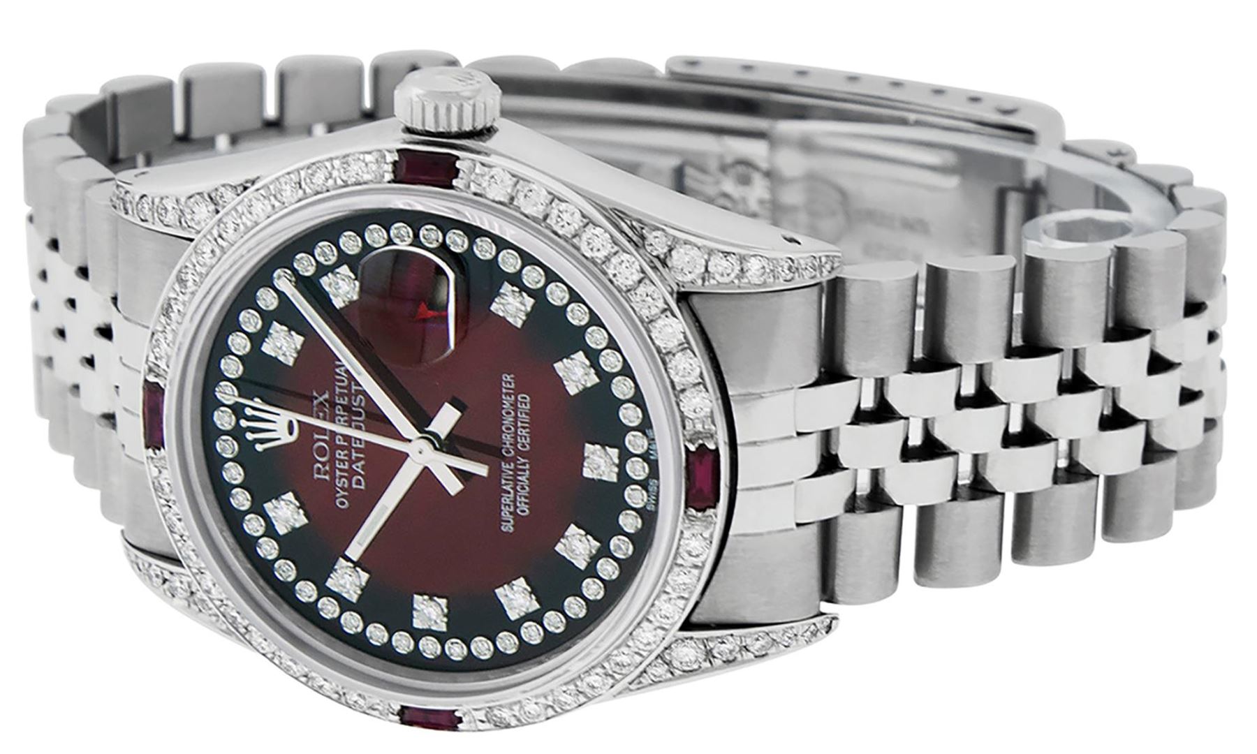 One Mens Pre Owned Stainless Steel Rolex Datejust Polished Bright with Satin Finish, Serviced And Electronically Tested, Rolex Stainless Steel Case: 36mm, Custom Diamond Lugs: 28 Diamonds In Lugs. Rolex Stainless Steel Crown, Custom Bezel: New 18K White Gold Diamond + Ruby Beadset, Diamond Count: 36 Diamonds + 4 Rubies. Custom Crystal: New Sapphire With Date Window. Custom Hands: New Luminescent Hands. Rolex Movement: Automatic Winding Movement 3035. Custom Dial: Custom Red Vignette Dial With Added Diamond Hour Markers, Stone Count: 58 Diamonds In Dial. Date Window: 3 O'Clock Position Date Display, Quickset, Model: Datejust Condition: G-6 Extra Fine. Rolex Bracelet: Stainless Steel Jubilee Band. Bright Polish And Satin Finish. 7.0 Inch Length, Adjustable. Standard Clasp, With Rolex Logo. This Watch Has Been Serviced And Polished And Its Free Of All Dents And Scratches.