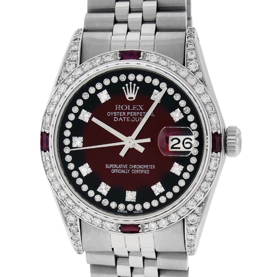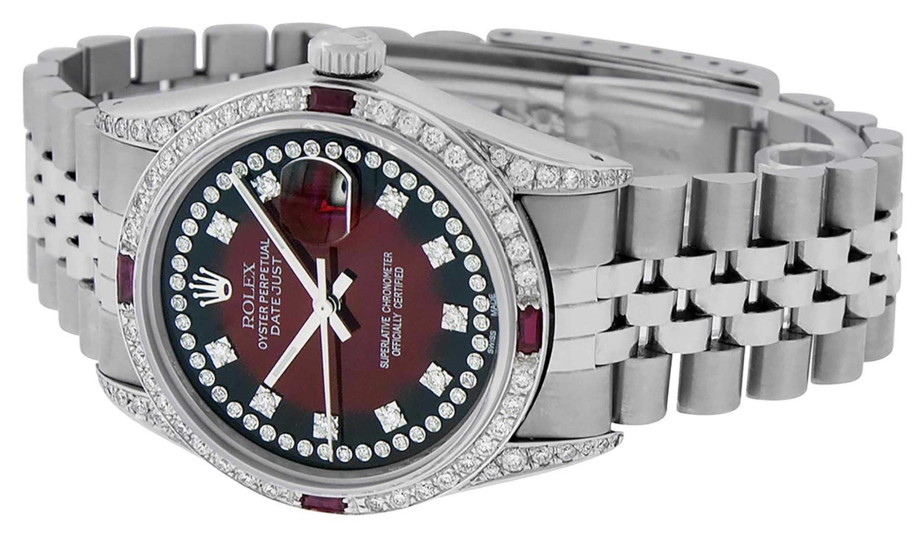 One Mens Pre Owned Stainless Steel Rolex Datejust Polished Bright with Satin Finish, Serviced And Electronically Tested, Rolex Stainless Steel Case: 36mm, Custom Diamond Lugs: 28 Diamonds In Lugs. Rolex Stainless Steel Crown, Custom Bezel: New 18K White Gold Diamond + Ruby Beadset, Diamond Count: 36 Diamonds + 4 Rubies. Custom Crystal: New Sapphire With Date Window. Custom Hands: New Luminescent Hands. Rolex Movement: Automatic Winding Movement 3035. Custom Dial: Custom Red Vignette Dial With Added Diamond Hour Markers, Stone Count: 58 Diamonds In Dial. Date Window: 3 O'Clock Position Date Display, Quickset, Model: Datejust Condition: G-6 Extra Fine. Rolex Bracelet: Stainless Steel Jubilee Band. Bright Polish And Satin Finish. 7.0 Inch Length, Adjustable. Standard Clasp, With Rolex Logo. This Watch Has Been Serviced And Polished And Its Free Of All Dents And Scratches.