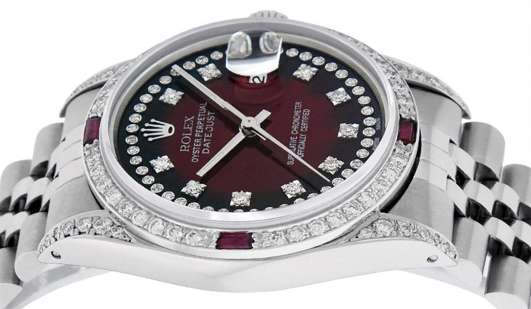 One Mens Rolex Datejust Polished Bright with Satin Finish, Serviced & Electronically Tested, Stainless Steel Case: 36mm, Custom Diamond Lugs: 28 Diamonds In Lugs, Color: G to H, Clarity: SI-VS. Stainless Steel Crown, Custom Bezel: 18K White Gold Diamond + Ruby Beadset, Diamond Count: 36 Diamonds + 4 Rubies, Total Weight 1.00 Carat, Clarity: SI-VS, Color: G to H. Custom Crystal: New Scratch Resistant Synthetic Sapphire Cyclops Lens. Custom Hands: New Luminescent Hands. Movement: Automatic Winding Movement Caliber 3035. Custom Dial: Red Vignette String Diamond Dial, Stone Count: 58 Diamonds In Dial, Diamond Color: G To H In Color, Clarity: SI-VS. Date Window: 3 O'Clock Position Date Display, Quickset, Model: Datejust Condition: G-6 Extra Fine. Bracelet: Stainless Steel Jubilee Band. Bright Polish & Satin Finish. 7.0 Inch Length, Adjustable. Standard Clasp, With Rolex Logo. This Watch Has Been Serviced And Polished And Its Free Of All Dents And Scratches.