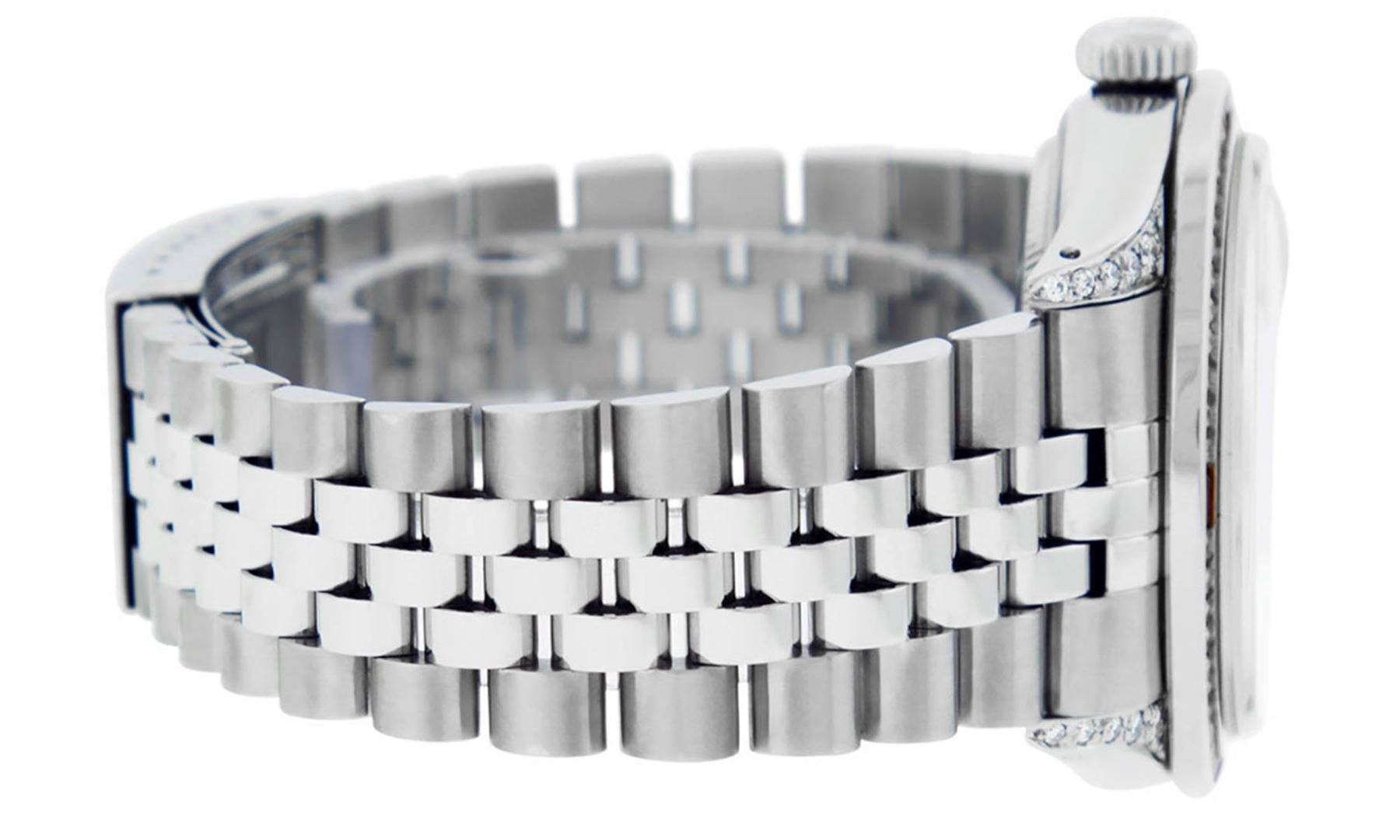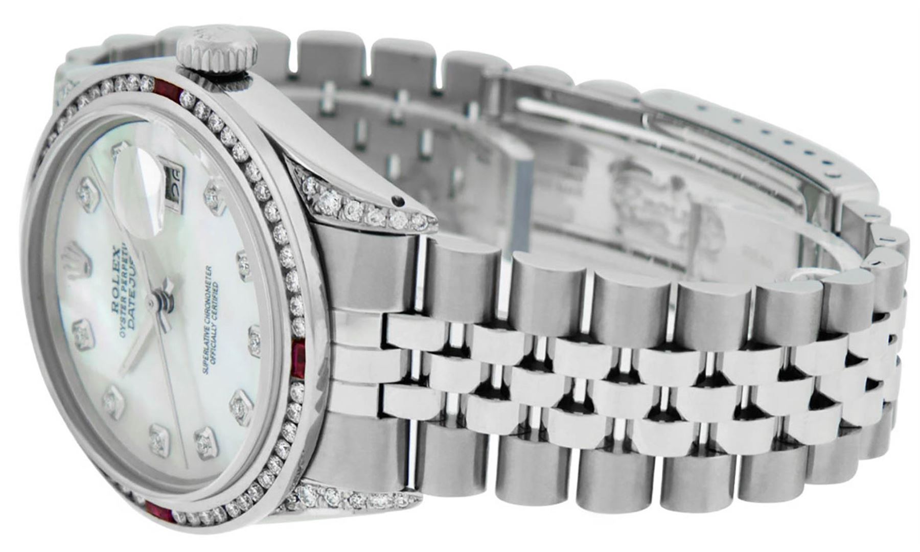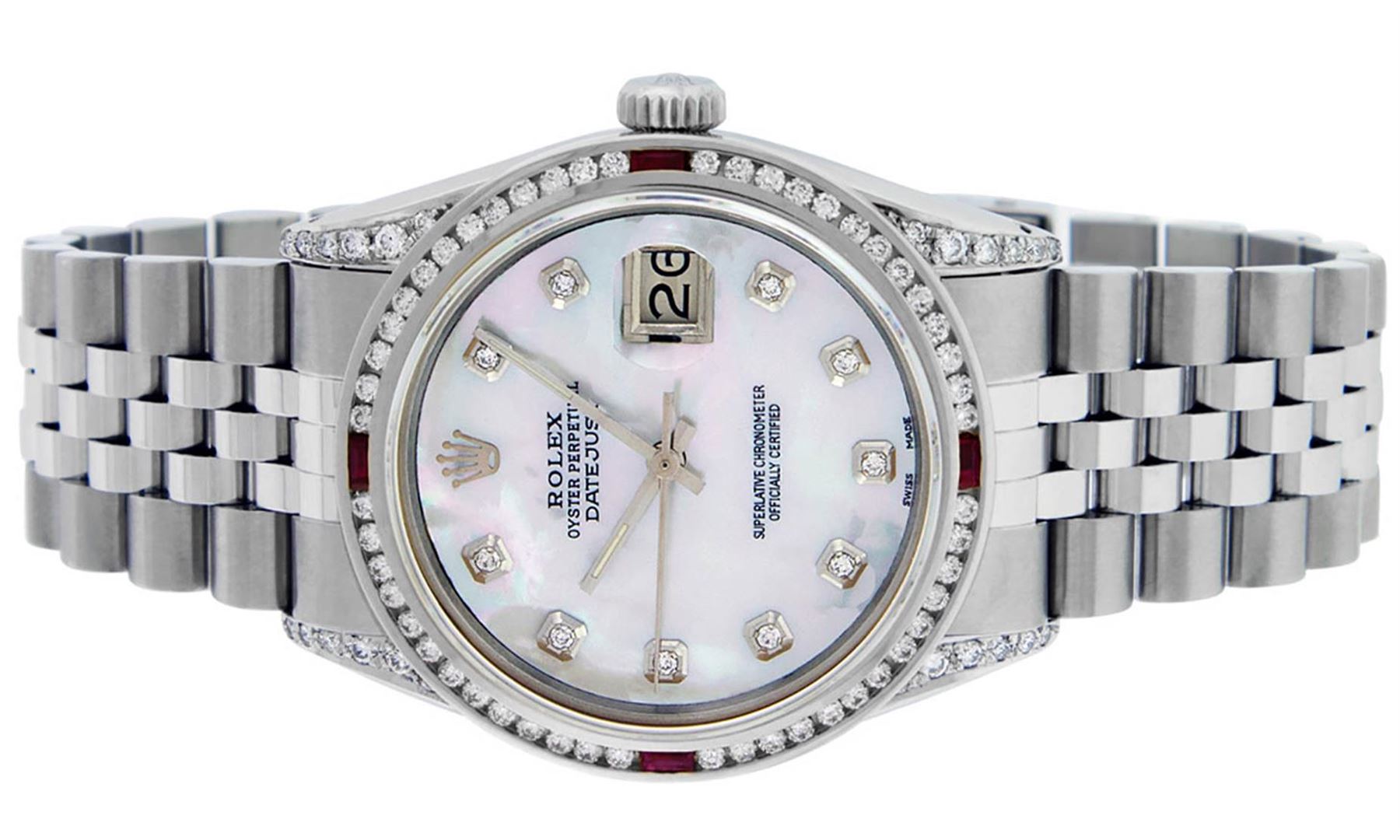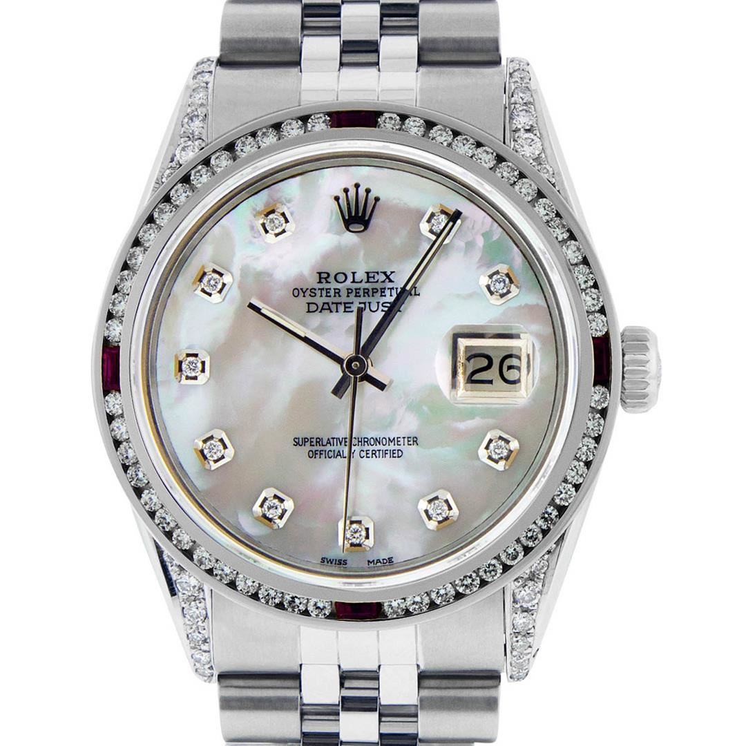 One Mens Rolex Datejust Polished Bright with Satin Finish, Serviced & Electronically Tested, Stainless Steel Case:36mm, Diamond Lugs: 24 Diamonds In Lugs, Color: G to H, Clarity: SI-VS. Stainless Steel Crown, Custom Bezel: 18K White Gold Channel Set Diamond + Ruby Bezel, Diamond Count: 52 Diamonds + 4 Rubies, Total Weight 1.30 Carat, Clarity: SI-VS, Color: G to H. Custom Crystal: Synthetic Sapphire Cyclops Lens. Custom Hands: New Luminecent Hands. Movement: Automatic Winding Movement Caliber 3035. Custom Dial: Mother Of Pearl Diamond Dial, Diamond Color: G To H In Color, Clarity: SI-VS. Date Window: 3 O'Clock Position Date Display, Quickset, Model: Datejust Condition: G-6 Extra Fine. Bracelet: Stainless Steel Jubilee. Bright Polish & Satin Finish. 7.0 Inch Length, Adjustable. Standard Clasp, With Rolex Logo. This watch has been serviced and polished and its free of all dents and scratches and has been time tested.