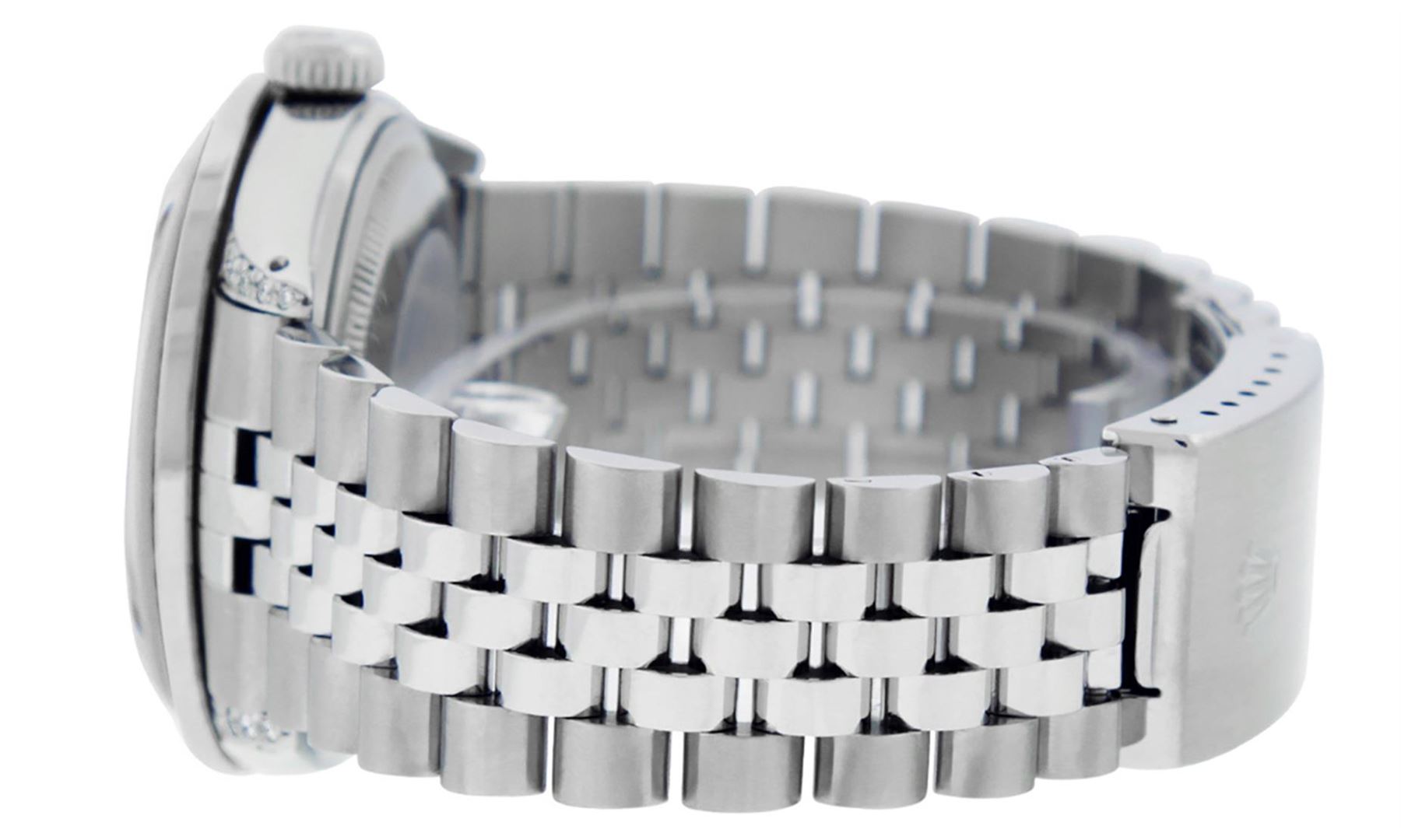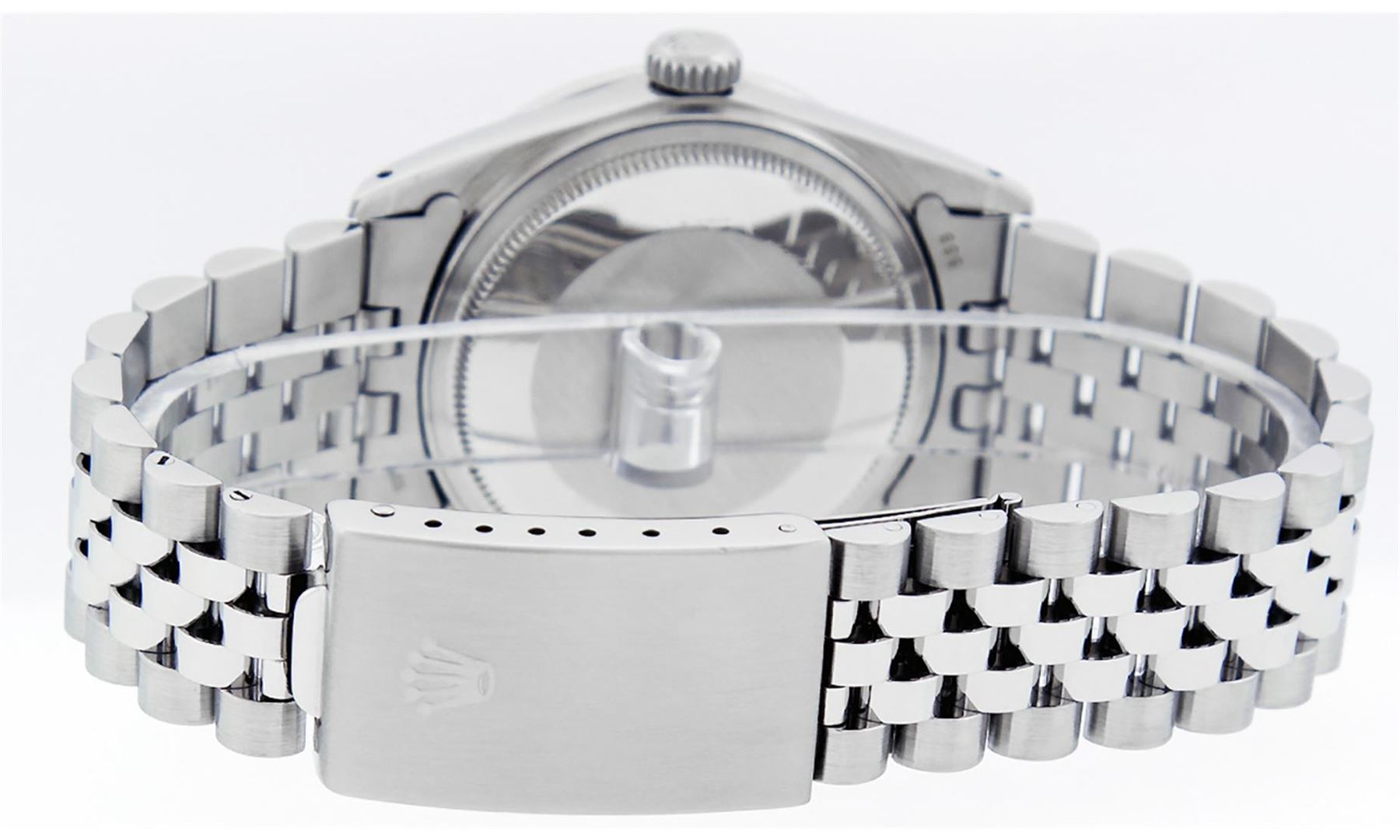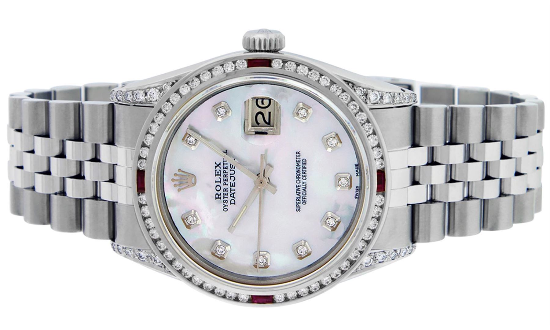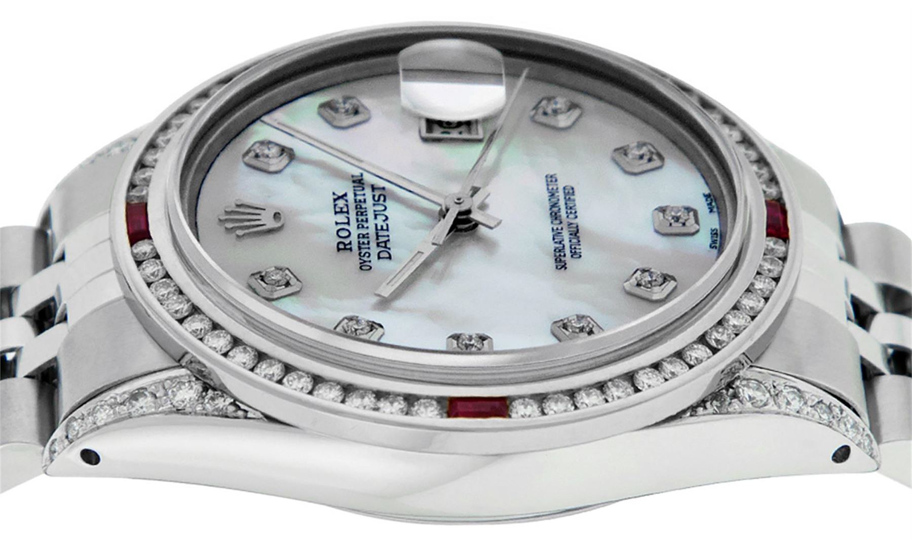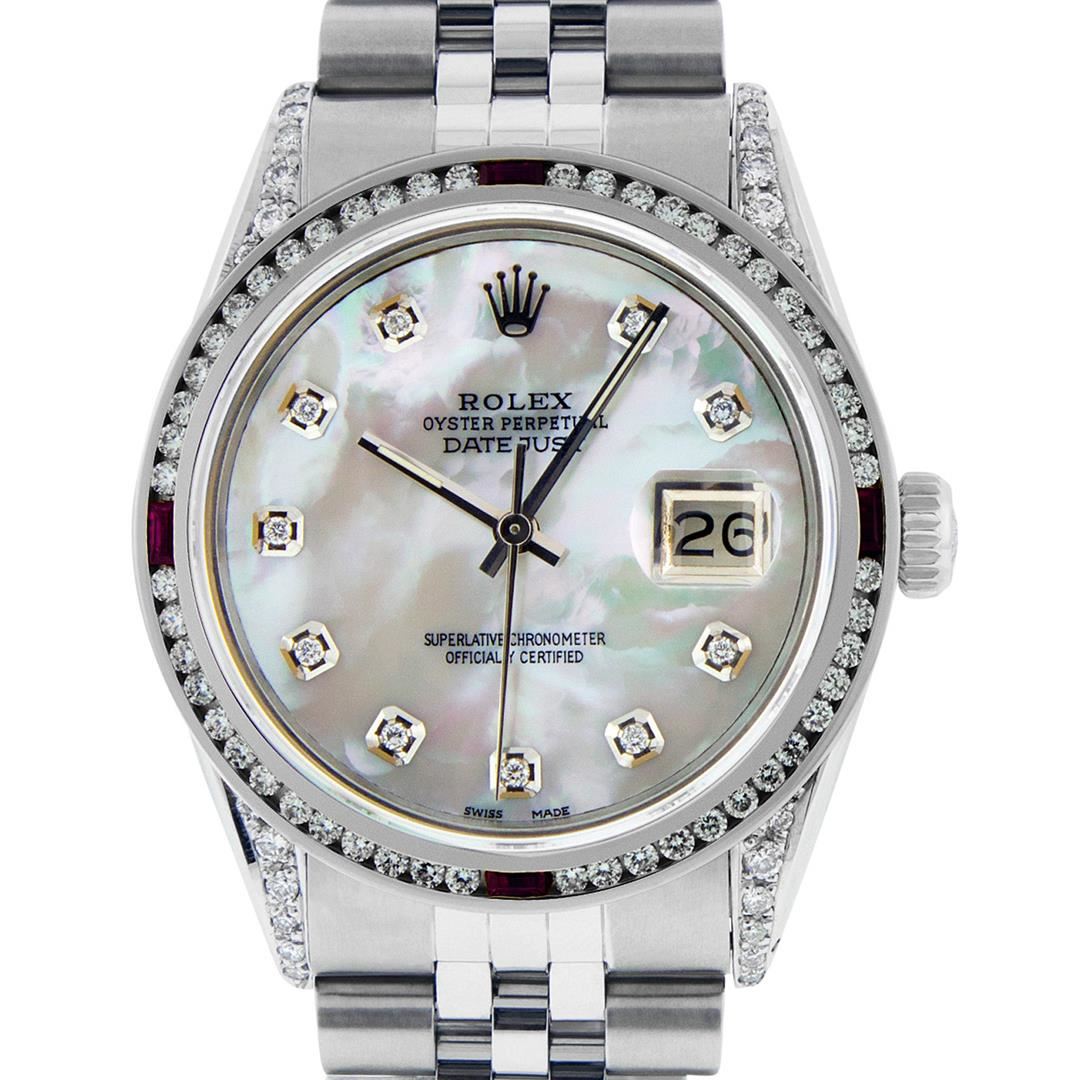 One Mens Rolex Datejust Polished Bright with Satin Finish, Serviced & Electronically Tested, Stainless Steel Case:36mm, Diamond Lugs: 24 Diamonds In Lugs, Color: G to H, Clarity: SI-VS. Stainless Steel Crown, Custom Bezel: 18K White Gold Channel Set Diamond + Ruby Bezel, Diamond Count: 52 Diamonds + 4 Rubies, Total Weight 1.30 Carat, Clarity: SI-VS, Color: G to H. Custom Crystal: Synthetic Sapphire Cyclops Lens. Custom Hands: New Luminescent Hands. Movement: Automatic Winding Movement Caliber 3035. Custom Dial: Mother Of Pearl Diamond Dial, Diamond Color: G To H In Color, Clarity: SI-VS. Date Window: 3 O'Clock Position Date Display, Quickset, Model: Datejust Condition: G-6 Extra Fine. Bracelet: Stainless Steel Jubilee. Bright Polish & Satin Finish. 7.0 Inch Length, Adjustable. Standard Clasp, With Rolex Logo. This watch has been serviced and polished and its free of all dents and scratches and has been time tested.