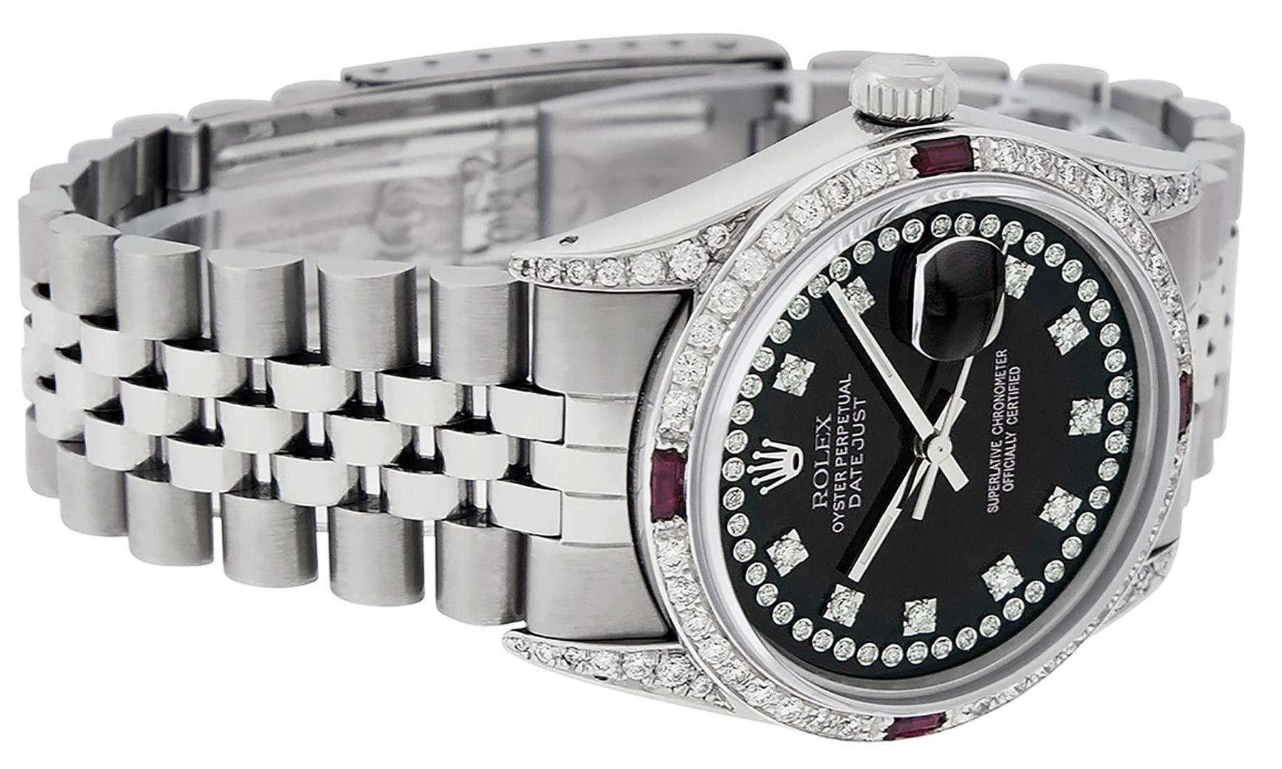 One Mens Rolex Datejust Polished Bright with Satin Finish, Serviced & Electronically Tested, Stainless Steel Case: 36mm, Custom Diamond Lugs: 28 Diamonds In Lugs, Color: G to H, Clarity: SI-VS. Stainless Steel Crown, Custom Bezel: 18K White Gold Diamond + Ruby Beadset, Diamond Count: 36 Diamonds + 4 Rubies, Total Weight 1.00 Carat, Clarity: SI-VS, Color: G to H. Custom Crystal: New Scratch Resistant Synthetic Sapphire Cyclops Lens. Custom Hands: New Luminescent Hands. Movement: Automatic Winding Movement Caliber 3035. Custom Dial: Black String Diamond Dial, Stone Count: 58 Diamonds In Dial, Diamond Color: G To H In Color, Clarity: VS. Date Window: 3 O'Clock Position Date Display, Quickset, Model: Datejust Condition: G-6 Extra Fine. Bracelet: Stainless Steel Jubilee Band. Bright Polish & Satin Finish. 7.0 Inch Length, Adjustable. Standard Clasp, With Rolex Logo. This Watch Has Been Serviced And Polished And Its Free Of All Dents And Scratches.