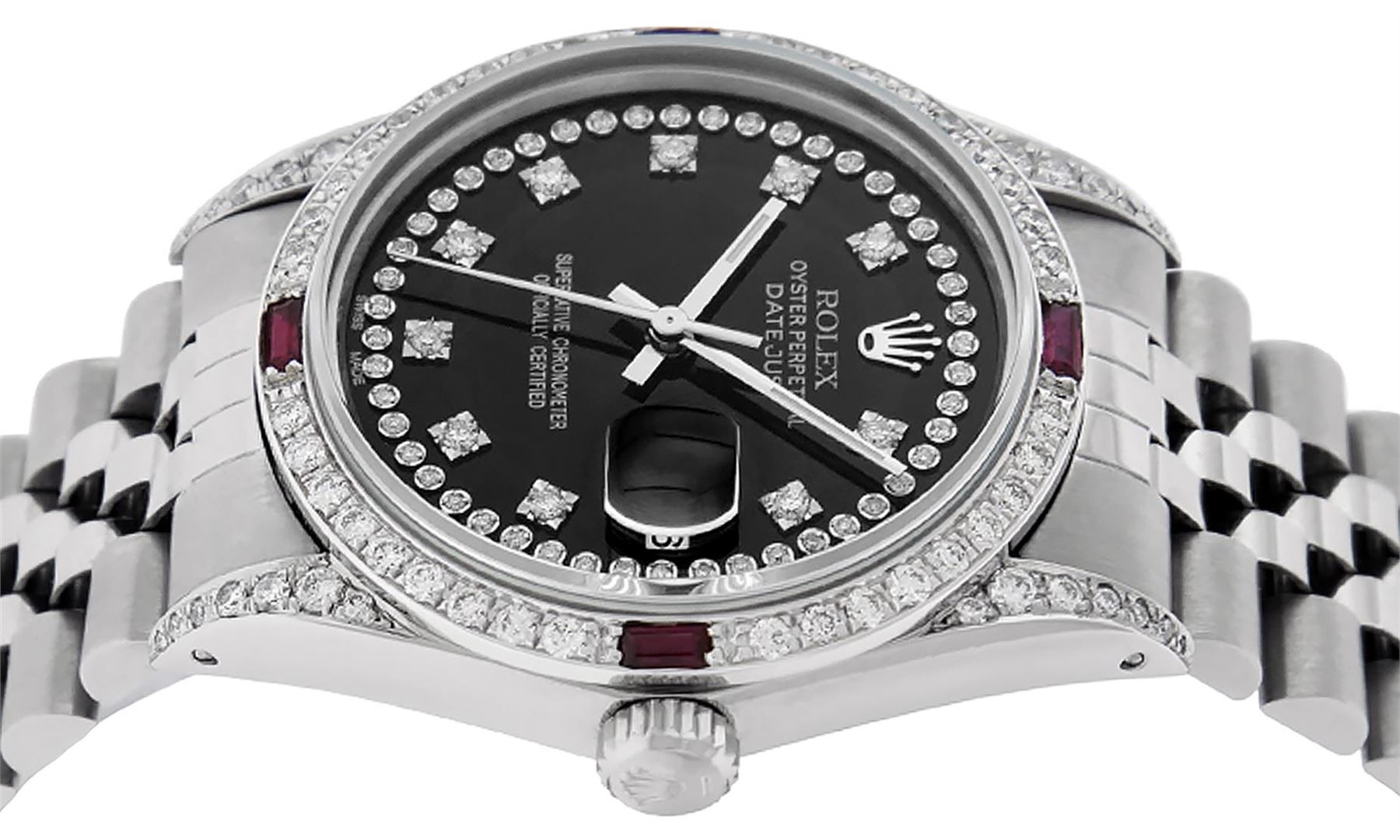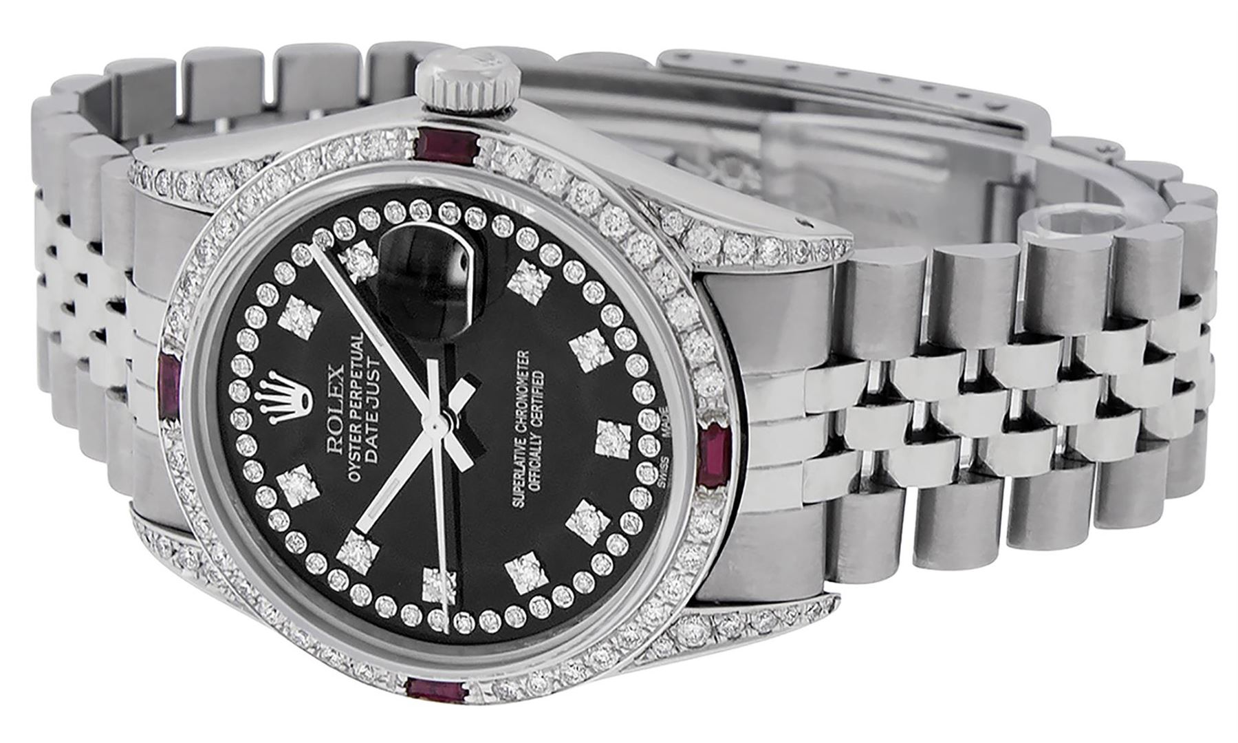 One Mens Rolex Datejust Polished Bright with Satin Finish, Serviced & Electronically Tested, Stainless Steel Case: 36mm, Custom Diamond Lugs: 28 Diamonds In Lugs, Color: G to H, Clarity: SI-VS. Stainless Steel Crown, Custom Bezel: 18K White Gold Diamond + Ruby Beadset, Diamond Count: 36 Diamonds + 4 Rubies, Total Weight 1.00 Carat, Clarity: SI-VS, Color: G to H. Custom Crystal: New Scratch Resistant Synthetic Sapphire Cyclops Lens. Custom Hands: New Luminescent Hands. Movement: Automatic Winding Movement Caliber 3035. Custom Dial: Black String Diamond Dial, Stone Count: 58 Diamonds In Dial, Diamond Color: G To H In Color, Clarity: VS. Date Window: 3 O'Clock Position Date Display, Quickset, Model: Datejust Condition: G-6 Extra Fine. Bracelet: Stainless Steel Jubilee Band. Bright Polish & Satin Finish. 7.0 Inch Length, Adjustable. Standard Clasp, With Rolex Logo. This Watch Has Been Serviced And Polished And Its Free Of All Dents And Scratches.