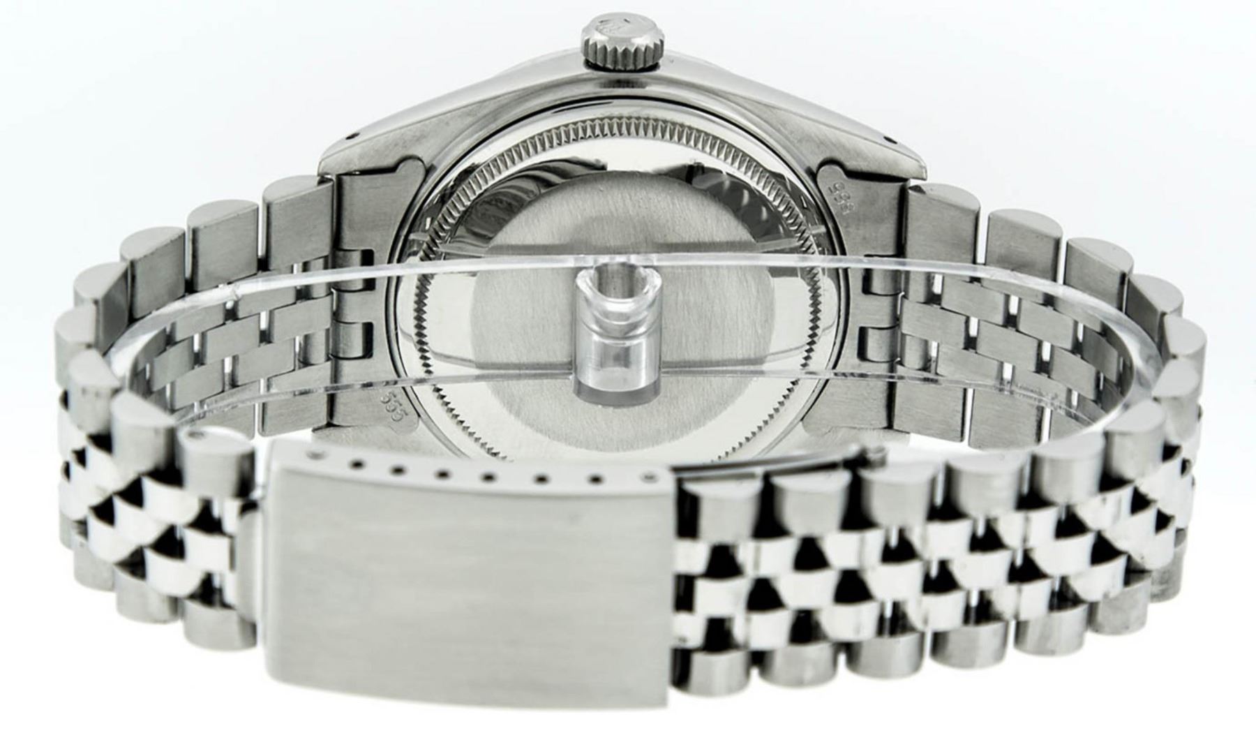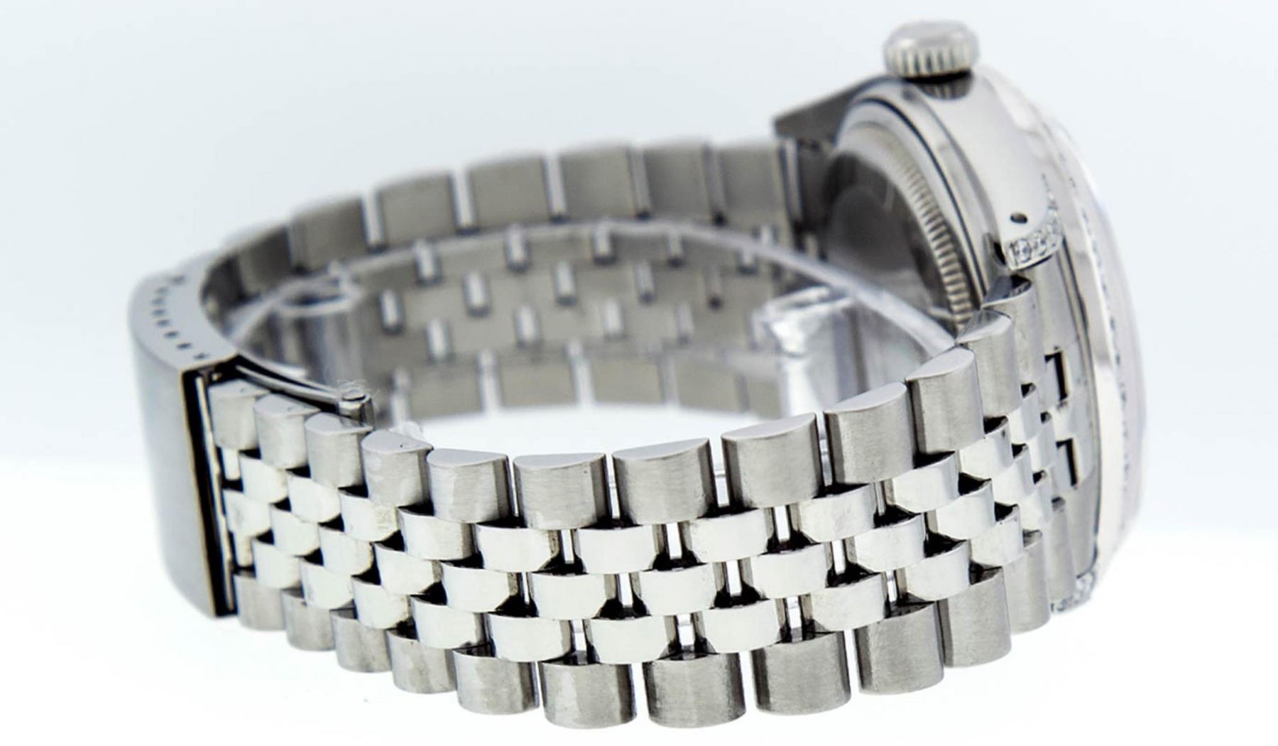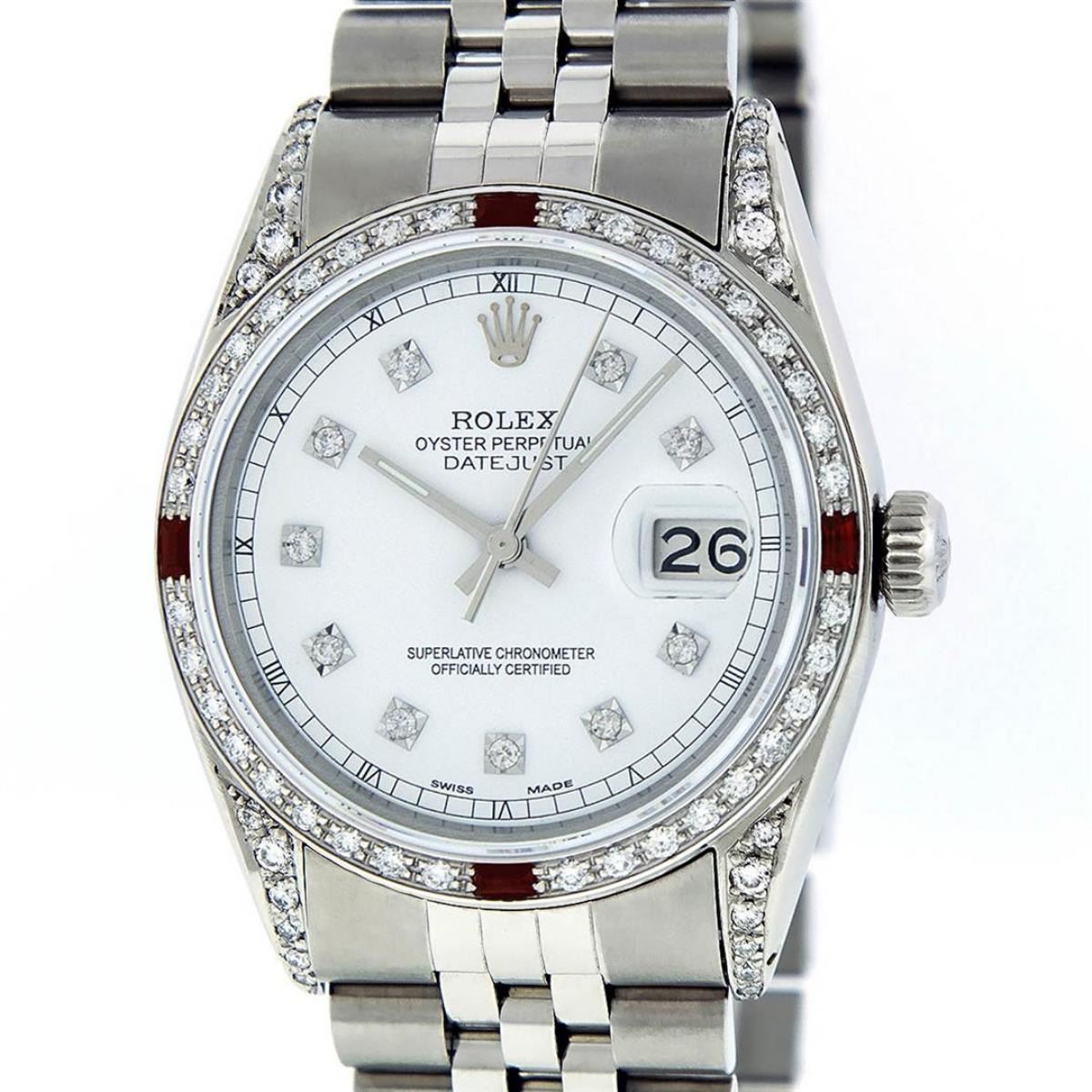 One Mens Rolex Datejust Polished Bright with Satin Finish, Serviced & Electronically Tested, Stainless Steel Case: 36mm, Custom Diamond Lugs: 28 Diamonds In Lugs, Color: G to H, Clarity: SI-VS. Stainless Steel Crown, Custom Bezel: 18K White Gold Diamond + Ruby Beadset, Diamond Count: 36 Diamonds + 4 Rubies, Total Weight 1.00 Carat, Clarity: SI-VS, Color: G to H. Custom Crystal: New Synthetic Sapphire Cyclops Lens. Custom Hands: New Luminescent Hands. Movement: Automatic Winding Movement Caliber 3035. Custom Dial: White Diamond Dial With Sqaure Roman Track, Diamond Color: G To H In Color, Clarity: SI-VS. Date Window: 3 O'Clock Position Date Display, Quickset, Model: Datejust Condition: G-6 Extra Fine. Bracelet: Stainless Steel Jubilee Band. Bright Polish & Satin Finish. 7.0 Inch Length, Adjustable. Standard Clasp, With Rolex Logo. This Watch Has Been Serviced And Polished And Its Free Of All Dents And Scratches.