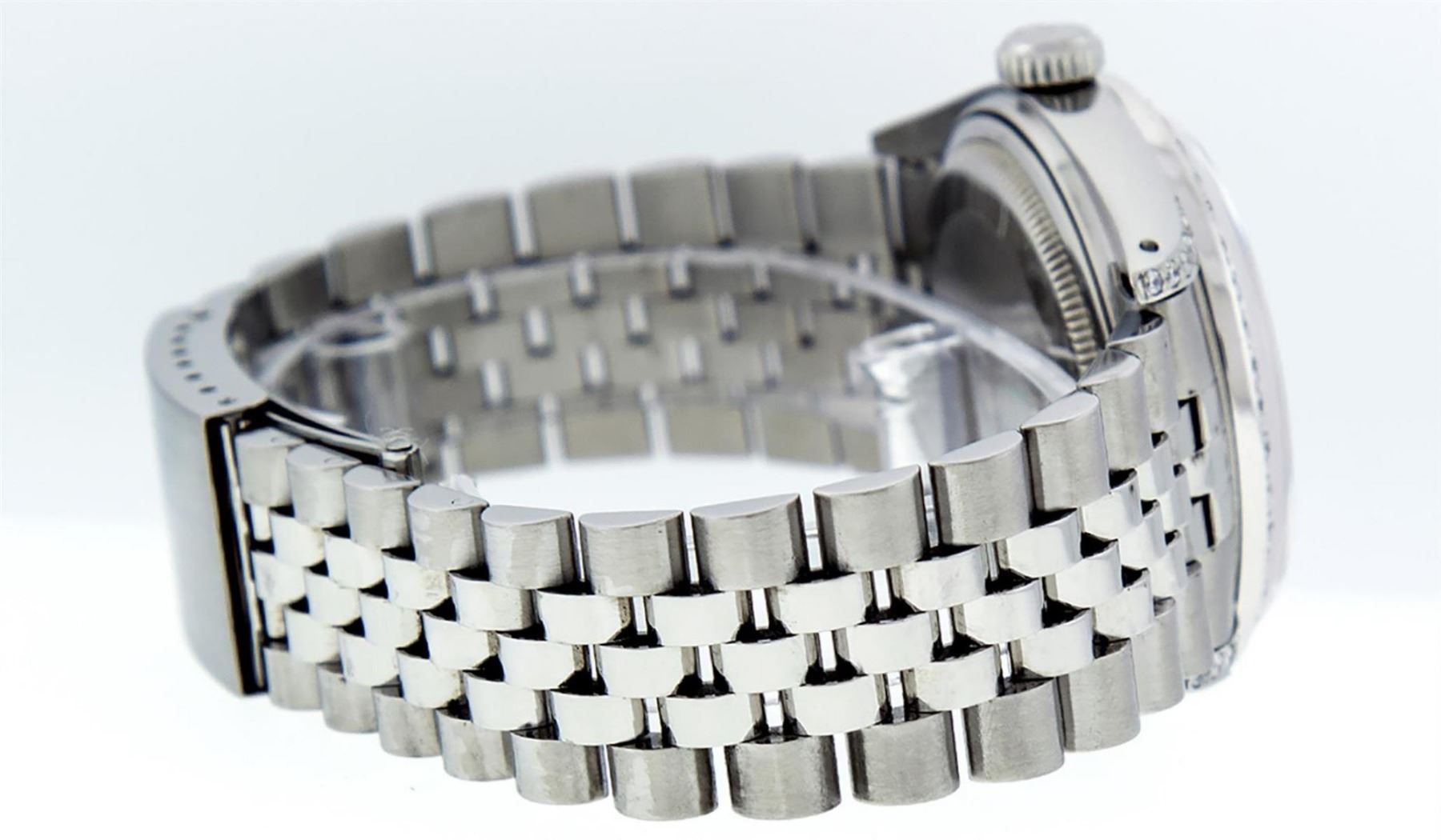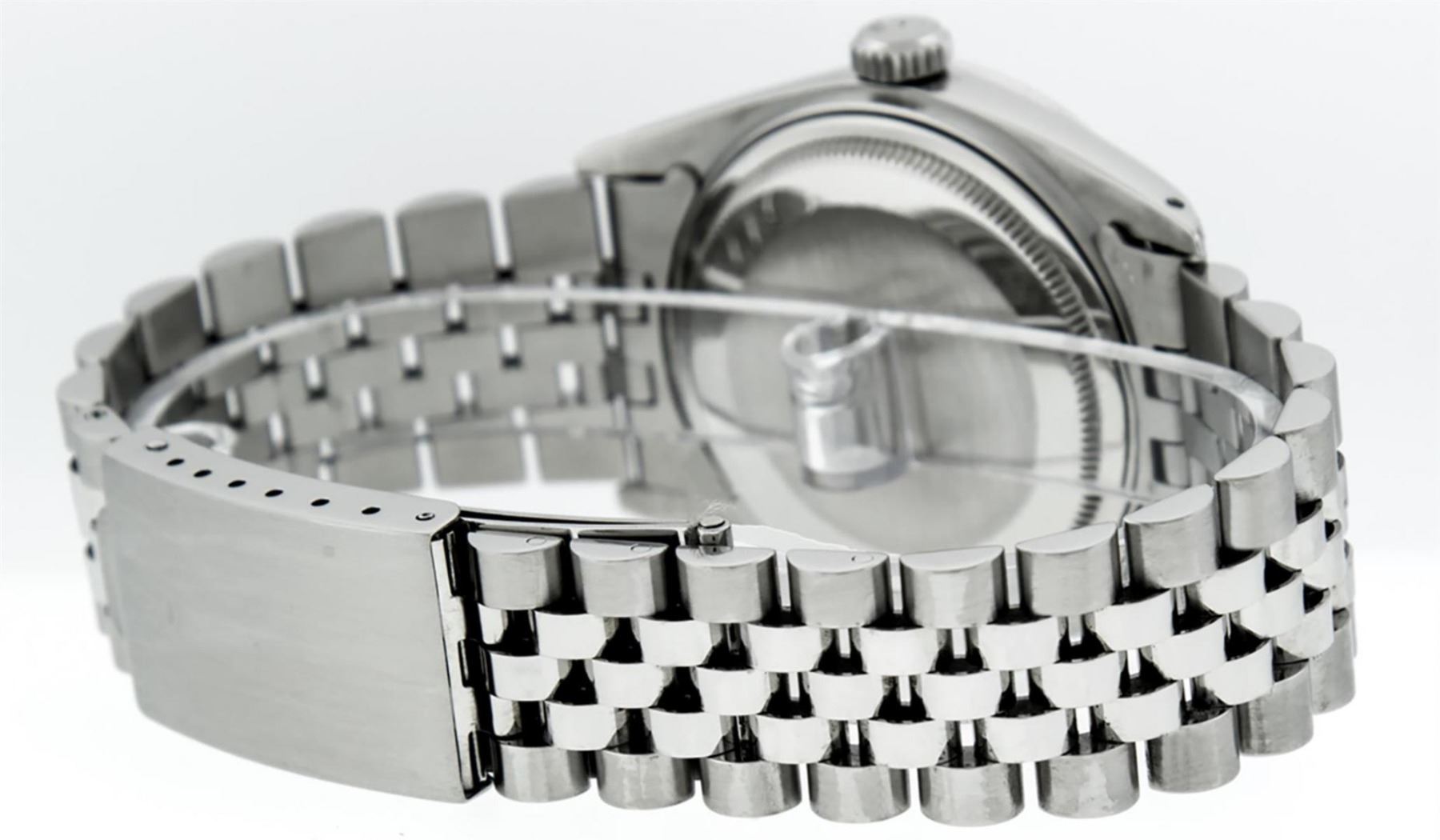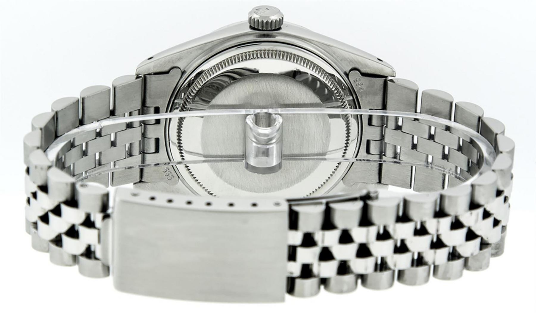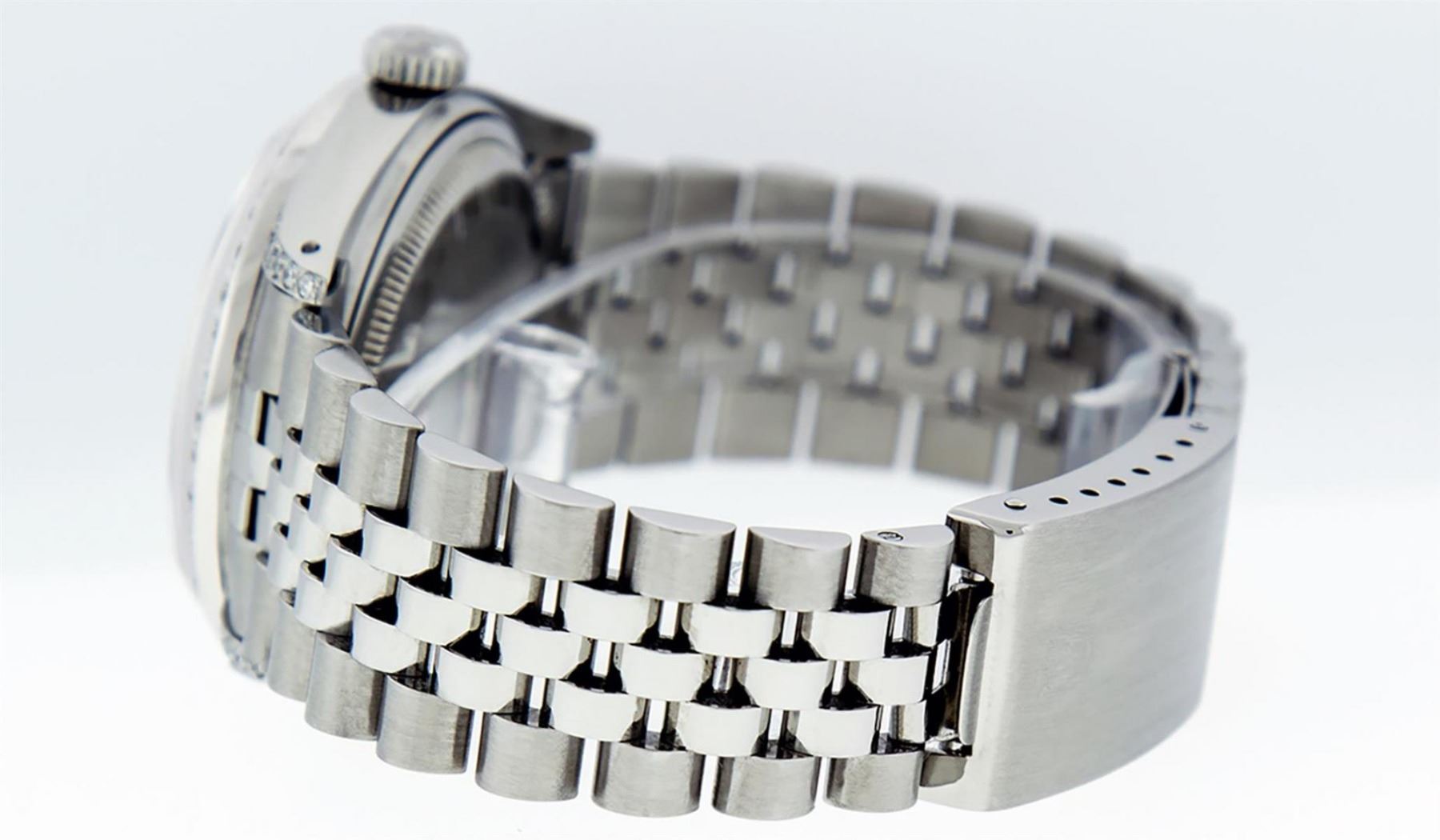 One Mens Rolex Datejust Polished Bright with Satin Finish, Serviced & Electronically Tested, Stainless Steel Case: 36mm, Custom Diamond Lugs: 28 Diamonds In Lugs, Color: G to H, Clarity: SI-VS. Stainless Steel Crown, Custom Bezel: 18K White Gold Diamond + Ruby Beadset, Diamond Count: 36 Diamonds + 4 Rubies, Total Weight 1.00 Carat, Clarity: SI-VS, Color: G to H. Custom Crystal: New Synthetic Sapphire Cyclops Lens. Custom Hands: New Luminescent Hands. Movement: Automatic Winding Movement.. Custom Dial: White Diamond Dial With Sqaure Roman Track, Diamond Color: G To H In Color, Clarity: SI-VS. Date Window: 3 O'Clock Position Date Display, Quickset, Model: Datejust Condition: G-6 Extra Fine. Bracelet: Stainless Steel Jubilee Band. Bright Polish & Satin Finish. 7.0 Inch Length, Adjustable. Standard Clasp, With Rolex Logo. This Watch Has Been Serviced And Polished And Its Free Of All Dents And Scratches.
